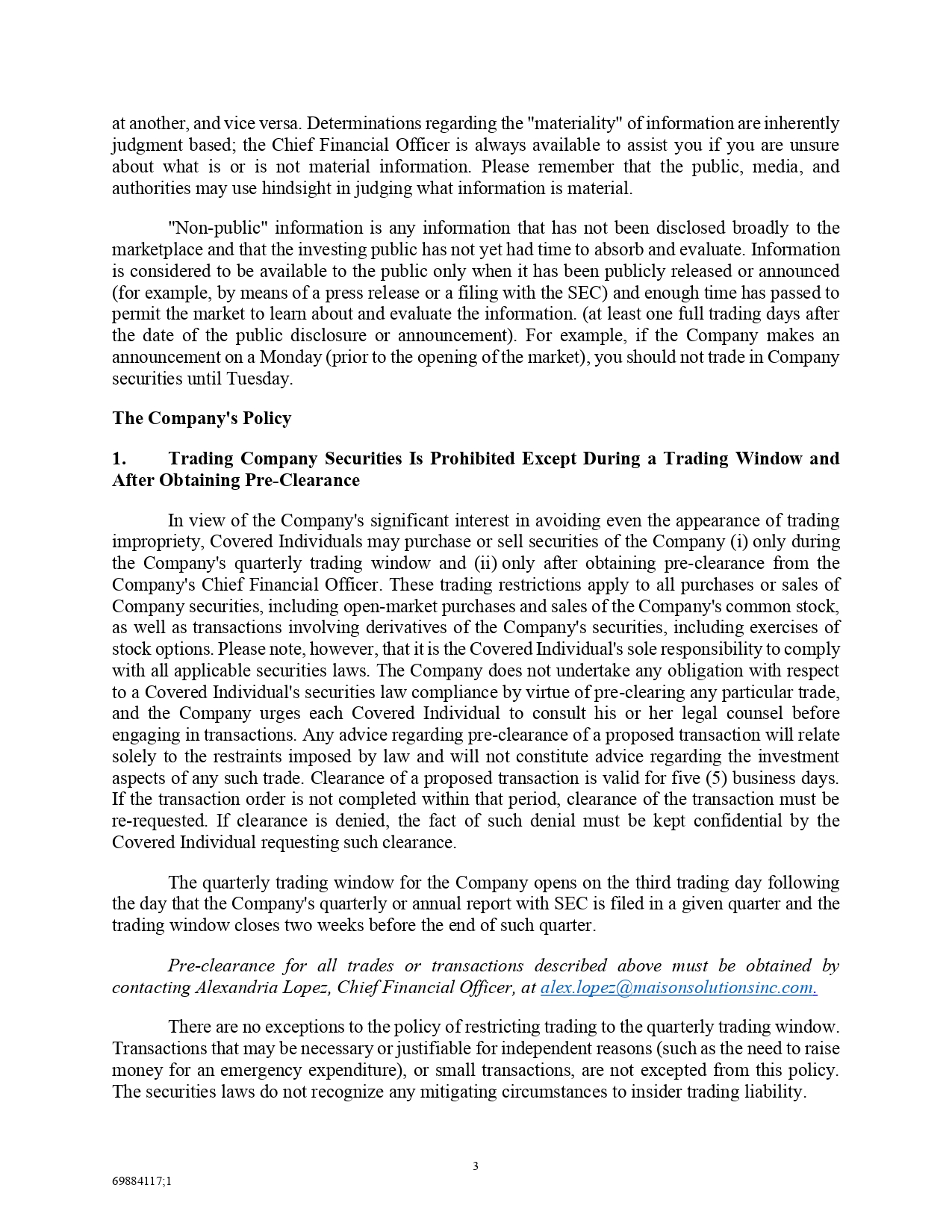 Information that is material at one point and time may cease to be material 2 69884117;1 at another, and vice versa . Determinations regarding the "materiality" of information are inherently judgment based ; the Chief Financial Officer is always available to assist you if you are unsure about what is or is not material information . Please remember that the public, media, and authorities may use hindsight in judging what information is material . "Non - public" information is any information that has not been disclosed broadly to the marketplace and that the investing public has not yet had time to absorb and evaluate . Information is considered to be available to the public only when it has been publicly released or announced (for example, by means of a press release or a filing with the SEC) and enough time has passed to permit the market to learn about and evaluate the information . (at least one full trading days after the date of the public disclosure or announcement) . For example, if the Company makes an announcement on a Monday (prior to the opening of the market), you should not trade in Company securities until Tuesday . The Company's Policy 1. Trading Company Securities Is Prohibited Except During a Trading Window and After Obtaining Pre - Clearance In view of the Company's significant interest in avoiding even the appearance of trading impropriety, Covered Individuals may purchase or sell securities of the Company (i) only during the Company's quarterly trading window and (ii) only after obtaining pre - clearance from the Company's Chief Financial Officer . These trading restrictions apply to all purchases or sales of Company securities, including open - market purchases and sales of the Company's common stock, as well as transactions involving derivatives of the Company's securities, including exercises of stock options . Please note, however, that it is the Covered Individual's sole responsibility to comply with all applicable securities laws . The Company does not undertake any obligation with respect to a Covered Individual's securities law compliance by virtue of pre - clearing any particular trade, and the Company urges each Covered Individual to consult his or her legal counsel before engaging in transactions . Any advice regarding pre - clearance of a proposed transaction will relate solely to the restraints imposed by law and will not constitute advice regarding the investment aspects of any such trade . Clearance of a proposed transaction is valid for five ( 5 ) business days . If the transaction order is not completed within that period, clearance of the transaction must be re - requested . If clearance is denied, the fact of such denial must be kept confidential by the Covered Individual requesting such clearance . The quarterly trading window for the Company opens on the third trading day following the day that the Company's quarterly or annual report with SEC is filed in a given quarter and the trading window closes two weeks before the end of such quarter . Pre - clearance for all trades or transactions described above must be obtained by contacting Alexandria Lopez, Chief Financial Officer, at alex . lopez@maisonsolutionsinc . com . There are no exceptions to the policy of restricting trading to the quarterly trading window . Transactions that may be necessary or justifiable for independent reasons (such as the need to raise money for an emergency expenditure), or small transactions, are not excepted from this policy . The securities laws do not recognize any mitigating circumstances to insider trading liability . 3 69884117;1 4 69884117;1 2.