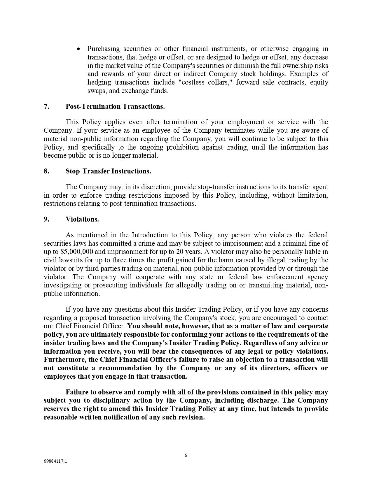 , selling securities that you do not own at the time of sale) ; and 6 69884117;1 Purchasing securities or other financial instruments, or otherwise engaging in transactions, that hedge or offset, or are designed to hedge or offset, any decrease in the market value of the Company's securities or diminish the full ownership risks and rewards of your direct or indirect Company stock holdings . Examples of hedging transactions include "costless collars," forward sale contracts, equity swaps, and exchange funds . 7. Post - Termination Transactions. This Policy applies even after termination of your employment or service with the Company . If your service as an employee of the Company terminates while you are aware of material non - public information regarding the Company, you will continue to be subject to this Policy, and specifically to the ongoing prohibition against trading, until the information has become public or is no longer material . 8. Stop - Transfer Instructions. The Company may, in its discretion, provide stop - transfer instructions to its transfer agent in order to enforce trading restrictions imposed by this Policy, including, without limitation, restrictions relating to post - termination transactions . 9. Violations. As mentioned in the Introduction to this Policy, any person who violates the federal securities laws has committed a crime and may be subject to imprisonment and a criminal fine of up to $ 5 , 000 , 000 and imprisonment for up to 20 years . A violator may also be personally liable in civil lawsuits for up to three times the profit gained for the harm caused by illegal trading by the violator or by third parties trading on material, non - public information provided by or through the violator . The Company will cooperate with any state or federal law enforcement agency investigating or prosecuting individuals for allegedly trading on or transmitting material, non - public information . If you have any questions about this Insider Trading Policy, or if you have any concerns regarding a proposed transaction involving the Company's stock, you are encouraged to contact our Chief Financial Officer . You should note, however, that as a matter of law and corporate policy, you are ultimately responsible for conforming your actions to the requirements of the insider trading laws and the Company's Insider Trading Policy . Regardless of any advice or information you receive, you will bear the consequences of any legal or policy violations . Furthermore, the Chief Financial Officer's failure to raise an objection to a transaction will not constitute a recommendation by the Company or any of its directors, officers or employees that you engage in that transaction . Failure to observe and comply with all of the provisions contained in this policy may subject you to disciplinary action by the Company, including discharge . The Company reserves the right to amend this Insider Trading Policy at any time, but intends to provide reasonable written notification of any such revision .