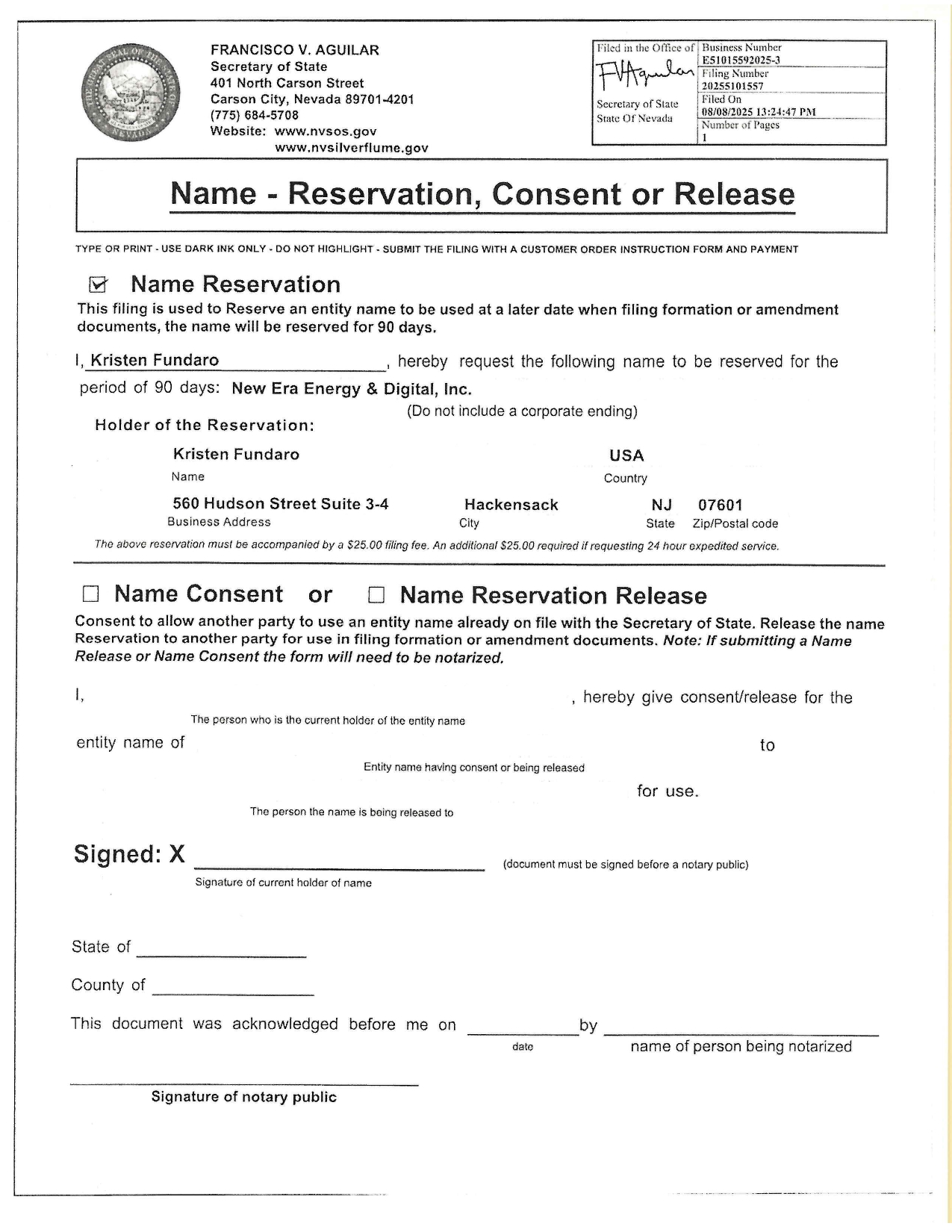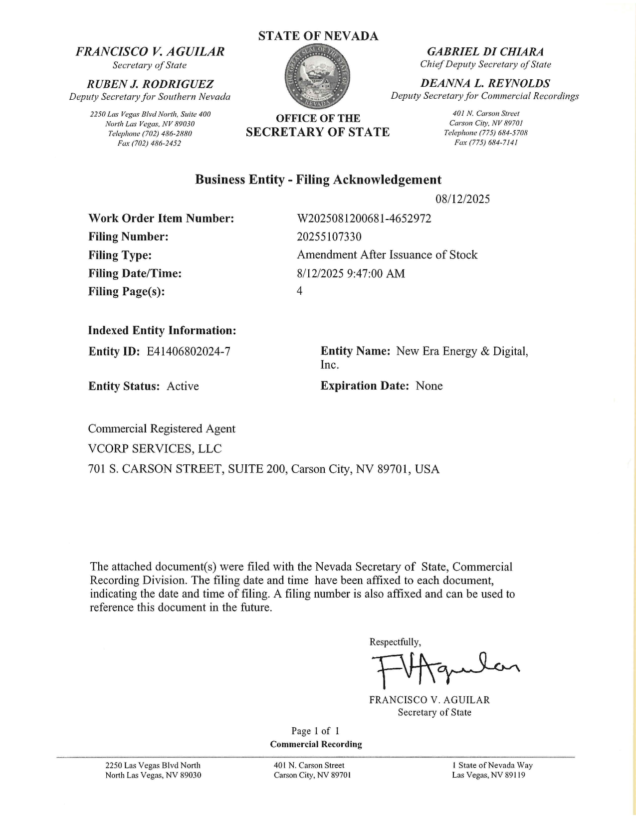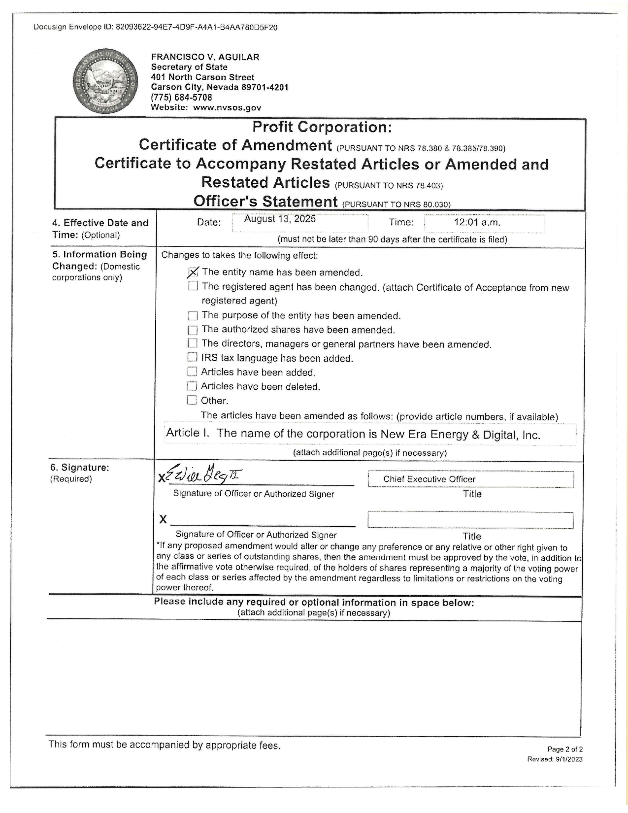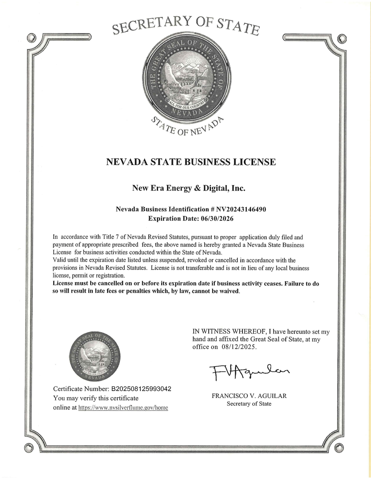 | 1. | I have reviewed this quarterly report on Form 10-Q of New Era Energy & Digital, Inc.; |