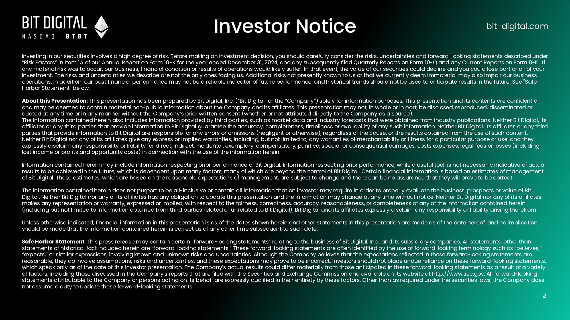 Before making an investment decision, you should carefully consider the risks, uncertainties and forward - looking statements described under “Risk Factors” in Item 1A of our Annual Report on Form 10 - K for the year ended December 31, 2024, and any subsequently filed Quarterly Reports on Form 10 - Q and any Current Reports on Form 8 - K. If any material risk was to occur, our business, financial condition or results of operations would likely suffer. In that event, the value of our securities could decline and you could lose part or all of your investment. The risks and uncertainties we describe are not the only ones facing us. Additional risks not presently known to us or that we currently deem immaterial may also impair our business operations. In addition, our past financial performance may not be a reliable indicator of future performance, and historical trends should not be used to anticipate results in the future. See "Safe Harbor Statement" below. About this Presentation: This presentation has been prepared by Bit Digital, Inc. (“Bit Digital” or the “Company”) solely for information purposes. This presentation and its contents are confidential and may be deemed to contain material non - public information about the Company and its affiliates. This presentation may not, in whole or in part, be disclosed, reproduced, disseminated or quoted at any time or in any manner without the Company’s prior written consent (whether or not attributed directly to the Company as a source). The information contained herein also includes information provided by third parties, such as market data and industry forecasts that were obtained from industry publications . Neither Bit Digital, its affiliates or any third parties that provide information to Bit Digital guarantee the accuracy, completeness, timeliness or availability of any such information . Neither Bit Digital, its affiliates or any third parties that provide information to Bit Digital are responsible for any errors or omissions (negligent or otherwise), regardless of the cause, or the results obtained from the use of such content . Neither Bit Digital nor any of its affiliates give any express or implied warranties, including, but not limited to, any warranties of merchantability or fitness for a particular purpose or use, and they expressly disclaim any responsibility or liability for direct, indirect, incidental, exemplary, compensatory, punitive, special or consequential damages, costs expenses, legal fees or losses (including lost income or profits and opportunity costs) in connection with the use of the information herein. Information contained herein may include information respecting prior performance of Bit Digital. Information respecting prior performance, while a useful tool, is not necessarily indicative of actual results to be achieved in the future, which is dependent upon many factors, many of which are beyond the control of Bit Digital. Certain financial information is based on estimates of management of Bit Digital. These estimates, which are based on the reasonable expectations of management, are subject to change and there can be no assurance that they will prove to be correct. The information contained herein does not purport to be all - inclusive or contain all information that an investor may require in order to properly evaluate the business, prospects or value of Bit Digital. Neither Bit Digital nor any of its affiliates has any obligation to update this presentation and the information may change at any time without notice. Neither Bit Digital nor any of its affiliates makes any representation or warranty, expressed or implied, with respect to the fairness, correctness, accuracy, reasonableness, or completeness of any of the information contained herein (including but not limited to information obtained from third parties related or unrelated to Bit Digital), Bit Digital and its affiliates expressly disclaim any responsibility or liability arising therefrom. Unless otherwise indicated, financial information in this presentation is as of the dates shown herein and other statements in this presentation are made as of the date hereof, and no implication should be made that the information contained herein is correct as of any other time subsequent to such date. Safe Harbor Statement : This press release may contain certain “forward - looking statements” relating to the business of Bit Digital, Inc., and its subsidiary companies. All statements, other than statements of historical fact included herein are “forward - looking statements.” These forward - looking statements are often identified by the use of forward - looking terminology such as “believes,” “expects,” or similar expressions, involving known and unknown risks and uncertainties. Although the Company believes that the expectations reflected in these forward - looking statements are reasonable, they do involve assumptions, risks and uncertainties, and these expectations may prove to be incorrect. Investors should not place undue reliance on these forward - looking statements, which speak only as of the date of this investor presentation. The Company’s actual results could differ materially from those anticipated in these forward - looking statements as a result of a variety of factors, including those discussed in the Company’s reports that are filed with the Securities and Exchange Commission and available on its website at http://www.sec.gov. All forward - looking statements attributable to the Company or persons acting on its behalf are expressly qualified in their entirety by these factors. Other than as required under the securities laws, the Company does not assume a duty to update these forward - looking statements.