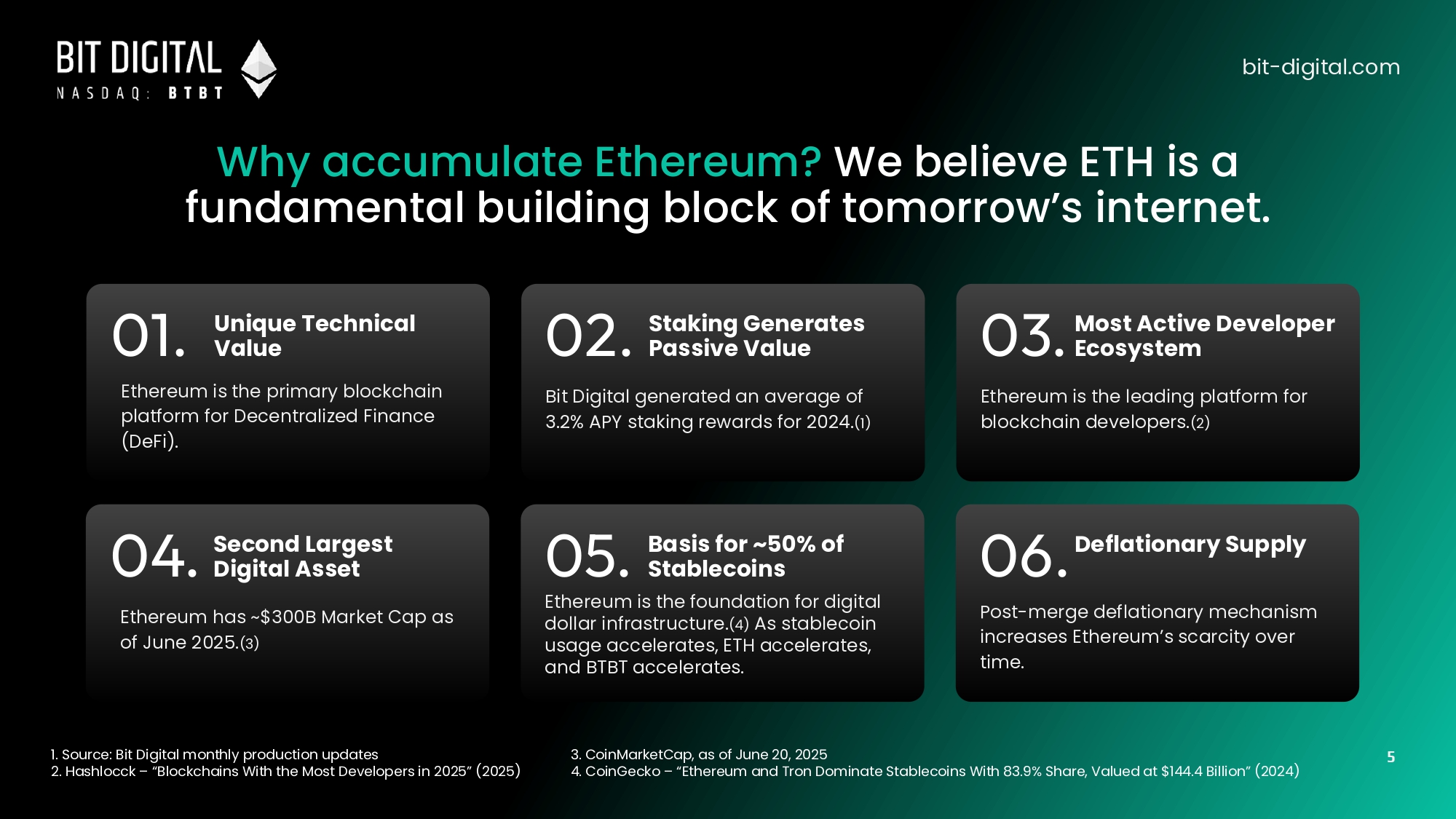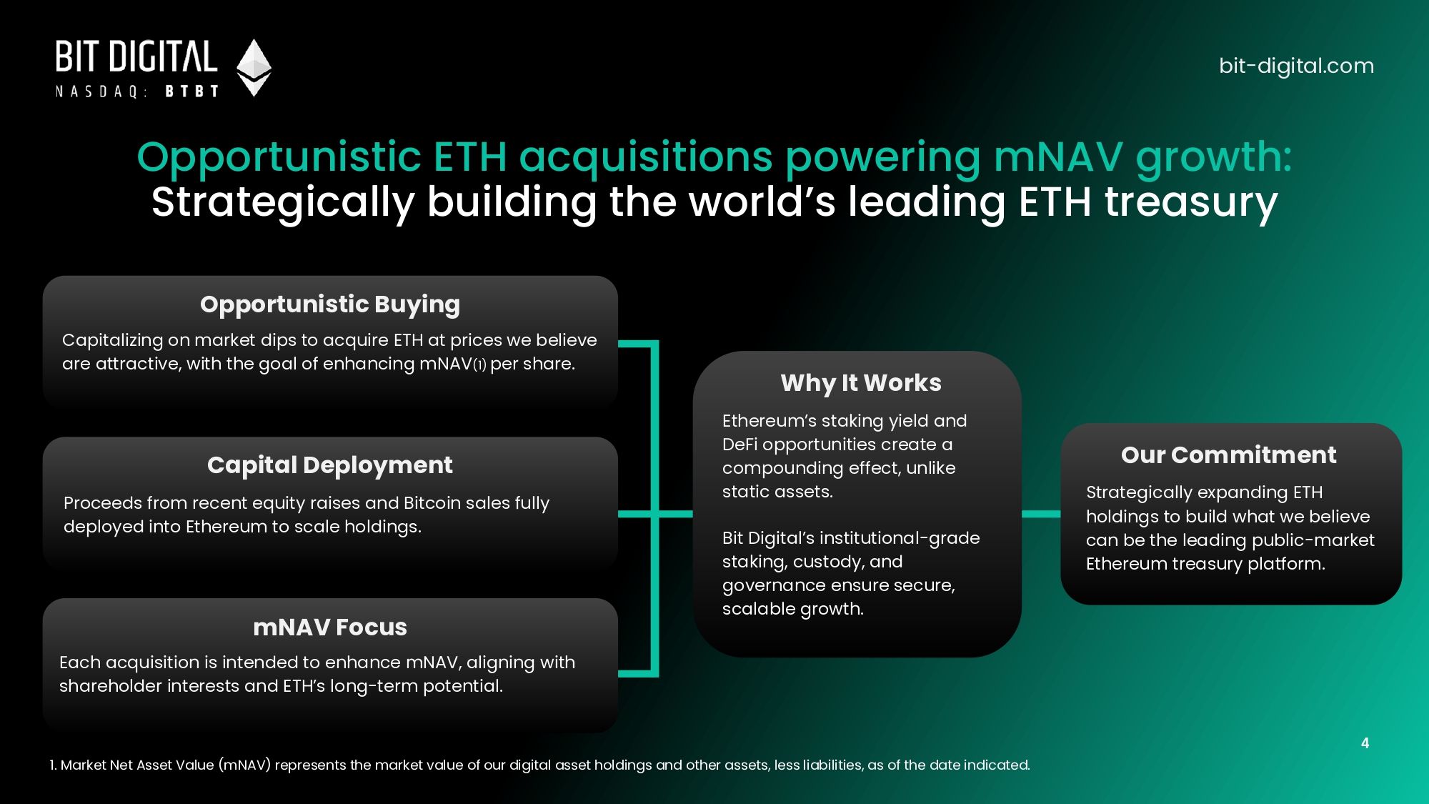 Investor Notice bit - digital.com 2 Pioneering the Ethereum Treasury Revolution: Bit Digital’s All - In Strategy for the Future of Finance bit - digital.com Why Ethereum? ● Programmable Powerhouse: Ethereum’s smart contracts and DeFi ecosystem are redefining global finance, offering unparalleled utility over traditional assets. ● Staking Yield Advantage: ETH staking delivers sustainable returns, fueling Bit Digital’s flywheel of growth (buy ETH, earn ETH, reinvest for more ETH). ● Institutional Momentum : Growing adoption by developers, businesses, and now public companies, like Bit Digital, position ETH as the backbone of the digital economy. Bit Digital’s Mission ● We’ve transformed our treasury, accumulating over 120,000 ETH to become one of the largest corporate ETH holders globally. ● Our mission: To lead as the preeminent ETH treasury platform, driving value through innovation and strategic growth.
