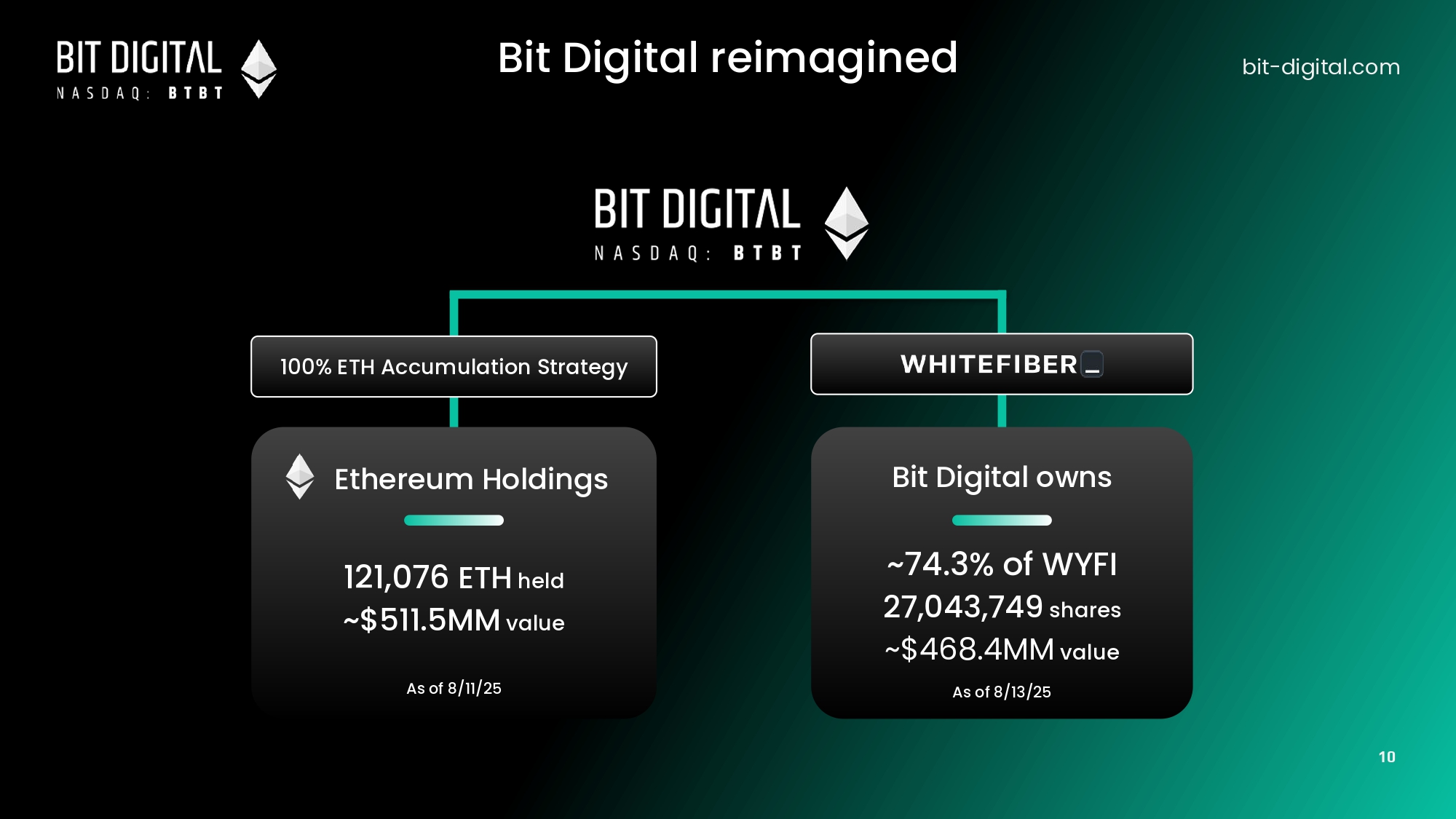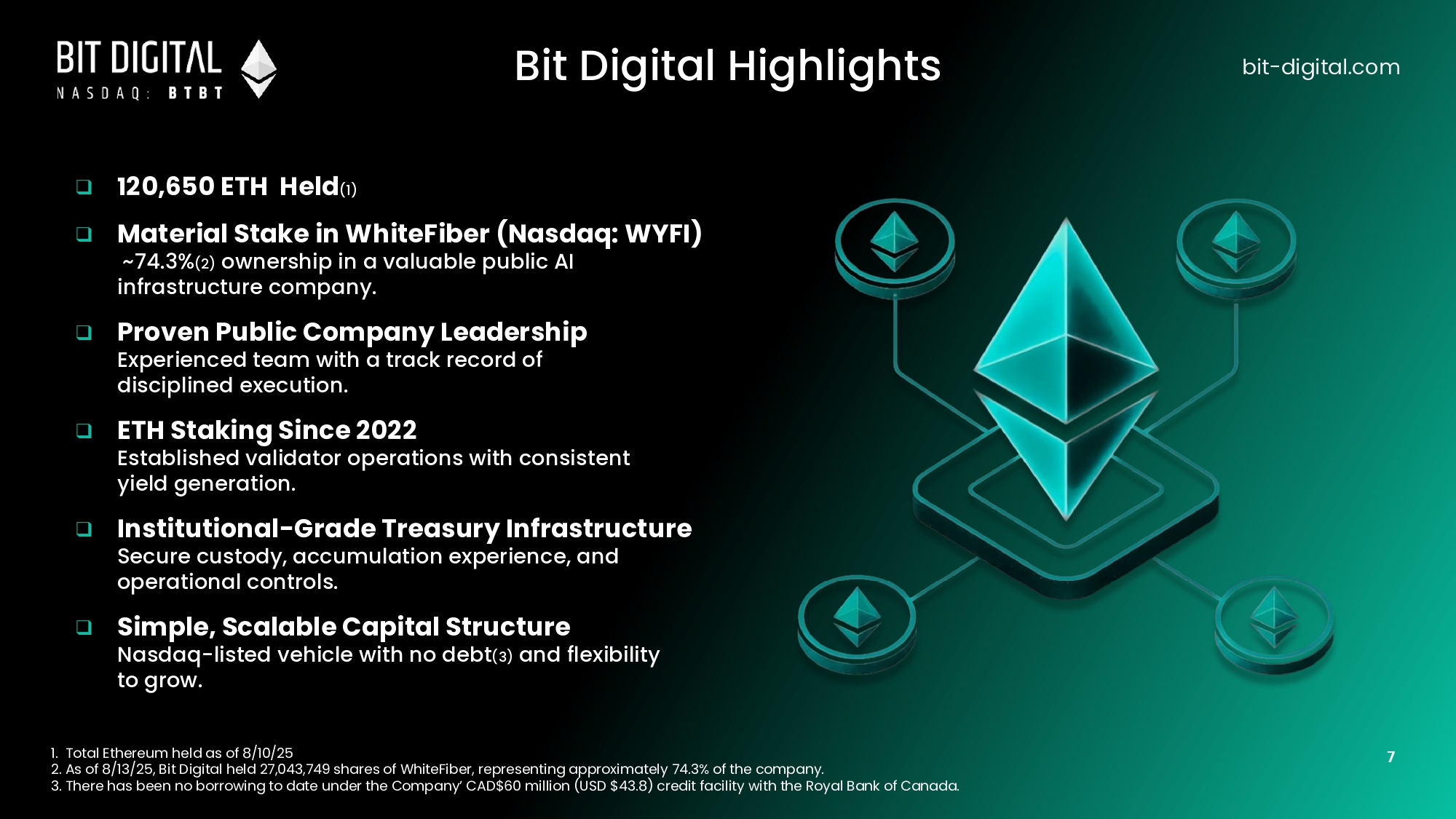 ❑ Proven Public Company Leadership Experienced team with a track record of disciplined execution. ❑ ETH Staking Since 2022 Established validator operations with consistent yield generation. ❑ Institutional - Grade Treasury Infrastructure Secure custody, accumulation experience, and operational controls. ❑ Simple, Scalable Capital Structure Nasdaq - listed vehicle with no debt (3) and flexibility to grow. bit - digital.com 1. Total Ethereum held as of 8/10/25 2. As of 8/13/25, Bit Digital held 27,043,749 shares of WhiteFiber, representing approximately 74.3% of the company. 3. There has been no borrowing to date under the Company’ CAD$60 million (USD $43.8) credit facility with the Royal Bank of Canada.