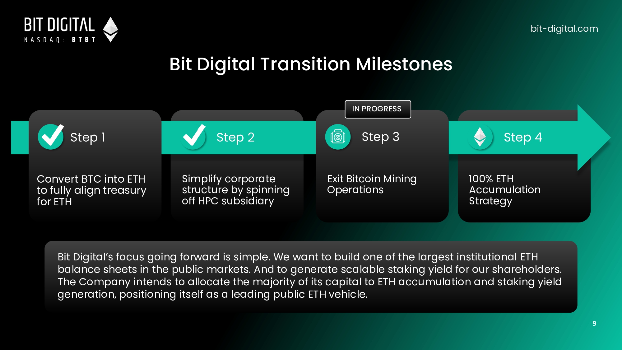 Bit Digital Transition Milestones bit - digital.com Step 1 Step 2 Convert BTC into ETH to fully align treasury for ETH Simplify corporate structure by spinning off HPC subsidiary Step 3 Exit Bitcoin Mining Operations Step 4 100% ETH Accumulation Strategy Bit Digital’s focus going forward is simple. We want to build one of the largest institutional ETH balance sheets in the public markets. And to generate scalable staking yield for our shareholders. The Company intends to allocate the majority of its capital to ETH accumulation and staking yield generation, positioning itself as a leading public ETH vehicle.