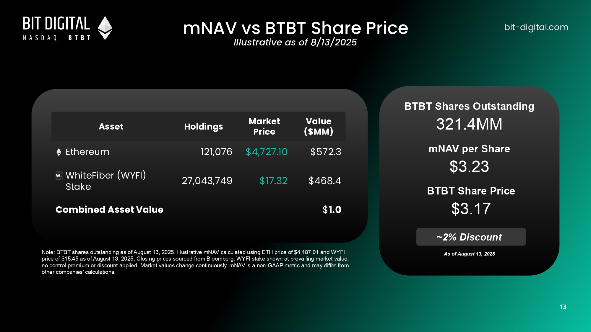 ETH Accumulation & Staking Acquire and hold ETH while actively participating in the network by staking it, earning native yield, supporting network security, and benefit from Ethereum’s long - term value appreciation and utility as a programmable, yield - generating asset. Deliberate and structured process for securing funding to support the company's growth, operations, and strategic initiatives. Transparent Reporting Sharing accurate, timely, and comprehensive information about the company’s operations, financials, and strategic activities . 12 mNAV vs BTBT Share Price Illustrative as of 8/13/2025 bit - digital.com Asset Holdings Market Price Value ($MM) 121,076 $4,727.10 $572.3 27,043,749 $17.32 $468.4 Ethereum WhiteFiber (WYFI) Stake Combined Asset Value $ 1.0 Note: BTBT shares outstanding as of August 13, 2025.