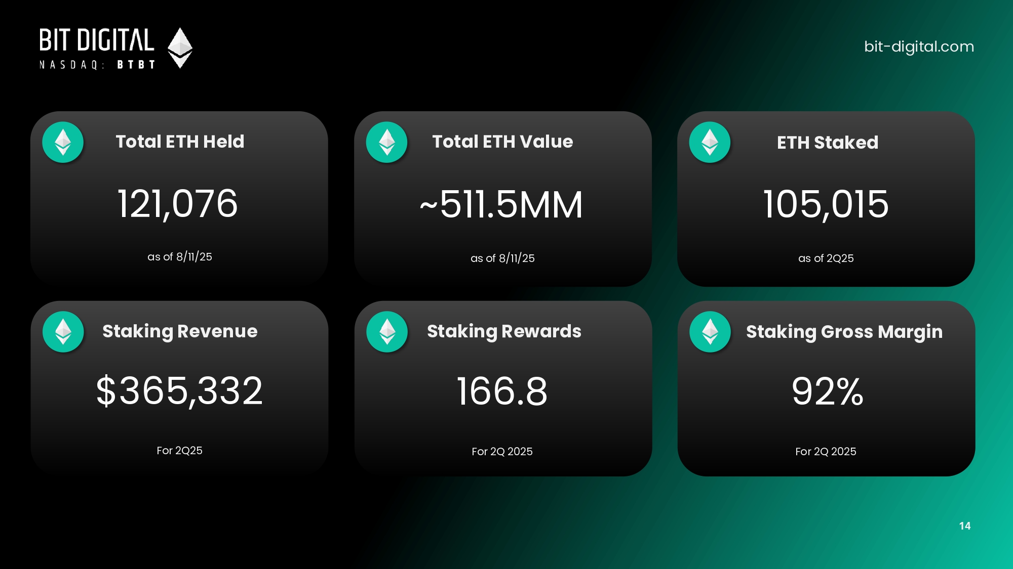 Illustrative mNAV calculated using ETH price of $4,487.01 and WYFI price of $15.45 as of August 13, 2025. Closing prices sourced from Bloomberg. WYFI stake shown at prevailing market value; no control premium or discount applied. Market values change continuously. mNAV is a non - GAAP metric and may differ from other companies’ calculations. 13 BTBT Shares Outstanding 321.4MM mNAV per Share $3.23 BTBT Share Price $3.17 ~2% Discount As of August 13, 2025 bit - digital.com Total ETH Held Total ETH Value ETH Staked Staking Revenue $365,332 For 2Q25 Staking Rewards 166.8 For 2Q 2025 Staking Gross Margin 92% For 2Q 2025 121,076 as of 8/11/25 ~511.5MM as of 8/11/25 105,015 as of 2Q25 14