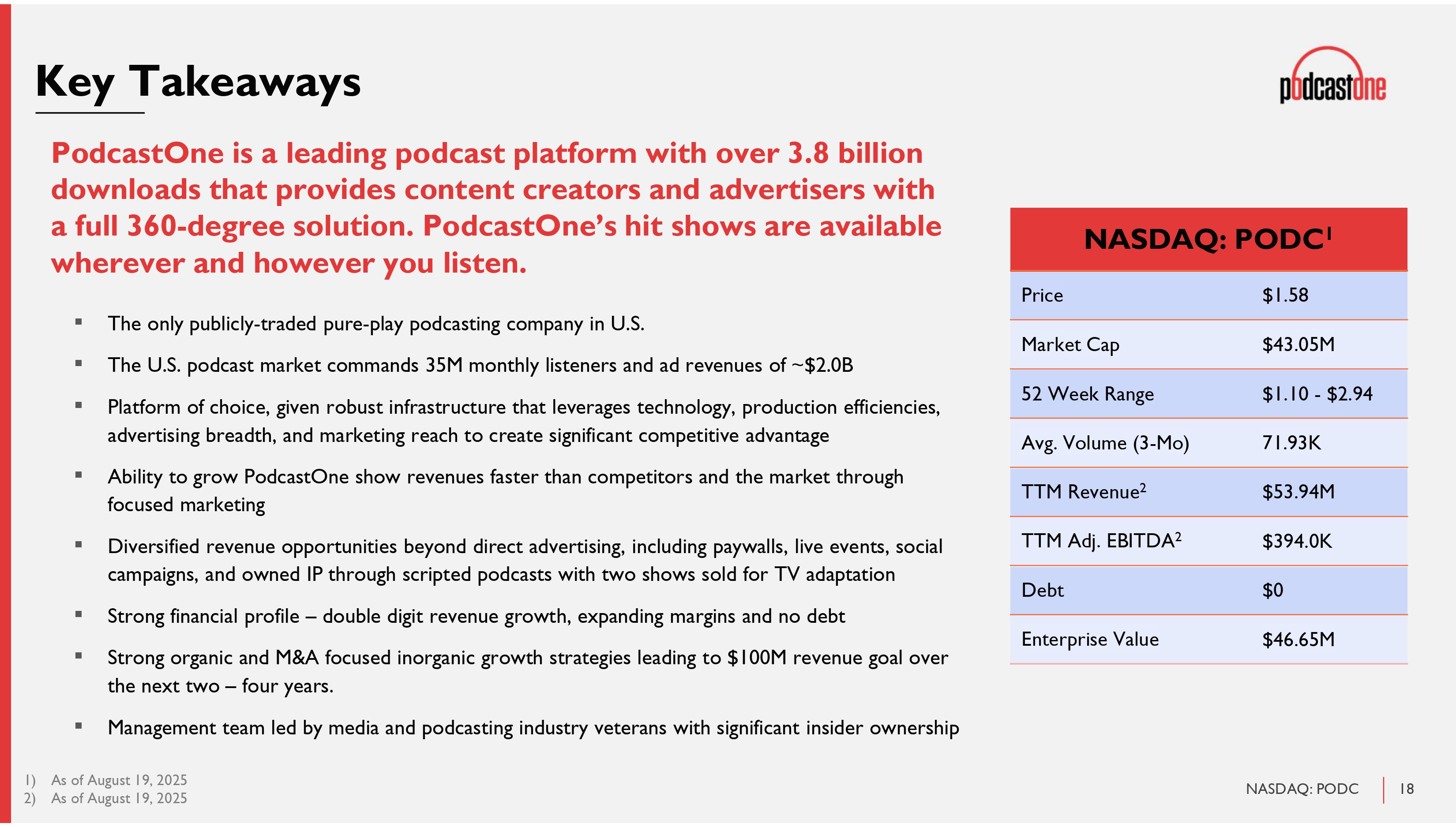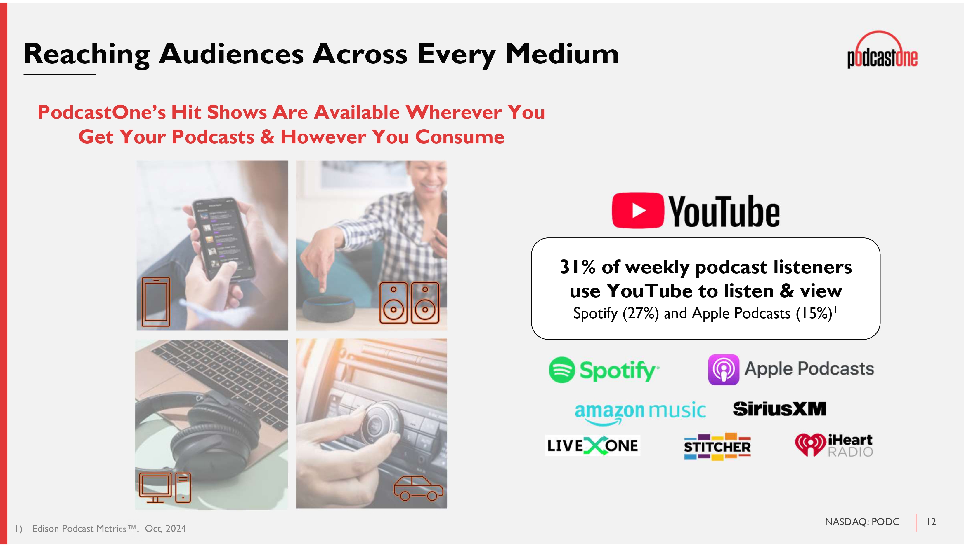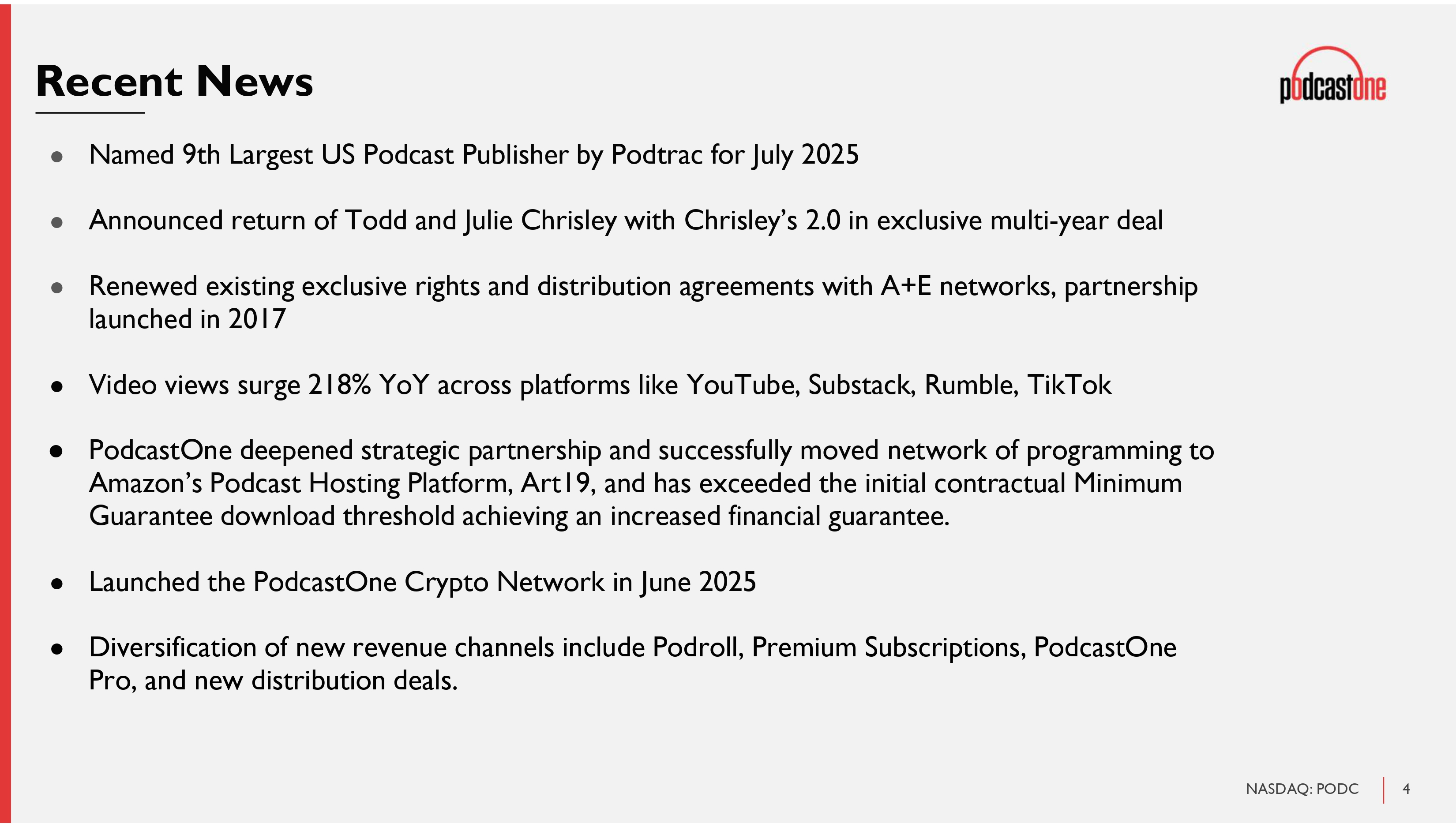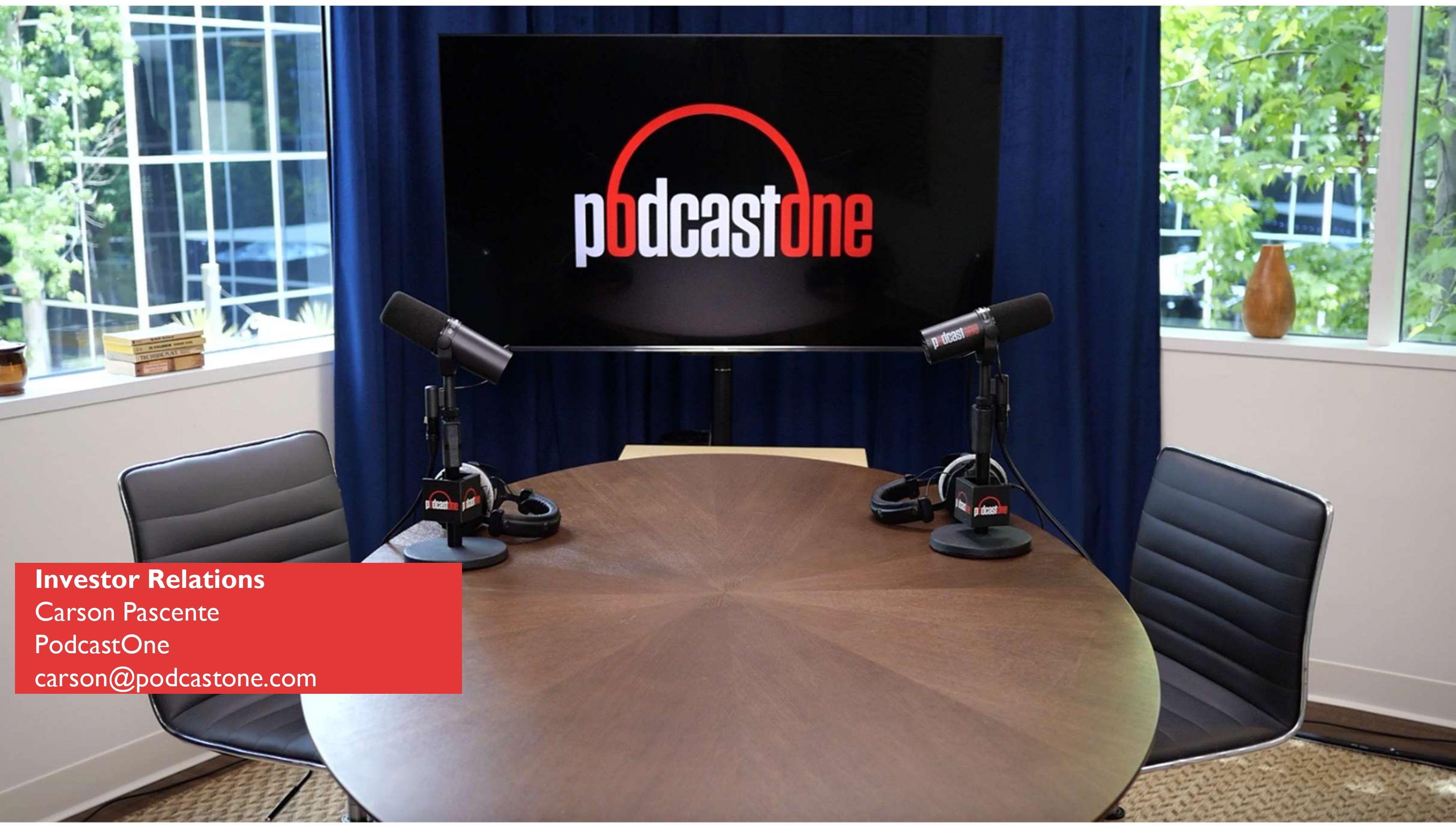 Investor Webinar August 13, 2025 NASDAQ: PODC A LEADING PODCAST PLATFORM WITH OVER 3.8 BILLION DOWNLOADS THAT PROVIDES CONTENT CREATORS AND ADVERTISERS WITH A FULL 360 - DEGREE SOLUTION 1 NASDAQ: PODC Legal Disclaimer The information in this presentation is provided to you by PodcastOne, Inc . (the “Company” or “PodcastOne”) solely for informational purposes and is not an offer to buy or sell, or a solicitation of an offer to buy or sell, any security or instrument of the Company, or to participate in any investment activity or trading strategy, nor may it or any part of it form the basis of or be relied on in connection with any contract or commitment in the United States or anywhere else . By viewing or participating in this presentation, you acknowledge and agree that (i) the information contained in this presentation is intended for the recipient of this information only and shall not be disclosed, reproduced or distributed in any way to anyone else, (ii) no part of this presentation or any other materials provided in connection herewith may be copied, retained, taken away, reproduced or redistributed following this presentation, and (iii) all participants must return all materials provided in connection herewith to the Company at the completion of the presentation . By viewing, accessing or participating in this presentation, you agree to be bound by the foregoing limitations . No representations, warranties or undertakings, express or implied, are made and no reliance should be placed on the accuracy, fairness or completeness of the information, sources or opinions presented or contained in this presentation, or in the case of projections contained herein, as to their attainability or the accuracy and completeness of the assumptions from which they are derived, and it is expected that each prospective investors will pursue his, her or its own independent investigation . The statistical and industry data included herein was obtained from various sources, including certain third parties, and has not been independently verified . By viewing or accessing the information contained in this presentation, the recipient hereby acknowledges and agrees that neither the Company nor any representatives of the Company accepts any responsibility for or makes any representation or warranty, express or implied, with respect to the truth, accuracy, fairness, completeness or reasonableness of the information contained in, and omissions from, these materials and that neither the Company nor any of its affiliates, employees, officers, directors, advisers, placement agents or representatives accepts any liability whatsoever for any loss howsoever arising from any information presented or contained in these materials . This presentation contains forward - looking statements, including descriptions about the intent, belief or current expectations of the Company and its management about future performance and results . Such forward - looking statements are not guarantees of future performance and involve known and unknown risks, uncertainties and other factors which may cause actual results, performance or achievements to differ materially from those expressed or implied by such forward - looking statements . These factors include risks and uncertainties as to : LiveOne’s reliance on its largest OEM customer for a substantial percentage of its revenue ; LiveOne’s and PodcastOne’s ability to consummate any proposed financing, acquisition, merger, distribution or other transaction, the timing of the consummation of any such proposed event, including the risks that a condition to the consummation of any such event would not be satisfied within the expected timeframe or at all, or that the consummation of any proposed financing, acquisition, merger, special dividend, distribution or transaction will not occur or whether any such event will enhance shareholder value ; PodcastOne’s ability to continue as a going concern ; PodcastOne’s ability to attract, maintain and increase the number of its listeners ; PodcastOne identifying, acquiring, securing and developing content ; LiveOne’s intent to repurchase shares of its and/or PodcastOne’s common stock from time to time under LiveOne’s announced stock repurchase program and the timing, price, and quantity of repurchases, if any, under the program ; LiveOne’s ability to maintain compliance with certain financial and other covenants ; PodcastOne successfully implementing its growth strategy, including relating to its technology platforms and applications ; management’s relationships with industry stakeholders ; LiveOne’s ability to repay its indebtedness when due ; LiveOne’s ability to satisfy the conditions for closing on its announced additional convertible debentures financing ; LiveOne’s ability to implement its recently announced crypto treasury strategy and/or purchase crypto assets from time to time pursuant to such strategy, including for up to the maximum announced amount ; uncertain and unfavorable outcomes in legal proceedings and/or PodcastOne’s and/or LiveOne’s ability to pay any amounts due in connection with any such legal proceedings ; changes in economic conditions ; competition ; risks and uncertainties applicable to the businesses of PodcastOne, LiveOne and/or LiveOne’s other subsidiaries ; and other risks, uncertainties and factors including, but not limited to, those described in PodcastOne’s Annual Report on Form 10 - K for the fiscal year ended March 31 , 2025 , filed with the U . S . Securities and Exchange Commission (the “SEC”) on July 2 , 2025 , PodcastOne’s Quarterly Report on Form 10 - Q for the fiscal quarter ended June 30 , 2025 , filed with the SEC on August 14 , 2025 , and in PodcastOne’s other filings and submissions with the SEC . These forward - looking statements speak only as of the date set forth below and PodcastOne disclaims any obligations to update these statements except as 