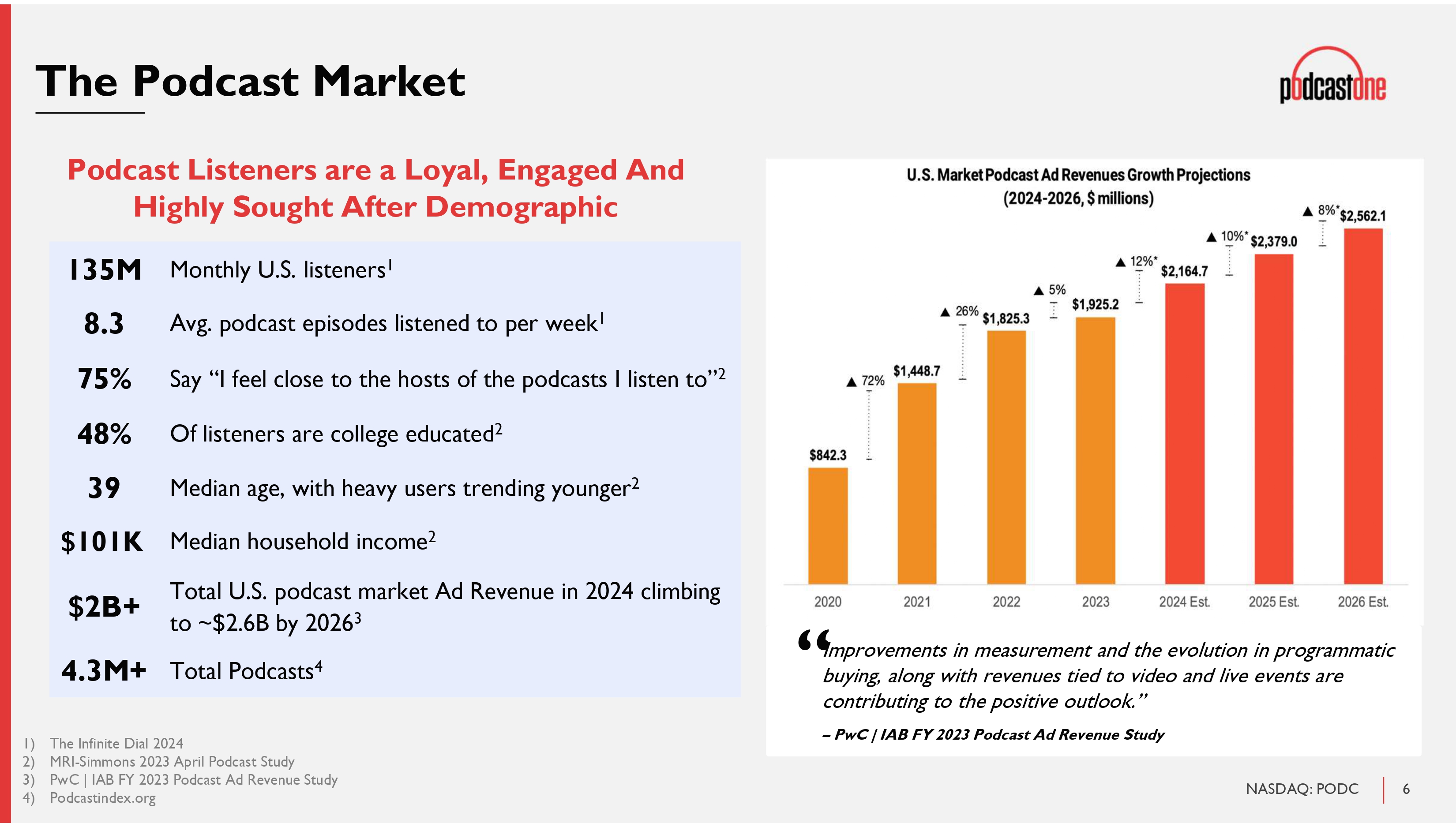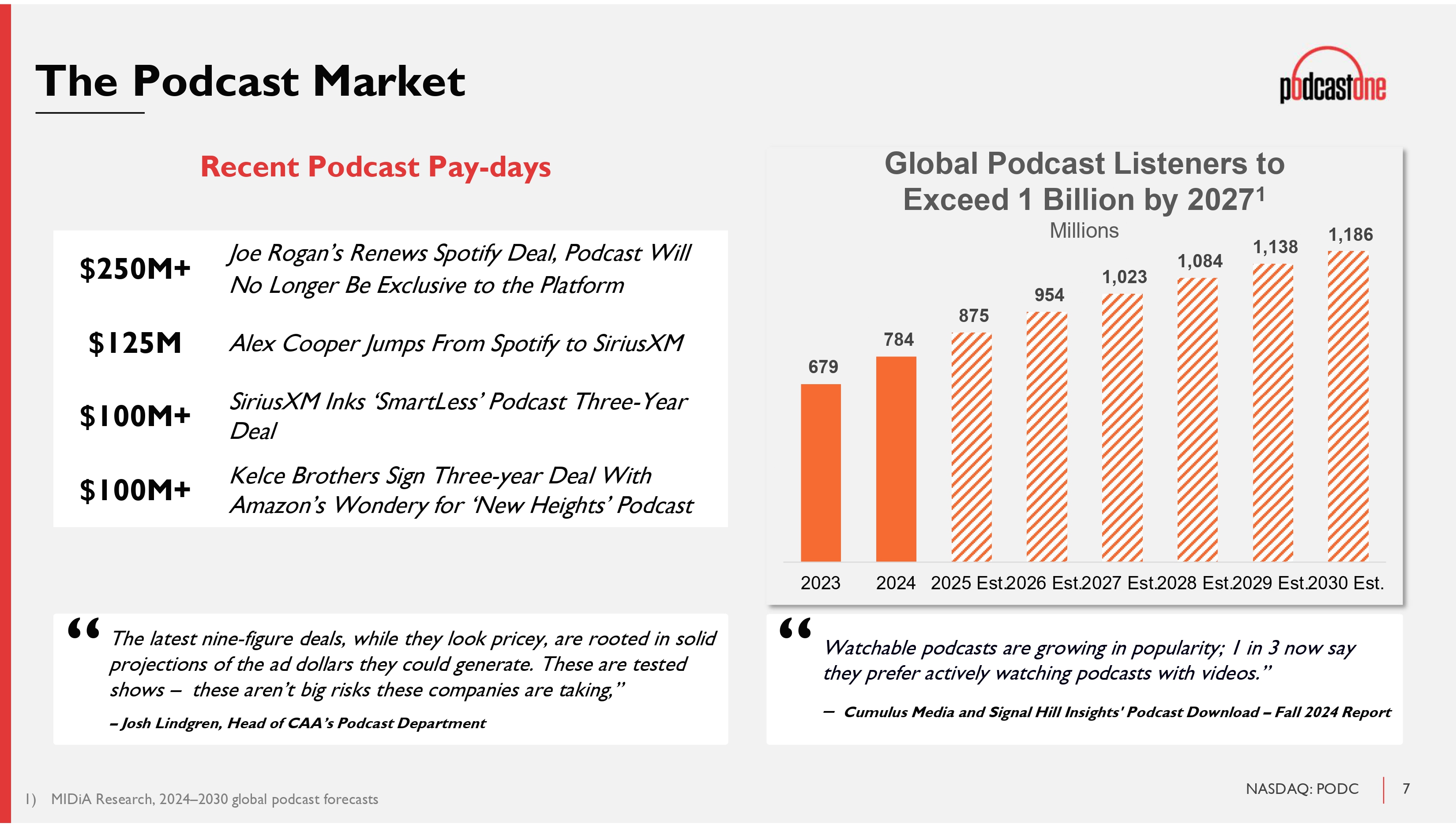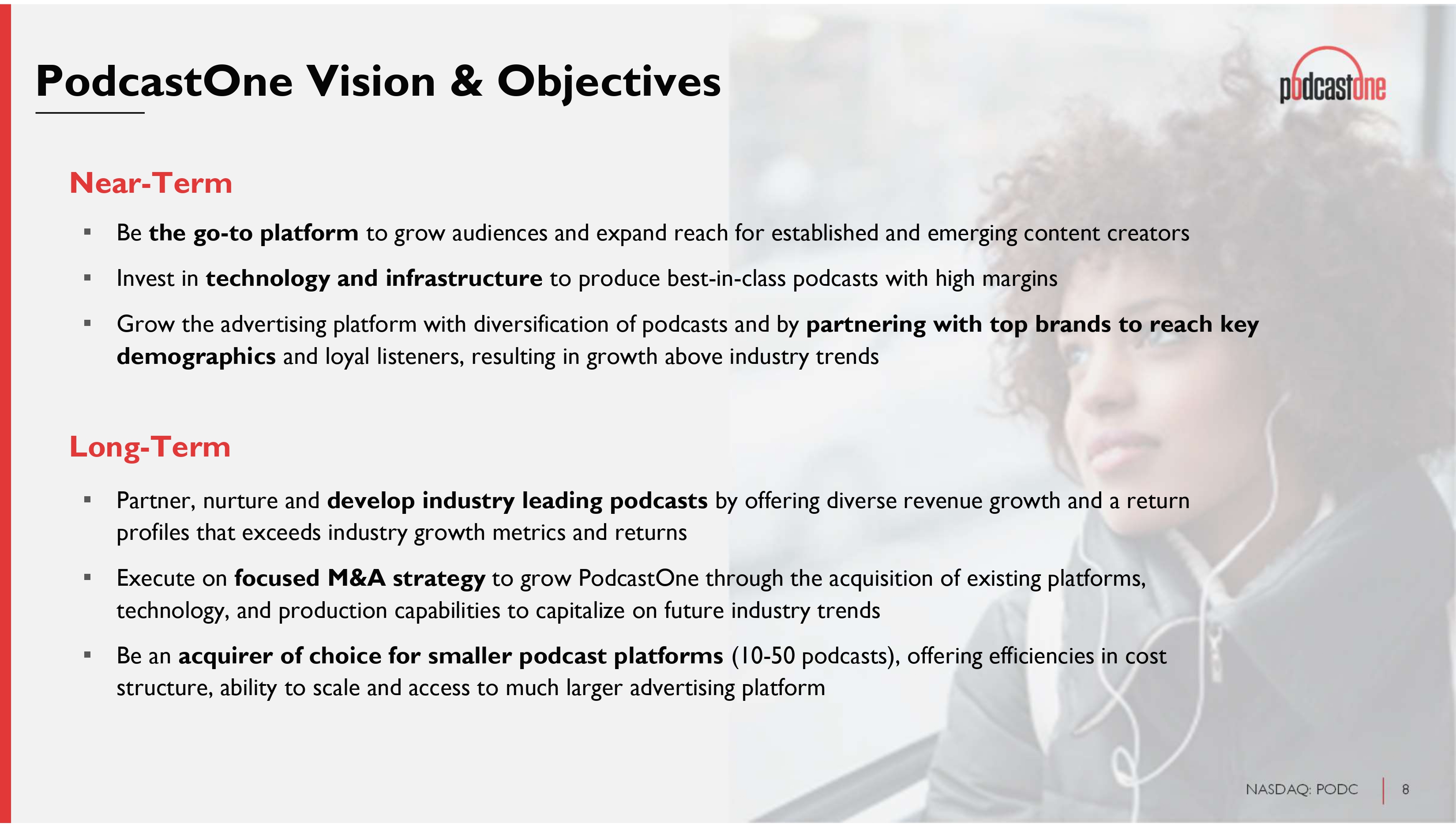 5 NASDAQ: PODC PodcastOne: Snapshot 1,000+ 206 20.3M Episodes Produced Monthly Exclusive Podcasts Monthly Downloads July 2025 Fiscal 2026 Guidance 2 A 2025 Top 10 US Podcast Publisher Positive $55 - 60M Adjusted EBIDTA Revenue +16% $100M Two – Four Year Revenue Goal 2 500+ 5.4M Shows Sold for TV Adaptation Advertisers July Unique Listeners 1) Podtrac Podcast Publisher Rankings 2) See Company’s Press Release dated August 13, 2025 1 6 NASDAQ: PODC 1) The Infinite Dial 2024 2) MRI - Simmons 2023 April Podcast Study 3) PwC | IAB FY 2023 Podcast Ad Revenue Study 4) Podcastindex.org Podcast Listeners are a Loyal, Engaged And Highly Sought After Demographic Monthly U.S. listeners 1 135M Avg. podcast episodes listened to per week 1 8.3 Say “I feel close to the hosts of the podcasts I listen to” 2 75% Of listeners are college educated 2 48% Median age, with heavy users trending younger 2 39 Median household income 2 $101K Total U.S. podcast market Ad Revenue in 2024 climbing to ~$2.6B by 2026 3 $2B+ Total Podcasts 4 4.3M+ The Podcast Market Improvements in measurement and the evolution in programmatic buying, along with revenues tied to video and live events are contributing to the positive outlook.” – PwC | IAB FY 2023 Podcast Ad Revenue Study “ 7 NASDAQ: PODC 1) MIDiA Research, 2024 – 2030 global podcast forecasts The Podcast Market The latest nine - figure deals, while they look pricey, are rooted in solid projections of the ad dollars they could generate.