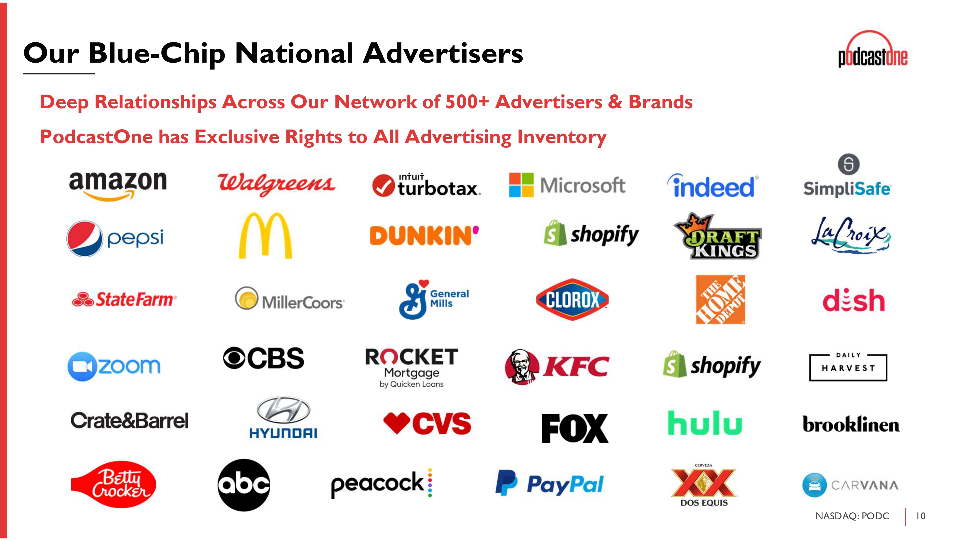 Global Podcast Listeners to Exceed 1 Billion by 2027 1 Millions 8 NASDAQ: PODC PodcastOne Vision & Objectives Near - Term ▪ Be the go - to platform to grow audiences and expand reach for established and emerging content creators ▪ Invest in technology and infrastructure to produce best - in - class podcasts with high margins ▪ Grow the advertising platform with diversification of podcasts and by partnering with top brands to reach key demographics and loyal listeners, resulting in growth above industry trends Long - Term ▪ Partner, nurture and develop industry leading podcasts by offering diverse revenue growth and a return profiles that exceeds industry growth metrics and returns ▪ Execute on focused M&A strategy to grow PodcastOne through the acquisition of existing platforms, technology, and production capabilities to capitalize on future industry trends ▪ Be an acquirer of choice for smaller podcast platforms (10 - 50 podcasts), offering efficiencies in cost structure, ability to scale and access to much larger advertising platform 9 NASDAQ: PODC Unmatched Infrastructure ▪ Allows creators to focus on what they do best and PodcastOne to offer value - added services that efficiently drive revenues PodcastOne Pro ▪ Specializes in transforming podcasts into polished productions ▪ Offers fully customizable production packages for brands, professionals, or hobbyists ▪ Leverages current infrastructure, to drives higher margins & diversified revenue streams Platform of Choice Public Relations Hosting & Distribution Editing Building a Successful Podcast Requires More Than Just Great Content; It Requires a Strategic Approach