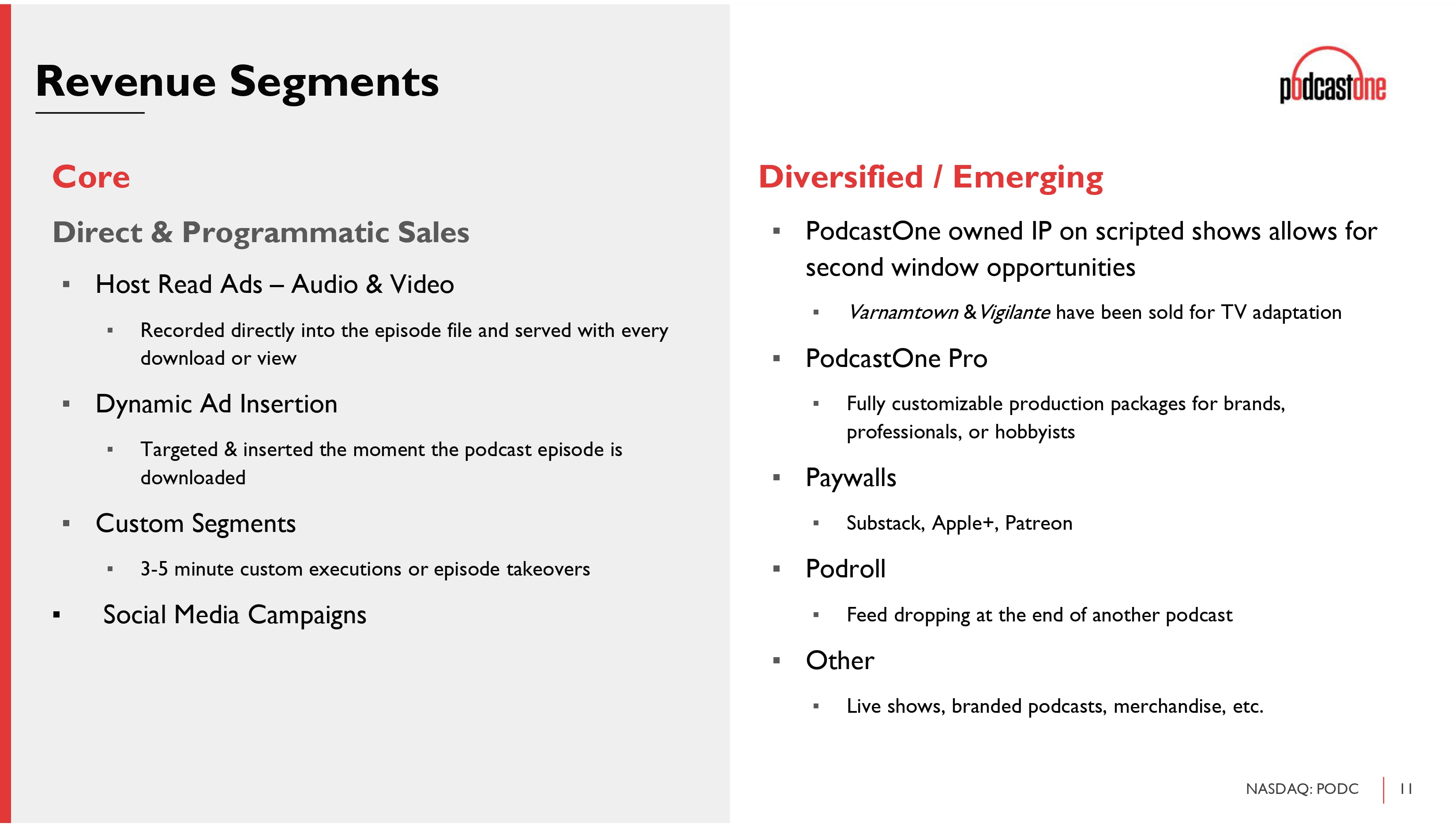 10 NASDAQ: PODC Our Blue - Chip National Advertisers Deep Relationships Across Our Network of 500+ Advertisers & Brands PodcastOne has Exclusive Rights to All Advertising Inventory 11 NASDAQ: PODC Revenue Segments Core Direct & Programmatic Sales ▪ Host Read Ads – Audio & Video ▪ Recorded directly into the episode file and served with every download or view ▪ Dynamic Ad Insertion ▪ Targeted & inserted the moment the podcast episode is downloaded ▪ Custom Segments ▪ 3 - 5 minute custom executions or episode takeovers ▪ Social Media Campaigns Diversified / Emerging ▪ PodcastOne owned IP on scripted shows allows for second window opportunities ▪ Varnamtown & Vigilante have been sold for TV adaptation ▪ PodcastOne Pro ▪ Fully customizable production packages for brands, professionals, or hobbyists ▪ Paywalls ▪ Substack, Apple+, Patreon ▪ Podroll ▪ Feed dropping at the end of another podcast ▪ Other ▪ Live shows, branded podcasts, merchandise, etc.
