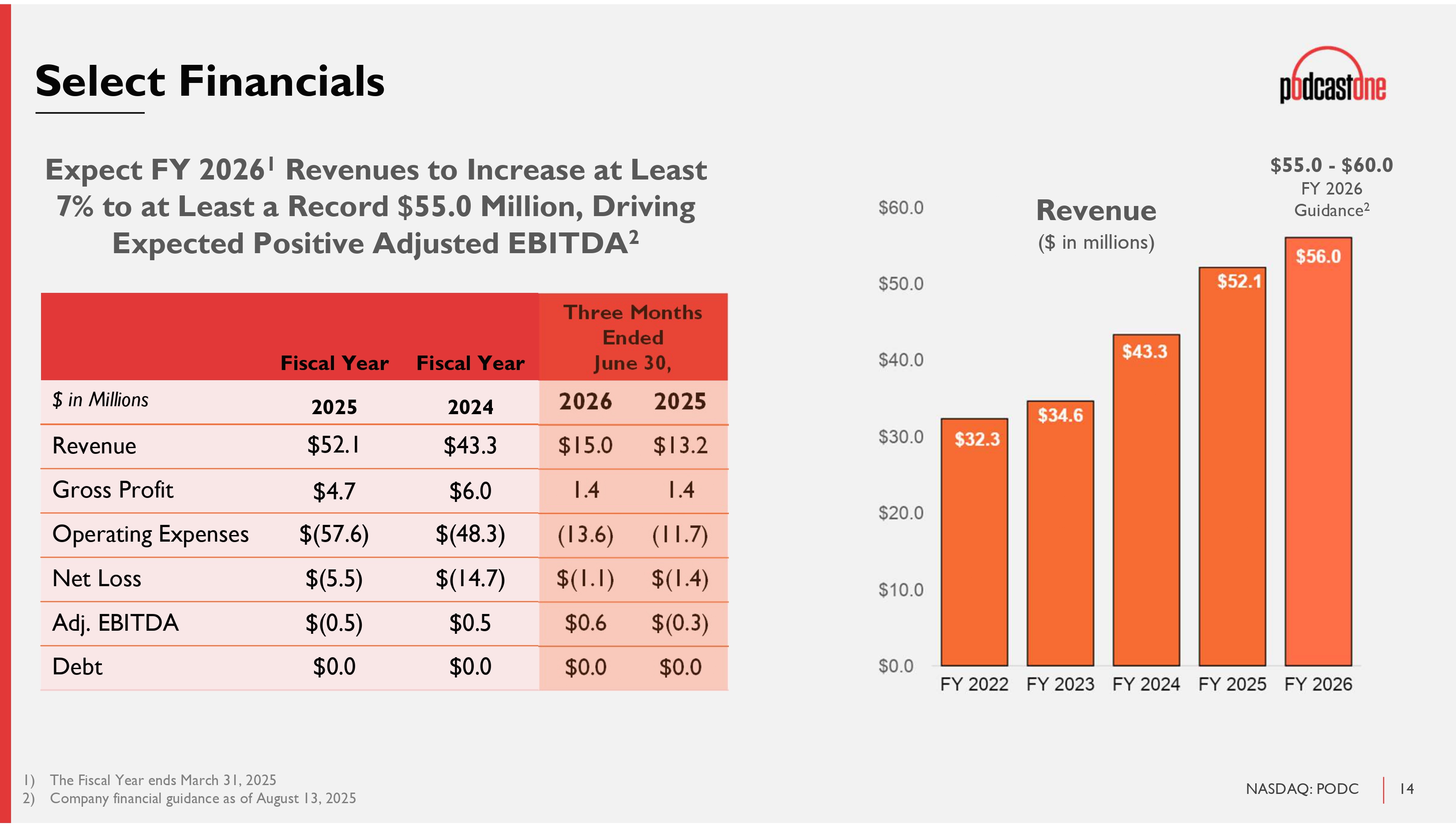 12 NASDAQ: PODC Reaching Audiences Across Every Medium PodcastOne’s Hit Shows Are Available Wherever You Get Your Podcasts & However You Consume 31% of weekly podcast listeners use YouTube to listen & view Spotify (27%) and Apple Podcasts (15%) 1 1) Edison Podcast Metrics , Oct, 2024 13 NASDAQ: PODC 2026 FY Growth Strategy Organic ▪ Focused execution on driving ad revenue ▪ Supporting talent to expand beyond audio & video ▪ Cross platform promotion and monetization ▪ Maximize current infrastructure to drive higher margins ▪ Diversified and emerging revenue streams ▪ Owned IP, PodcastOne Pro, Paywalls, Podroll, Live Events, Merchandise, … Mergers & Acquisitions ▪ Industry has seen consolidation & PodcastOne will be a consolidator of choice ▪ Positioned to act opportunistically with $0 debt, using cash & stock ▪ Major mergers or acquisitions of synergistic verticals ▪ Accretive, cash flow positive assets to benefit from cost reductions upon integration ▪ Platforms with 10 - 50 podcasts ▪ Technology & industry talent to bolster infrastructure Two - Pronged Approach to Grow in Fiscal Year 2026 & Beyond 14 NASDAQ: PODC Select Financials Three Months Ended June 30, Fiscal Year Fiscal Year 2025 2026 2024 2025 $ in Millions $13.2 $15.0 $43.3 $52.1 Revenue 1.4 1.4 $6.0 $4.7 Gross Profit (11.7) (13.6) $(48.3) $(57.6) Operating Expenses $(1.4) $(1.1) $(14.7) $(5.5) Net Loss $(0.3) $0.6 $0.5 $(0.5) Adj.