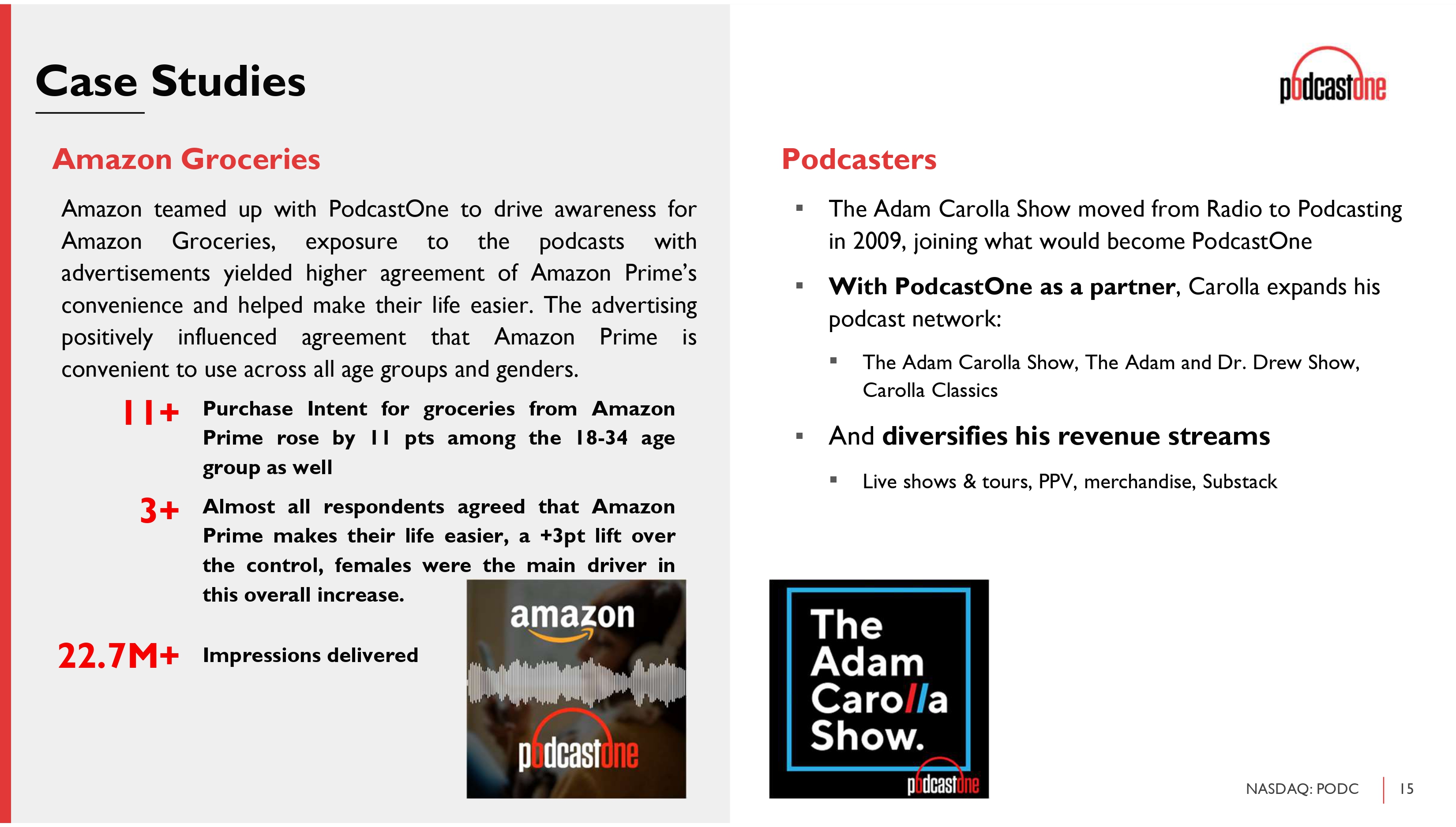 EBITDA $0.0 $0.0 $0.0 $0.0 Debt $55.0 - $60.0 FY 2026 Guidance 2 Expect FY 2026 1 Revenues to Increase at Least 7% to at Least a Record $55.0 Million, Driving Expected Positive Adjusted EBITDA 2 Revenue ($ in millions) 1) The Fiscal Year ends March 31, 2025 2) Company financial guidance as of August 13, 2025 15 NASDAQ: PODC Case Studies Amazon Groceries Amazon teamed up with PodcastOne to drive awareness for Amazon Groceries, exposure to the podcasts with advertisements yielded higher agreement of Amazon Prime’s convenience and helped make their life easier . The advertising positively influenced agreement that Amazon Prime is convenient to use across all age groups and genders . Purchase Intent for groceries from Amazon Prime rose by 11 pts among the 18 - 34 age group as well 11+ Almost all respondents agreed that Amazon Prime makes their life easier, a + 3 pt lift over the control, females were the main driver in this overall increase . 3+ Impressions delivered 22.7M+ Podcasters ▪ The Adam Carolla Show moved from Radio to Podcasting in 2009, joining what would become PodcastOne ▪ With PodcastOne as a partner , Carolla expands his podcast network: ▪ The Adam Carolla Show, The Adam and Dr.