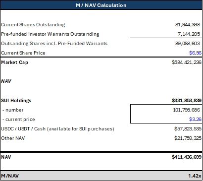 | ● | Valuation: Using the closing price of SUIG common stock and SUI token price on September 2, 2025, SUIG is trading at an approximate mNAV of 1.42x with calculation details below. |