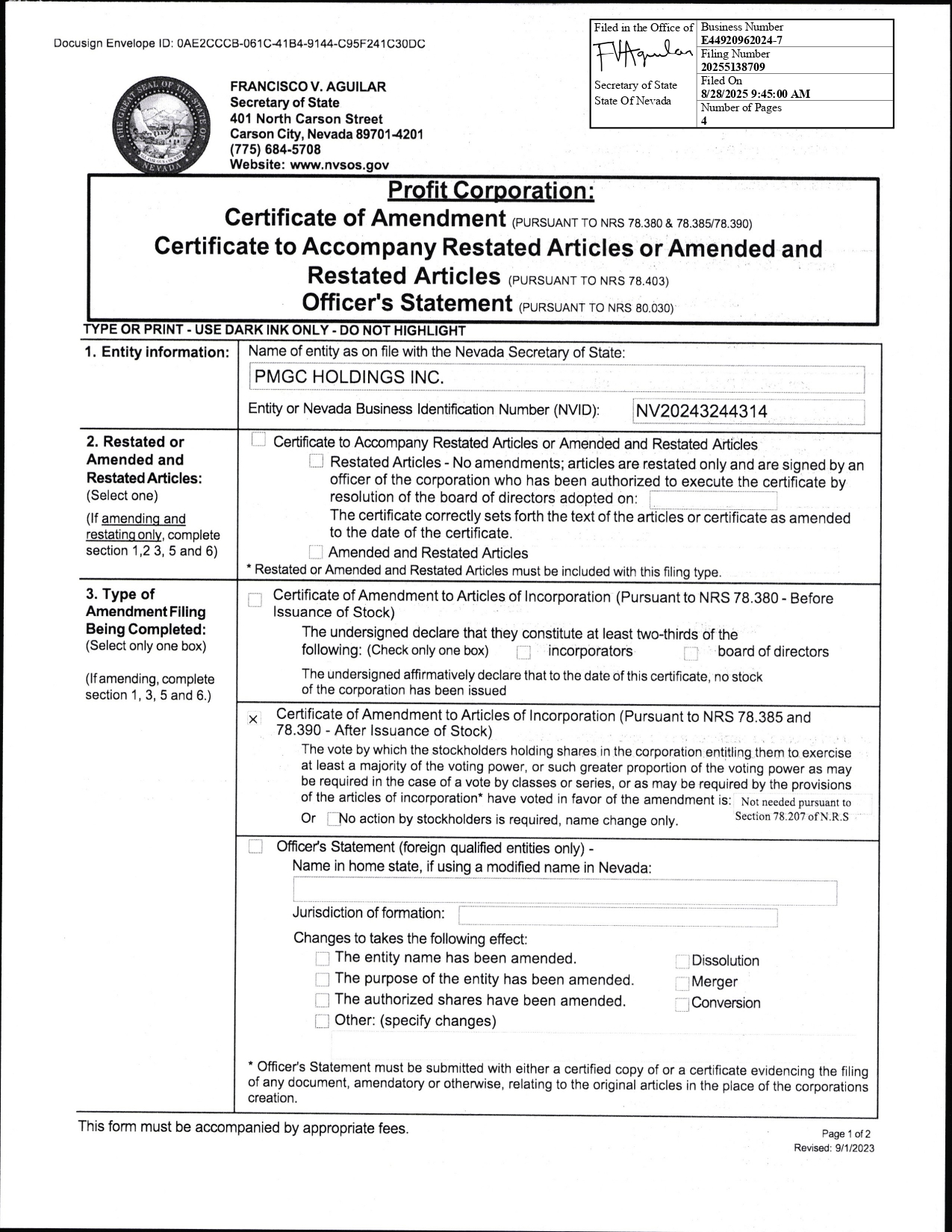 Business Number E44920962024 - 7 Filed in the Office of Secretary of State State Of Nevada Filing Number 20255138709 Filed On 8/28/2025 9:45:00 AM Number of Pages 4 Profit Corporation: Certificate of Amendment ,PURSUANT TO NRS 78.380 & 78 385/78.390) Certificate to Accompany Restated Articles or Amended and Restated Articles ,PURSUANT TO NRS 78 403) Officer's Statement ( URSUANT TO NRS 80.030) D î 3 t £2 09/02/2025 T Ï ' I £ ? ' 9:30 AM EST (must not be later than 90 days after the certificate is filed) 4.