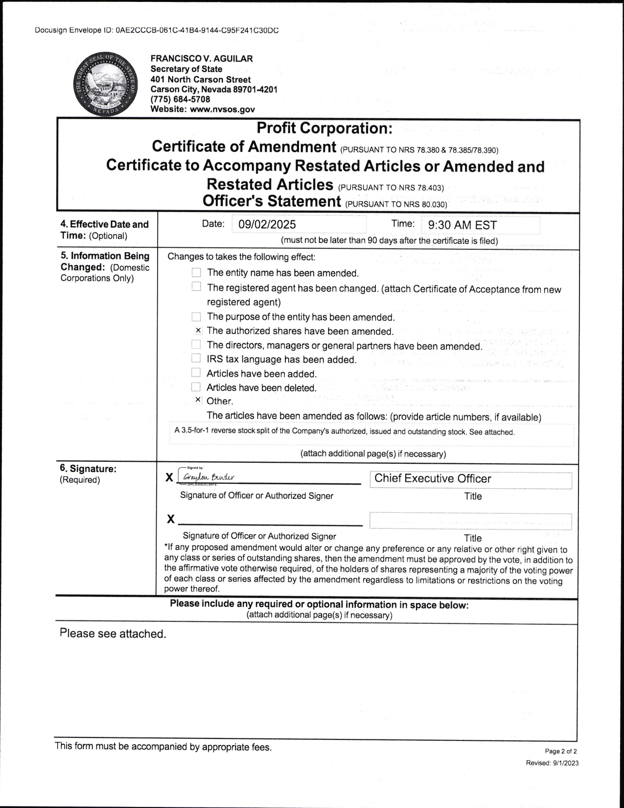 Effective Date and Time: (Optional) Changes to takes the following effect: The entity name has been amended. The registered agent has been changed. (attach Certificate of Acceptance from new registered agent) The purpose of the entity has been amended. The authorized shares have been amended. The directors, managers or general partners have been amended. IRS tax language has been added. Articles have been added. Artides have been deleted. ^ Other. The articles have been amended as follows: (provide article numbers, if available) A 3.5 - for - 1 reverse stock split of the Company's authorized, issued and outstanding stock. See attached. (akach additional page(s) if necessary) 5 . Information Being Changed : (Domestic Corporations Only) Chief Executive Officer Signature of Officer or Authorized Signer Title Signature of Officer or Authorized Signer Title *If any proposed amendment would alter or change any preference or any relative or other right given to any class or series of outstanding shares, then the amendment must be approved by the vote, in addition to the affirmative vote otherwise required, of the holders of shares representing a majority of the voting power of each class or series affected by the amendment regardless to limitations or restrictions on the voting power thereof. 6. Signature: (Required) Please include any required or optional information in space below: (attach additional page(s) if necessary) Please see attached. Docusign Envelope ID : 0AE2CLCB - 061 G - 41 B4 - 9144 - C95F241C30DC. FRANCISCO V. AGUILAR Secretary of State 401 North Carson Street Carson City, Nevada 89701•4201 (775) 684 - 5708 Website: www.nvsos.gov This form must be accompanied by appropriate fees.