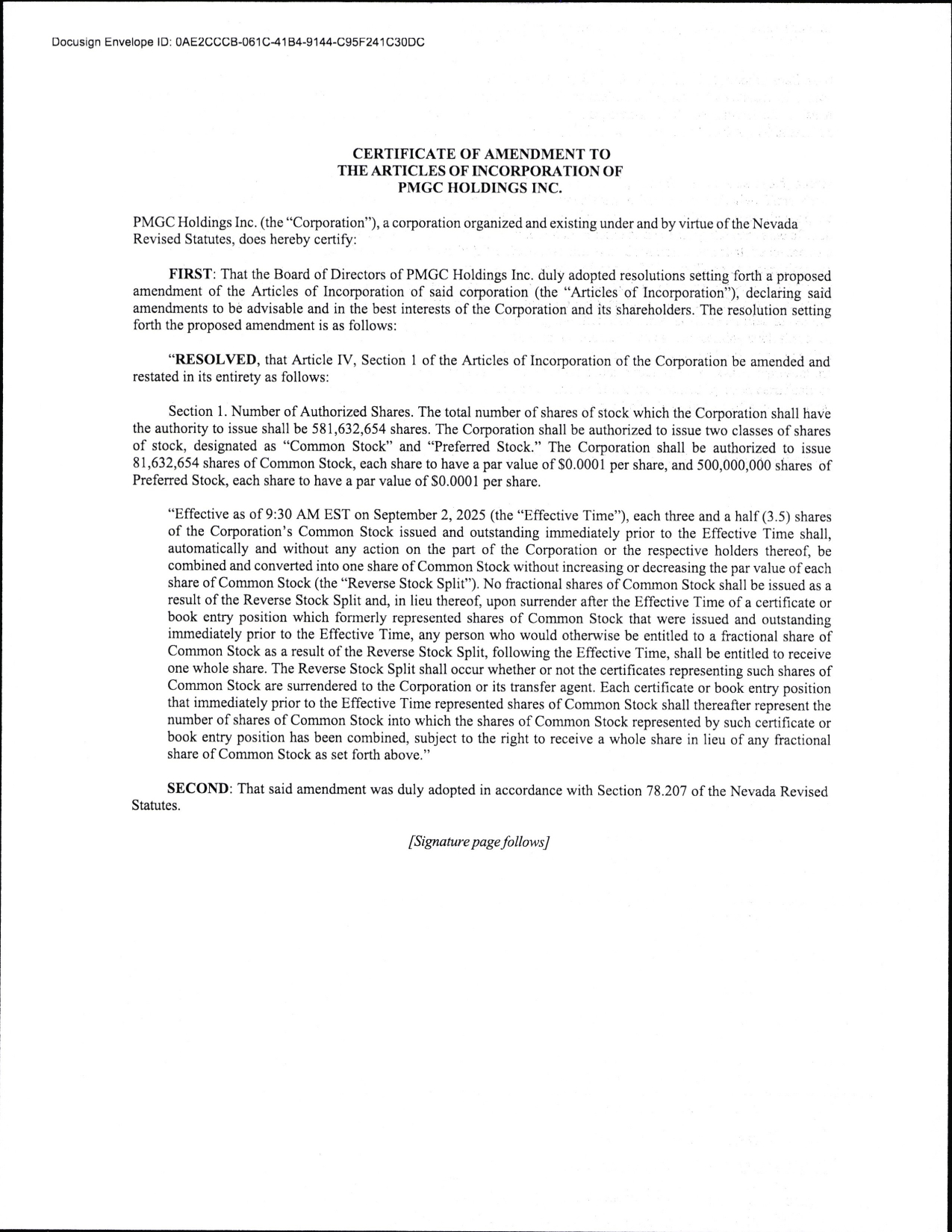 Page 2 of 2 Revised: 9/1/2023 Docusign Envelope ID: 0AE2CGCB - 0b1C - 41B4 - 9144 - C95F241C30DC CERTIFICATE OF AMENDMENT TO THE ARTICLES OF INCORPORATION OF PMGC HOLDINGS INC. PMGC Holdings Inc. (the “Corporation”), a corporation organized and existing under and by virtue of the Nevada Revised Statutes, does hereby certify: FIRST : That the Board of Directors of PMGC Holdings Inc . duly adopted resolutions setting forth a proposed amendment of the Articles of Incorporation of said corporation (the “Articles of Incorporation”), declaring said amendments to be advisable and in the best interests of the Corporation and its shareholders . The resolution setting forth the proposed amendment is as follows : “RESOLVED, that Article JV, Section 1 of the Articles of Incorporation of the Corporation be amended and restated in its entirety as follows : Section 1 . Number of Authorized Shares . The total number of shares of stock which the Corporation shall have the authority to issue shall be 581 , 632 , 654 shares . The Corporation shall be authorized to issue two classes of shares of stock, designated as “Common Stock” and “Preferred Stock . ” The COf] 3 OratiOr 1 Shall be authorized to issue 81 , 632 , 654 shares of Common Stock, each share to have a par value of $ 0 . 0001 per share, and 500 , 000 , 000 shares of Preferred Stock, each share to have a par value of $ 0 . 0001 per share . “Effective as of 9 : 30 AM EST on September 2 , 2025 (the “Effective Time”), each three and a half ( 3 . 5 ) shares of the Corporation's Common Stock issued and outstanding immediately prior to the Effectiv e Time shall, automatically and without any action on the part of the Corporation or the respective holders thereof, be combined and converted into one share of Common Stock without increasing or decreasing the par value of each share of Common Stock (the “Reverse Stock Split”) . No fractional shares of Common Stock shall be issued as a result of the Reverse Stock Split and, in lieu thereof, upon surrender after the Effective Time of a certificate or book entry position which formerly represented shares of Common Stock that were issued and outstanding immediately prior to the Effective Time, any person who would otherwise be entitled to a fractional share of Common Stock as a result of the Reverse Stock Split, following the Effective Time, shall be entitled to receive one whole share . The Reverse Stock Split shall occur whether or not the certificates representing such shares of Common Stock are surrendered to the Corporation or its transfer agent . Each certificate or book entry position that immediately prior to the Effective Time represented shares of Common Stock shall thereafter represent the number of shares of Common Stock into which the shares of Common Stock represented by such certificate or book entry position has been combined, subject to the right to receive a whole share in lieu of any fractional share of Common Stock as set forth above . ” SECOND : That said amendment was duly adopted in accordance with Section 78 . 207 of the Nevada Revised Statutes . [Signature page follows]