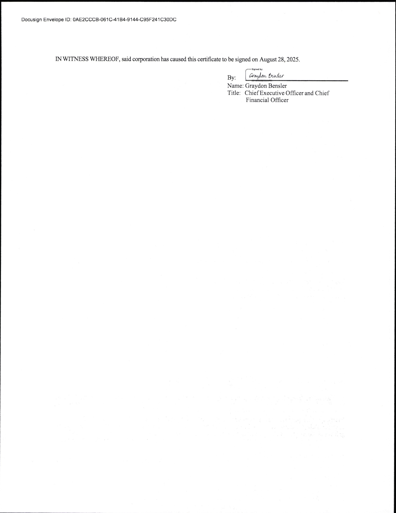 Docusign Envelope ID: 0AE2CCñB - 061G - 41B4 - 9144 - U95F241G30DL. IN WITNESS WHEREOF, said corporation has caused this certificate to be signed on August 28, 2025. By: Name: Graydon Bensler Title: Chief Executive Officer and Chief’ Financial Officer