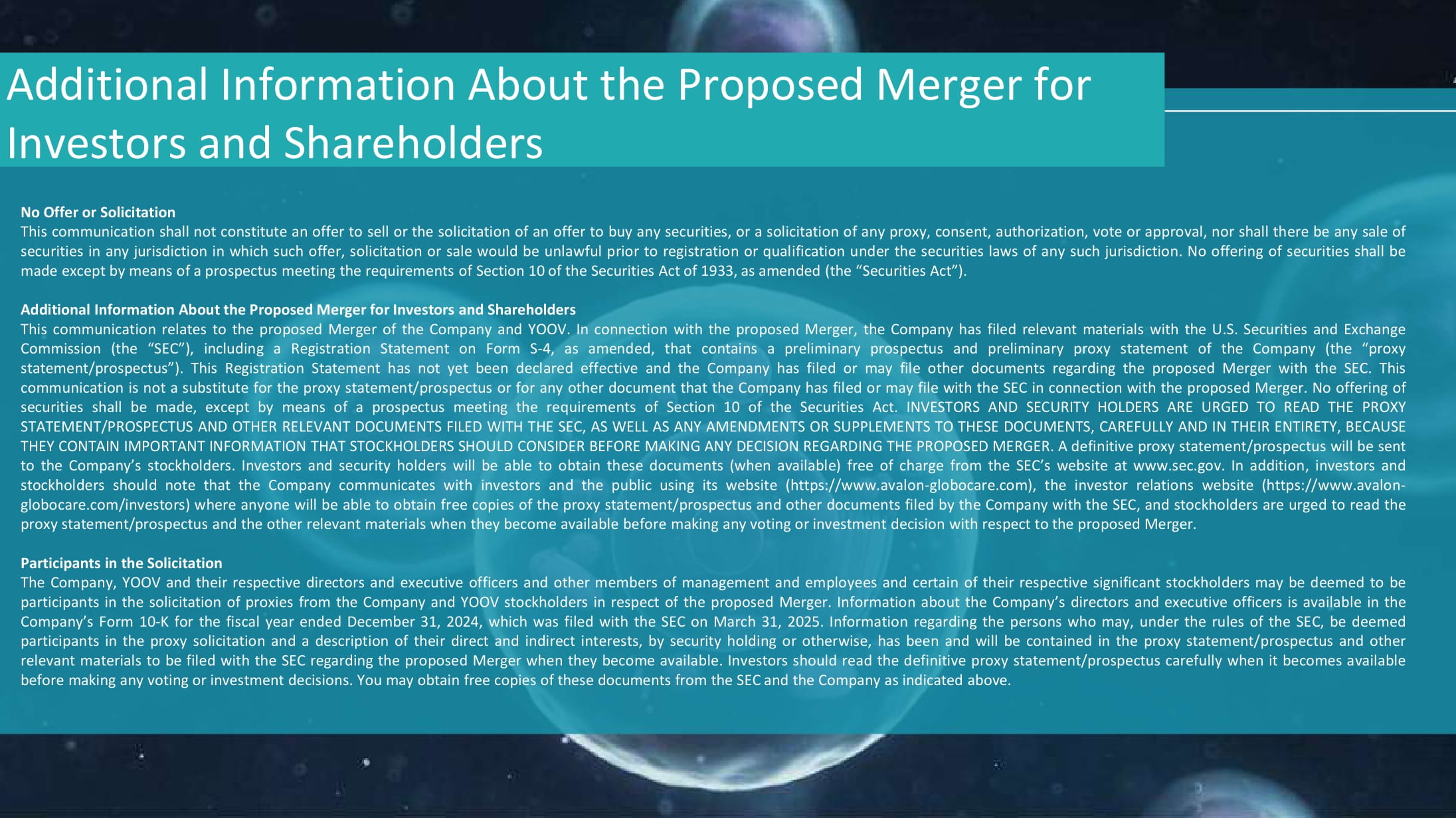 Forward - Looking Statements Forward - Looking Statements 2 2 No Offer or Solicitation This communication shall not constitute an offer to sell or the solicitation of an offer to buy any securities, or a solicitation of any proxy, consent, authorization, vote or approval, nor shall there be any sale of securities in any jurisdiction in which such offer, solicitation or sale would be unlawful prior to registration or qualification under the securities laws of any such jurisdiction . No offering of securities shall be made except by means of a prospectus meeting the requirements of Section 10 of the Securities Act of 1933 , as amended (the “Securities Act”) . Additional Information About the Proposed Merger for Investors and Shareholders This communication relates to the proposed Merger of the Company and YOOV . In connection with the proposed Merger, the Company has filed relevant materials with the U . S . Securities and Exchange Commission (the “SEC”), including a Registration Statement on Form S - 4 , as amended, that contains a preliminary prospectus and preliminary proxy statement of the Company (the “proxy statement/prospectus”) . This Registration Statement has not yet been declared effective and the Company has filed or may file other documents regarding the proposed Merger with the SEC . This communication is not a substitute for the proxy statement/prospectus or for any other document that the Company has filed or may file with the SEC in connection with the proposed Merger . No offering of securities shall be made, except by means of a prospectus meeting the requirements of Section 10 of the Securities Act . INVESTORS AND SECURITY HOLDERS ARE URGED TO READ THE PROXY STATEMENT/PROSPECTUS AND OTHER RELEVANT DOCUMENTS FILED WITH THE SEC, AS WELL AS ANY AMENDMENTS OR SUPPLEMENTS TO THESE DOCUMENTS, CAREFULLY AND IN THEIR ENTIRETY, BECAUSE THEY CONTAIN IMPORTANT INFORMATION THAT STOCKHOLDERS SHOULD CONSIDER BEFORE MAKING ANY DECISION REGARDING THE PROPOSED MERGER . A definitive proxy statement/prospectus will be sent to the Company’s stockholders . Investors and security holders will be able to obtain these documents (when available) free of charge from the SEC’s website at www . sec . gov . In addition, investors and stockholders should note that the Company communicates with investors and the public using its website (https : //www . avalon - globocare . com), the investor relations website (https : //www . avalon - globocare . com/investors) where anyone will be able to obtain free copies of the proxy statement/prospectus and other documents filed by the Company with the SEC, and stockholders are urged to read the proxy statement/prospectus and the other relevant materials when they become available before making any voting or investment decision with respect to the proposed Merger . Participants in the Solicitation The Company, YOOV and their respective directors and executive officers and other members of management and employees and certain of their respective significant stockholders may be deemed to be participants in the solicitation of proxies from the Company and YOOV stockholders in respect of the proposed Merger . Information about the Company’s directors and executive officers is available in the Company’s Form 10 - K for the fiscal year ended December 31 , 2024 , which was filed with the SEC on March 31 , 2025 . Information regarding the persons who may, under the rules of the SEC, be deemed participants in the proxy solicitation and a description of their direct and indirect interests, by security holding or otherwise, has been and will be contained in the proxy statement/prospectus and other relevant materials to be filed with the SEC regarding the proposed Merger when they become available . Investors should read the definitive proxy statement/prospectus carefully when it becomes available before making any voting or investment decisions . You may obtain free copies of these documents from the SEC and the Company as indicated above .