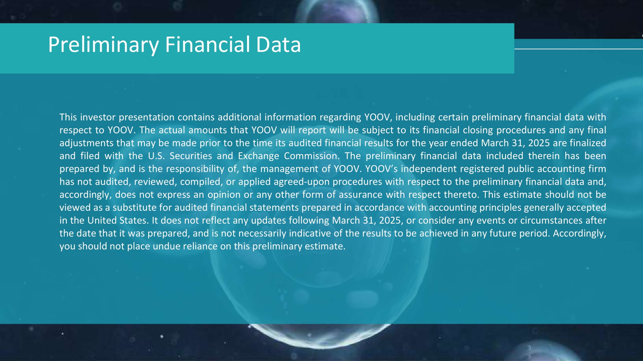 The investor presentation contains additional information regarding YOOV, including certain preliminary financial data with respect to YOOV. The actual amounts that YOOV will report will be subject to its financial closing procedures and any final adjustments that may be made prior to the time its audited financial results for the year ended March 31, 2025 are finalized and filed with the U.S. Securities and Exchange Commission. The preliminary financial data included therein has been prepared by, and is the responsibility of, the management of YOOV. YOOV’s independent registered public accounting firm has not audited, reviewed, compiled, or applied agreed-upon procedures with respect to the preliminary financial data and, accordingly, does not express an opinion or any other form of assurance with respect thereto. This estimate should not be viewed as a substitute for audited financial statements prepared in accordance with accounting principles generally accepted in the United States. It does not reflect any updates following March 31, 2025, or consider any events or circumstances after the date that it was prepared, and is not necessarily indicative of the results to be achieved in any future period. Accordingly, you should not place undue reliance on this preliminary estimate.