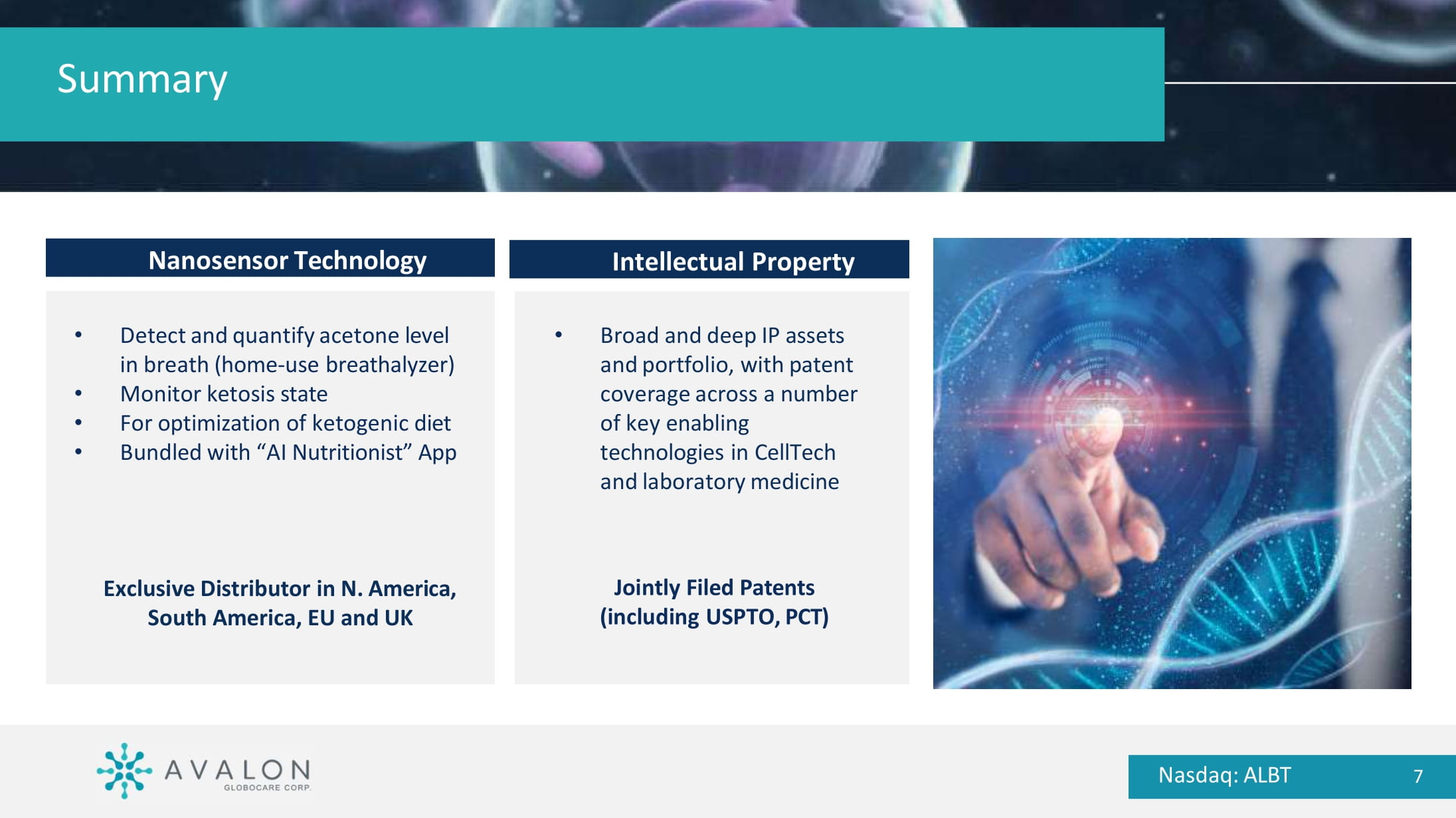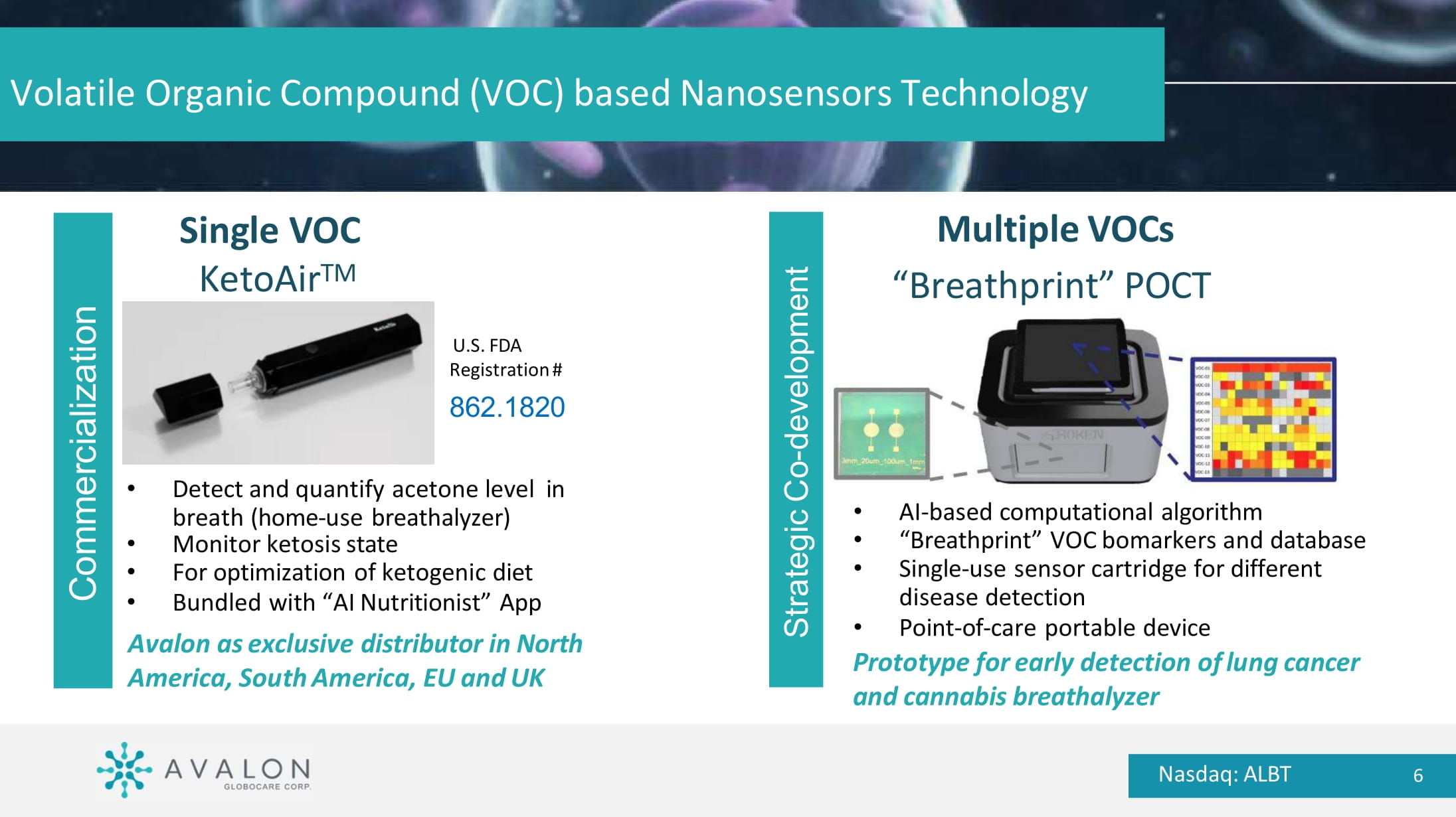 Core Technology Platforms: • KetoAir breathalyzer device nanosensor technology • QTY protein design platform joint intellectual property with Massachusetts Institute of Technology (MIT) Corporate Overview and Highlights Nasdaq: ALBT 5 Volatile Organic Compound (VOC) based Nanosensors Technology Multiple VOCs “Breathprint” POCT • AI - based computational algorithm • “Breathprint” VOC bomarkers and database • Single - use sensor cartridge for different disease detection • Point - of - care portable device Prototype for early detection of lung cancer and cannabis breathalyzer Single VOC KetoAir TM U.S. FDA Registration # 862.1820 • Detect and quantify acetone level in breath (home - use breathalyzer) • Monitor ketosis state • For optimization of ketogenic diet • Bundled with “AI Nutritionist” App Avalon as exclusive distributor in North America, South America, EU and UK Commercialization Strategic Co - development Nasdaq: ALBT 6 Summary Nanosensor Technology Nasdaq: ALBT 7 Jointly Filed Patents (including USPTO, PCT) • Detect and quantify acetone level in breath (home - use breathalyzer) • Monitor ketosis state • For optimization of ketogenic diet • Bundled with “AI Nutritionist” App Exclusive Distributor in N. America, South America, EU and UK • Broad and deep IP assets and portfolio, with patent coverage across a number of key enabling technologies in CellTech and laboratory medicine Intellectual Property