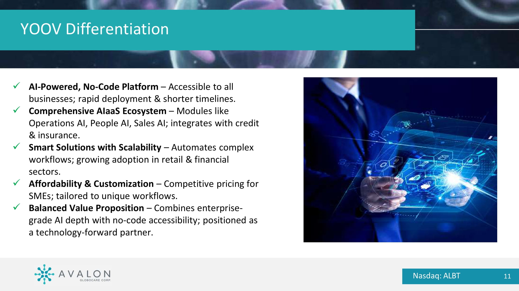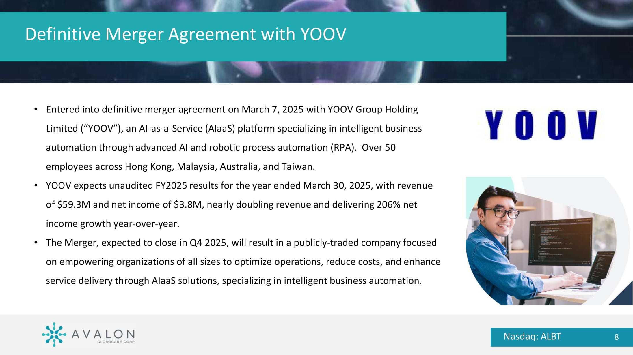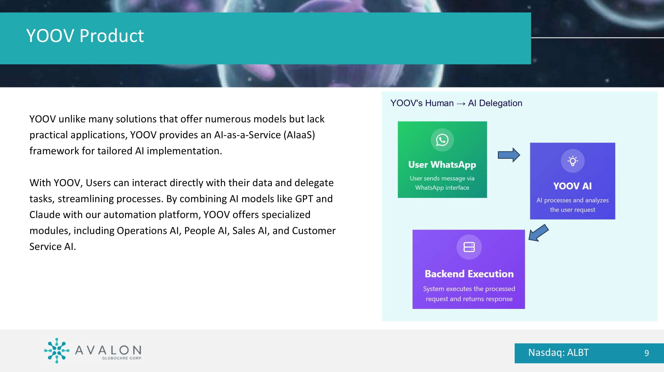• Entered into definitive merger agreement on March 7, 2025 with YOOV Group Holding Limited (“YOOV”), an AI - as - a - Service ( AIaaS ) platform specializing in intelligent business automation through advanced AI and robotic process automation (RPA). Over 50 employees across Hong Kong, Malaysia, Australia, and Taiwan. • YOOV expects unaudited FY2025 results for the year ended March 30, 2025, with revenue of $59.3M and net income of $3.8M, nearly doubling revenue and delivering 206% net income growth year - over - year. • The Merger, expected to close in Q4 2025, will result in a publicly - traded company focused on empowering organizations of all sizes to optimize operations, reduce costs, and enhance service delivery through AIaaS solutions, specializing in intelligent business automation. Definitive Merger Agreement with YOOV Nasdaq: ALBT 8 YOOV Product Nasdaq: ALBT 9 YOOV unlike many solutions that offer numerous models but lack practical applications, YOOV provides an AI - as - a - Service ( AIaaS ) framework for tailored AI implementation.