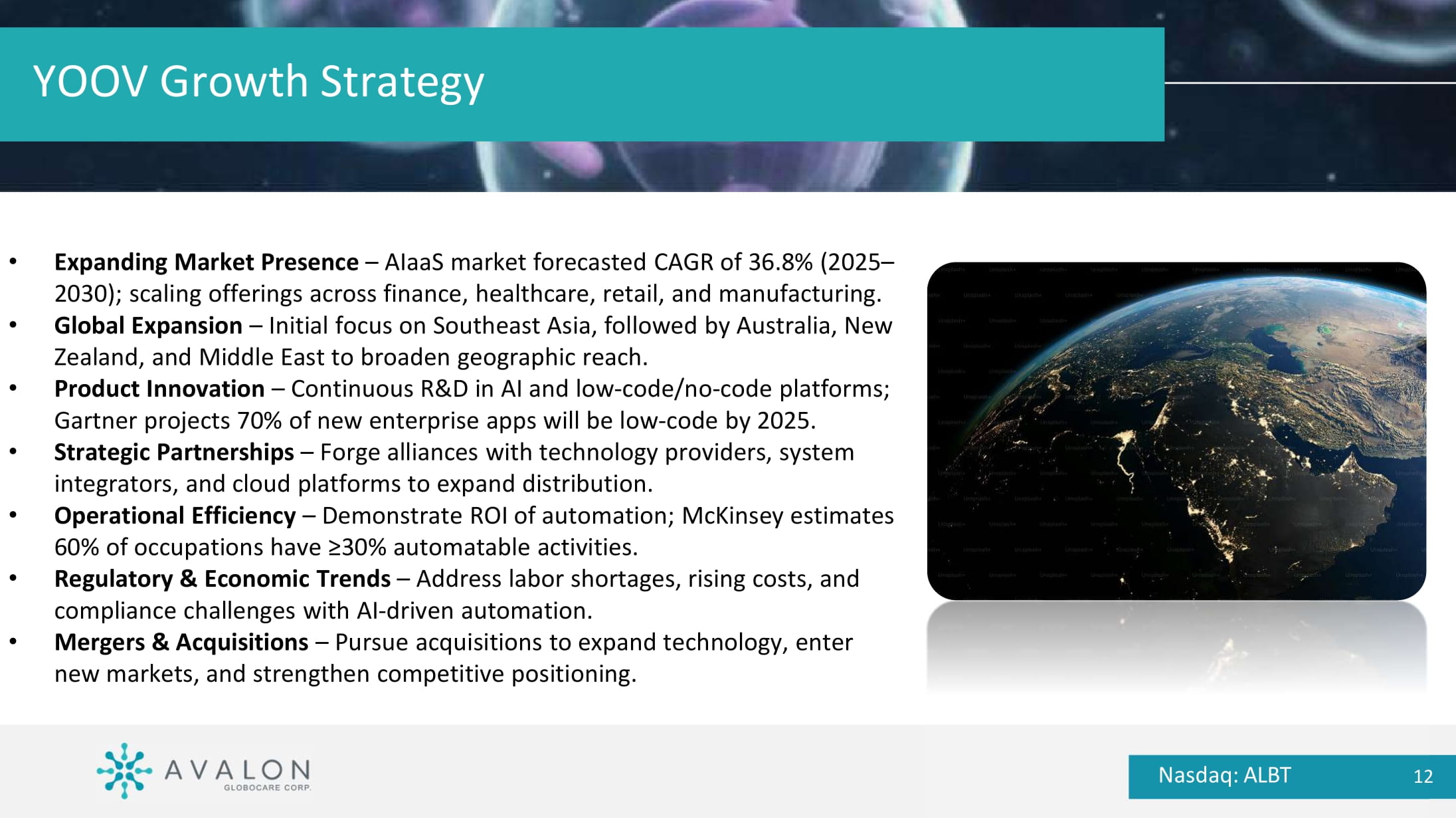 YOOV Differentiation Nasdaq: ALBT 11 x AI - Powered, No - Code Platform – Accessible to all businesses; rapid deployment & shorter timelines. x Comprehensive AIaaS Ecosystem – Modules like Operations AI, People AI, Sales AI; integrates with credit & insurance. x Smart Solutions with Scalability – Automates complex workflows; growing adoption in retail & financial sectors. x Affordability & Customization – Competitive pricing for SMEs; tailored to unique workflows. x Balanced Value Proposition – Combines enterprise - grade AI depth with no - code accessibility; positioned as a technology - forward partner.