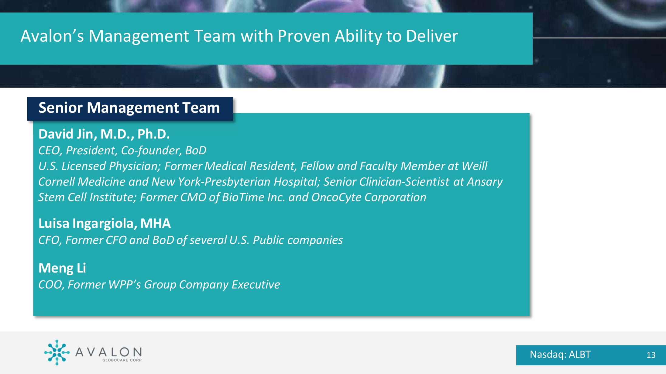 YOOV Growth Strategy • Expanding Market Presence – AIaaS market forecasted CAGR of 36.8% (2025 – 2030); scaling offerings across finance, healthcare, retail, and manufacturing. • Global Expansion – Initial focus on Southeast Asia, followed by Australia, New Zealand, and Middle East to broaden geographic reach. • Product Innovation – Continuous R&D in AI and low - code/no - code platforms; Gartner projects 70% of new enterprise apps will be low - code by 2025. • Strategic Partnerships – Forge alliances with technology providers, system integrators, and cloud platforms to expand distribution. • Operational Efficiency – Demonstrate ROI of automation; McKinsey estimates 60% of occupations have ≥30% automatable activities. • Regulatory & Economic Trends – Address labor shortages, rising costs, and compliance challenges with AI - driven automation. • Mergers & Acquisitions – Pursue acquisitions to expand technology, enter new markets, and strengthen competitive positioning. Nasdaq: ALBT 12 Senior Management Team David Jin, M.D., Ph.D.
