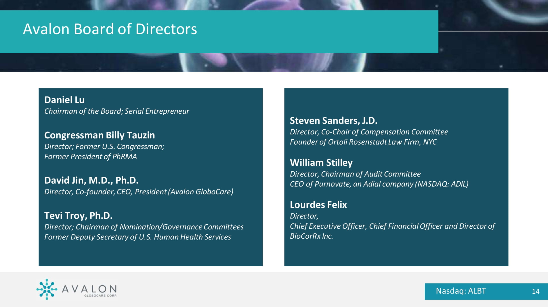 Public companies Meng Li COO, Former WPP’s Group Company Executive Nasdaq: ALBT 13 Avalon’s Management Team with Proven Ability to Deliver Avalon Board of Directors Nasdaq: ALBT 14 Steven Sanders, J.D. Director, Co - Chair of Compensation Committee Founder of Ortoli Rosenstadt Law Firm, NYC William Stilley Director, Chairman of Audit Committee CEO of Purnovate, an Adial company (NASDAQ: ADIL) Lourdes Felix Director, Chief Executive Officer, Chief Financial Officer and Director of BioCorRx Inc. Daniel Lu Chairman of the Board; Serial Entrepreneur Congressman Billy Tauzin Director; Former U.S. Congressman; Former President of PhRMA David Jin, M.D., Ph.D. Director, Co - founder, CEO, President (Avalon GloboCare) Tevi Troy, Ph.D. Director; Chairman of Nomination/Governance Committees Former Deputy Secretary of U.S.