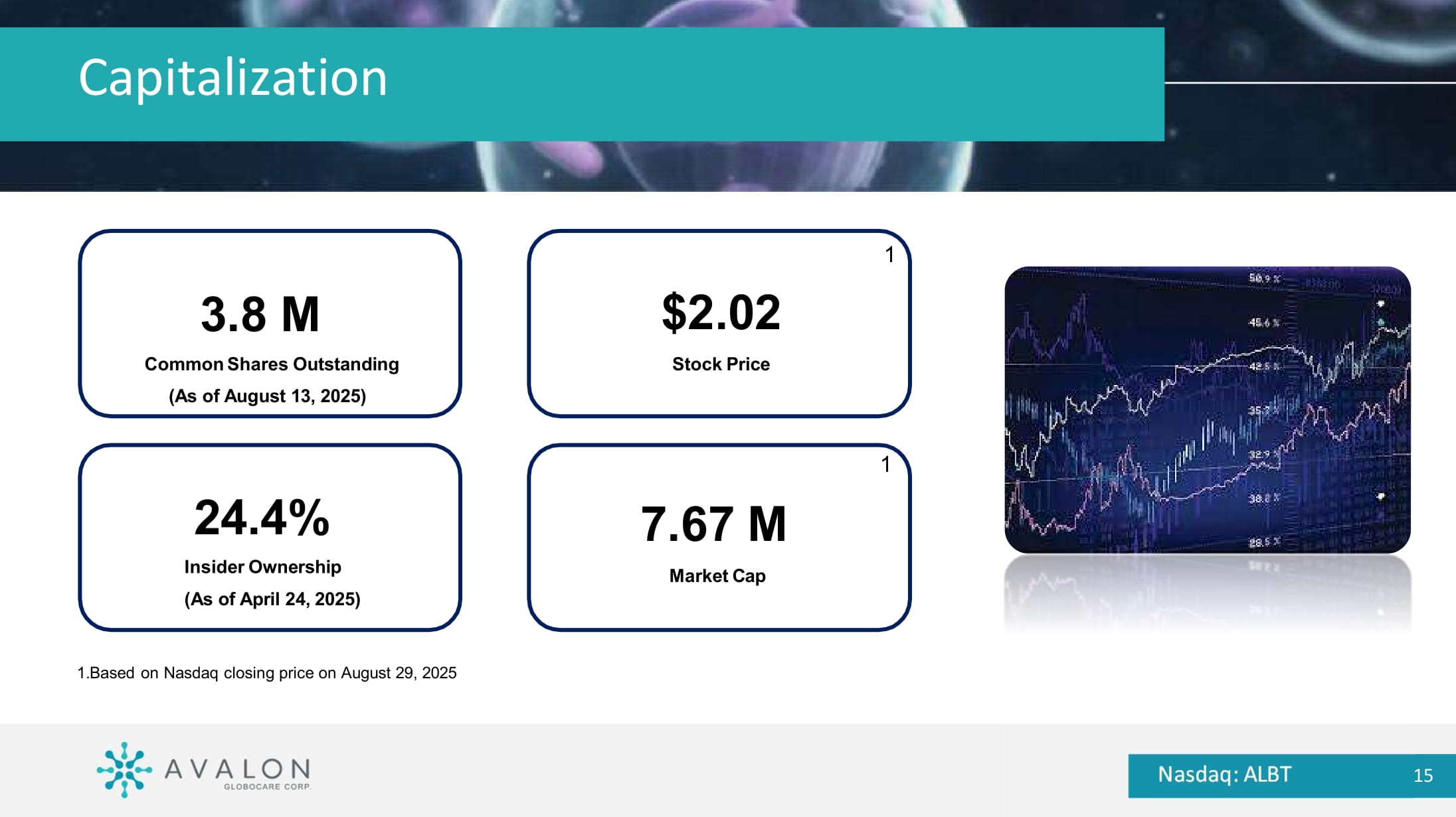 (Nasdaq: ALBT) is a developer of precision diagnostic consumer products and the advancement of intellectual property in cellular therapy. History: Founded in 2016; successfully uplisted to Nasdaq in December 2018; Headquarters in Freehold, New Jersey .