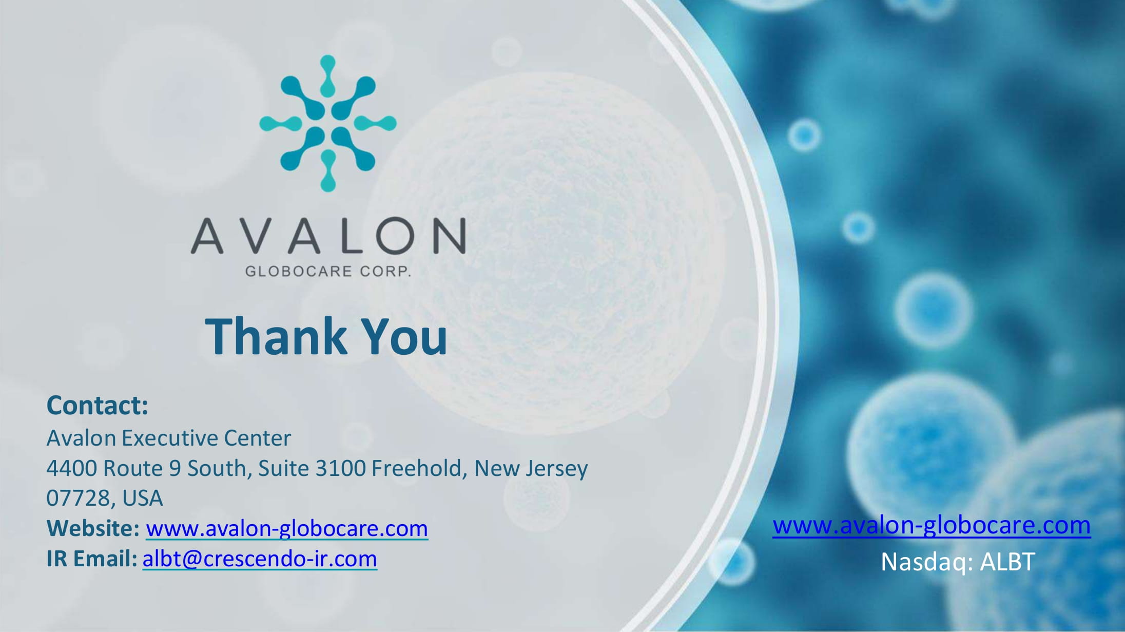 Human Health Services Capitalization 3 . 8 M Common Shares Outstanding (As of August 13, 2025) Nasdaq: ALBT 15 $ 2 . 02 Stock Price 24 . 4 % Insider Ownership (As of April 24, 2025) 7 . 67 M Market Cap 1 1 1.Based on Nasdaq closing price on August 29 , 202 5 www.avalon - globocare.com Nasdaq: ALBT Contact: Avalon Executive Center 4400 Route 9 South, Suite 3100 Freehold, New Jersey 07728, USA Website: www.avalon - globocare.com IR Email: albt@crescendo - ir.com Thank You