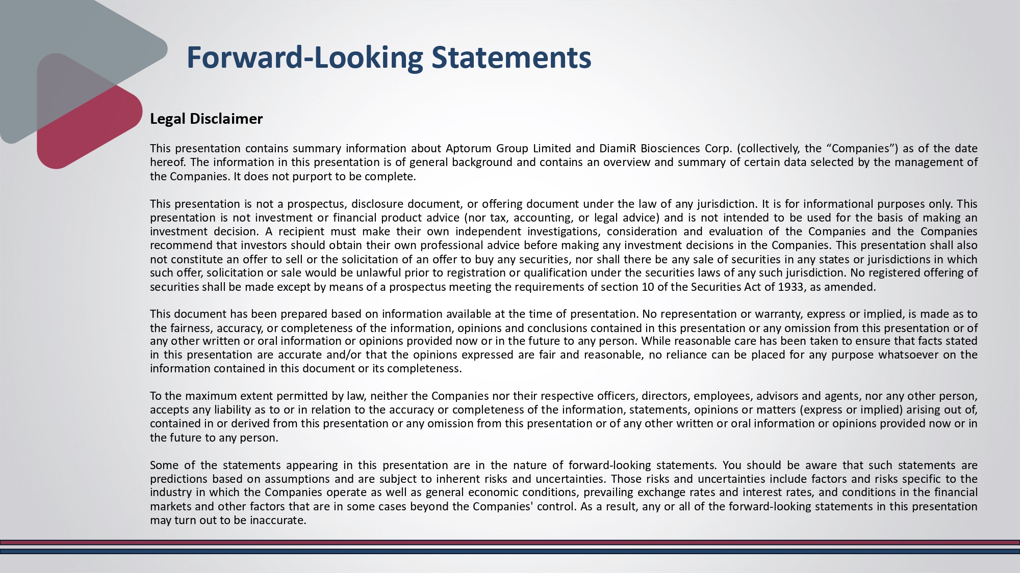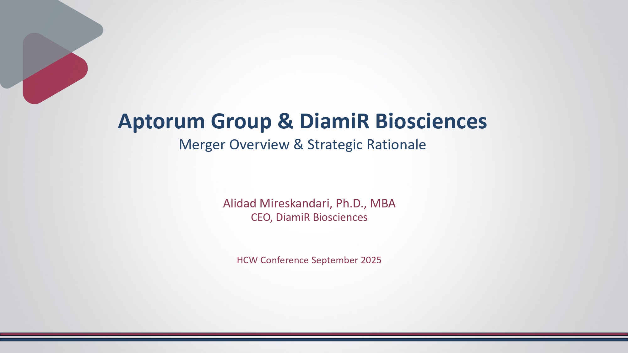 Alidad Mireskandari, Ph.D., MBA CEO, DiamiR Biosciences HCW Conference September 2025 Aptorum Group & DiamiR Biosciences Merger Overview & Strategic Rationale Forward - Looking Statements Legal Disclaimer This presentation contains summary information about Aptorum Group Limited and DiamiR Biosciences Corp . (collectively, the “Companies”) as of the date hereof . The information in this presentation is of general background and contains an overview and summary of certain data selected by the management of the Companies . It does not purport to be complete . This presentation is not a prospectus, disclosure document, or offering document under the law of any jurisdiction . It is for informational purposes only . This presentation is not investment or financial product advice (nor tax, accounting, or legal advice) and is not intended to be used for the basis of making an investment decision . A recipient must make their own independent investigations, consideration and evaluation of the Companies and the Companies recommend that investors should obtain their own professional advice before making any investment decisions in the Companies . This presentation shall also not constitute an offer to sell or the solicitation of an offer to buy any securities, nor shall there be any sale of securities in any states or jurisdictions in which such offer, solicitation or sale would be unlawful prior to registration or qualification under the securities laws of any such jurisdiction . No registered offering of securities shall be made except by means of a prospectus meeting the requirements of section 10 of the Securities Act of 1933 , as amended . This document has been prepared based on information available at the time of presentation . No representation or warranty, express or implied, is made as to the fairness, accuracy, or completeness of the information, opinions and conclusions contained in this presentation or any omission from this presentation or of any other written or oral information or opinions provided now or in the future to any person . While reasonable care has been taken to ensure that facts stated in this presentation are accurate and/or that the opinions expressed are fair and reasonable, no reliance can be placed for any purpose whatsoever on the information contained in this document or its completeness . To the maximum extent permitted by law, neither the Companies nor their respective officers, directors, employees, advisors and agents, nor any other person, accepts any liability as to or in relation to the accuracy or completeness of the information, statements, opinions or matters (express or implied) arising out of, contained in or derived from this presentation or any omission from this presentation or of any other written or oral information or opinions provided now or in the future to any person . Some of the statements appearing in this presentation are in the nature of forward - looking statements . You should be aware that such statements are predictions based on assumptions and are subject to inherent risks and uncertainties . Those risks and uncertainties include factors and risks specific to the industry in which the Companies operate as well as general economic conditions, prevailing exchange rates and interest rates, and conditions in the financial markets and other factors that are in some cases beyond the Companies' control . As a result, any or all of the forward - looking statements in this presentation may turn out to be inaccurate .