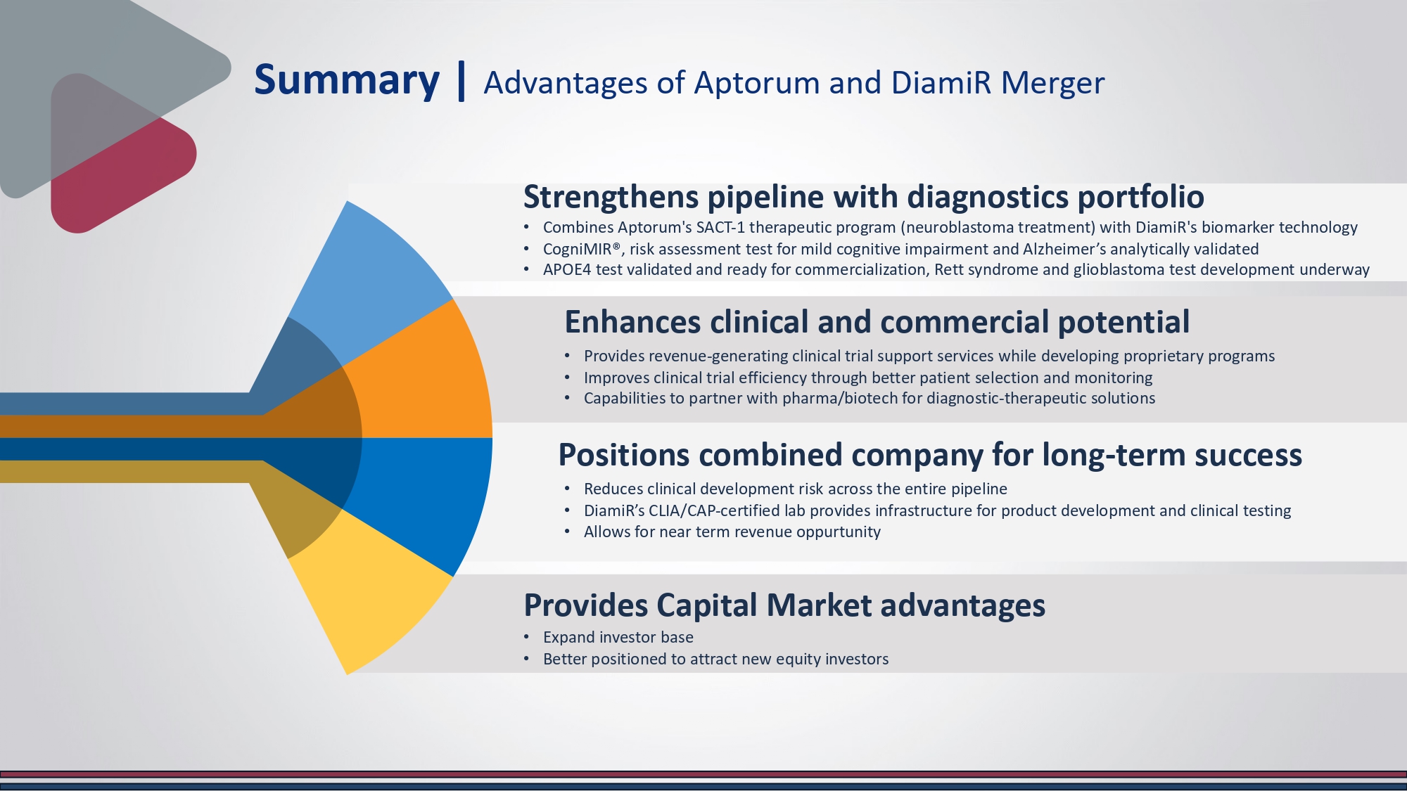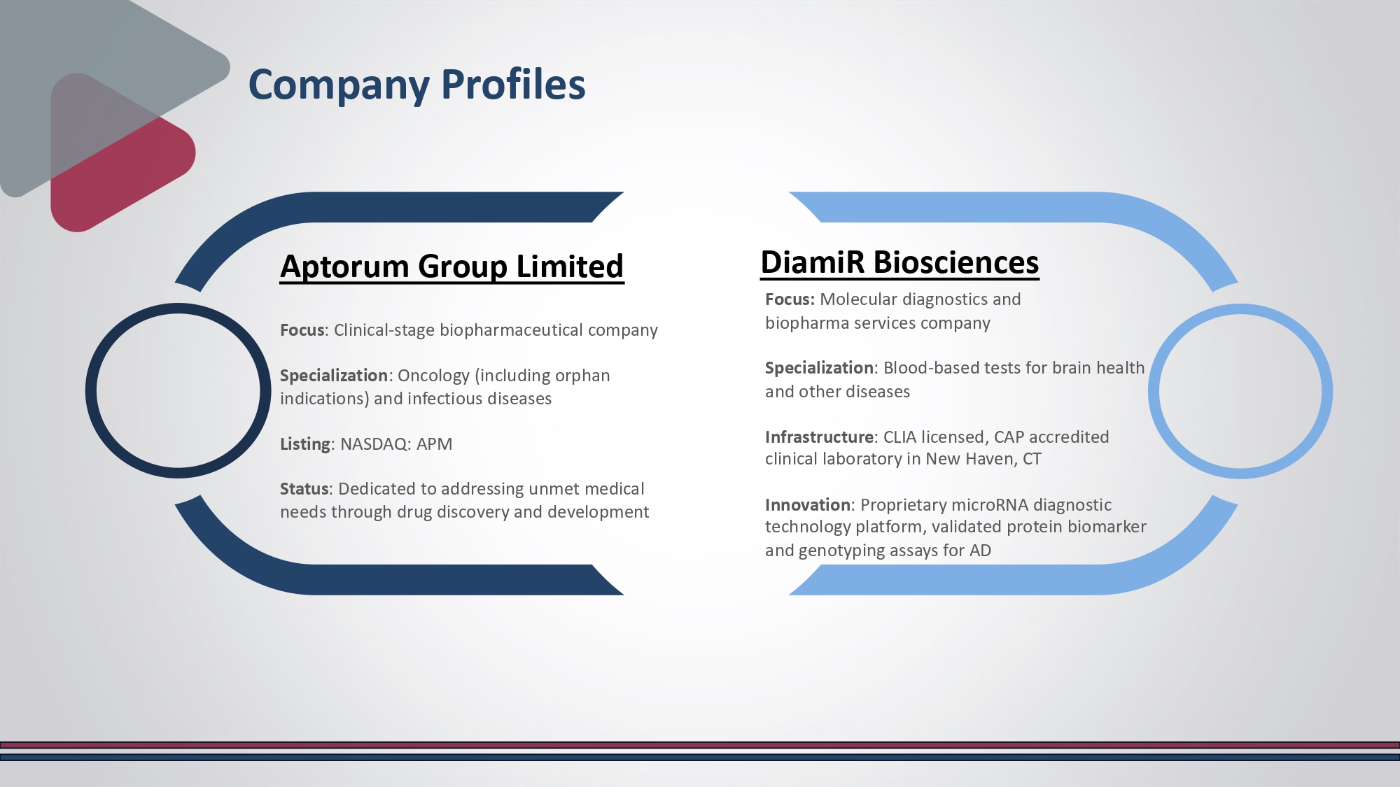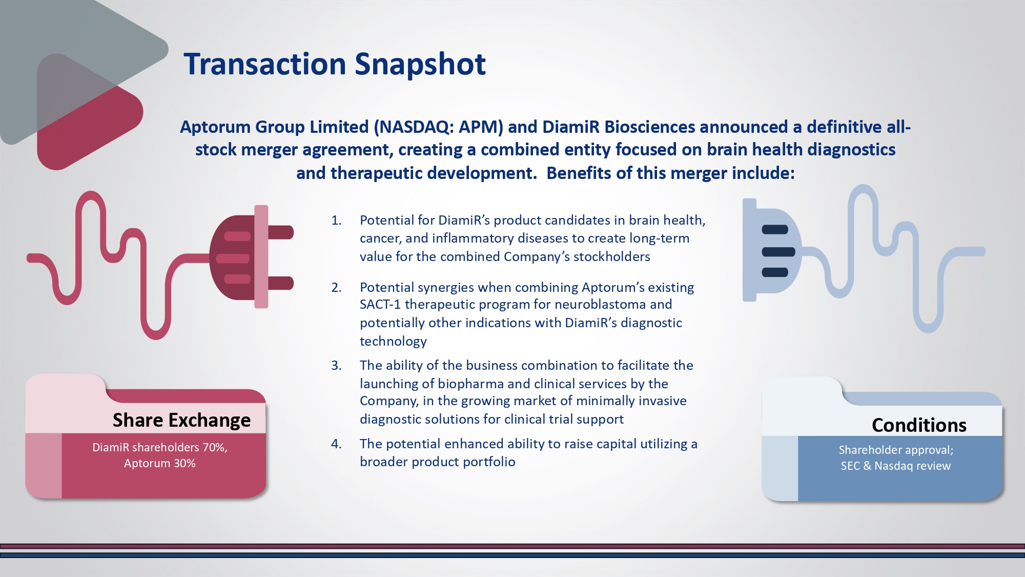 Potential for DiamiR’s product candidates in brain health, cancer, and inflammatory diseases to create long - term value for the combined Company’s stockholders 2. Potential synergies when combining Aptorum’s existing SACT - 1 therapeutic program for neuroblastoma and potentially other indications with DiamiR’s diagnostic technology 3. The ability of the business combination to facilitate the launching of biopharma and clinical services by the Company, in the growing market of minimally invasive diagnostic solutions for clinical trial support 4. The potential enhanced ability to raise capital utilizing a broader product portfolio Aptorum Group Limited (NASDAQ: APM) and DiamiR Biosciences announced a definitive all - stock merger agreement, creating a combined entity focused on brain health diagnostics and therapeutic development.