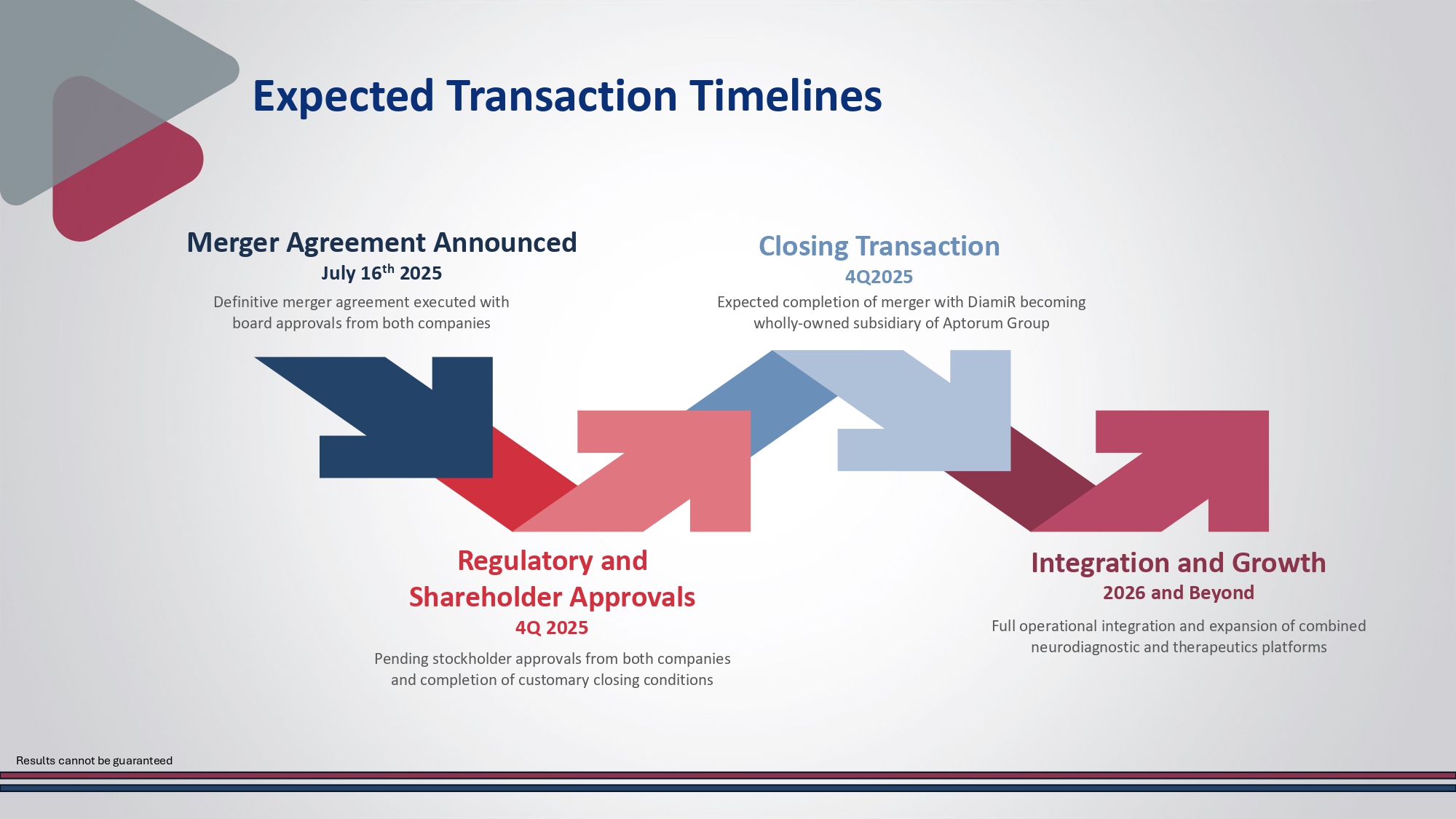 Benefits of this merger include: RS0 Expected Transaction Timelines Regulatory and Shareholder Approvals 4Q 2025 Pending stockholder approvals from both companies and completion of customary closing conditions Integration and Growth 2026 and Beyond Full operational integration and expansion of combined neurodiagnostic and therapeutics platforms Merger Agreement Announced July 16 th 2025 Definitive merger agreement executed with board approvals from both companies Closing Transaction 4Q2025 Expected completion of merger with DiamiR becoming wholly - owned subsidiary of Aptorum Group Results cannot be guaranteed RS0 Strategic Rationale Accelerate R&D Invest in high value evidence generation studies.