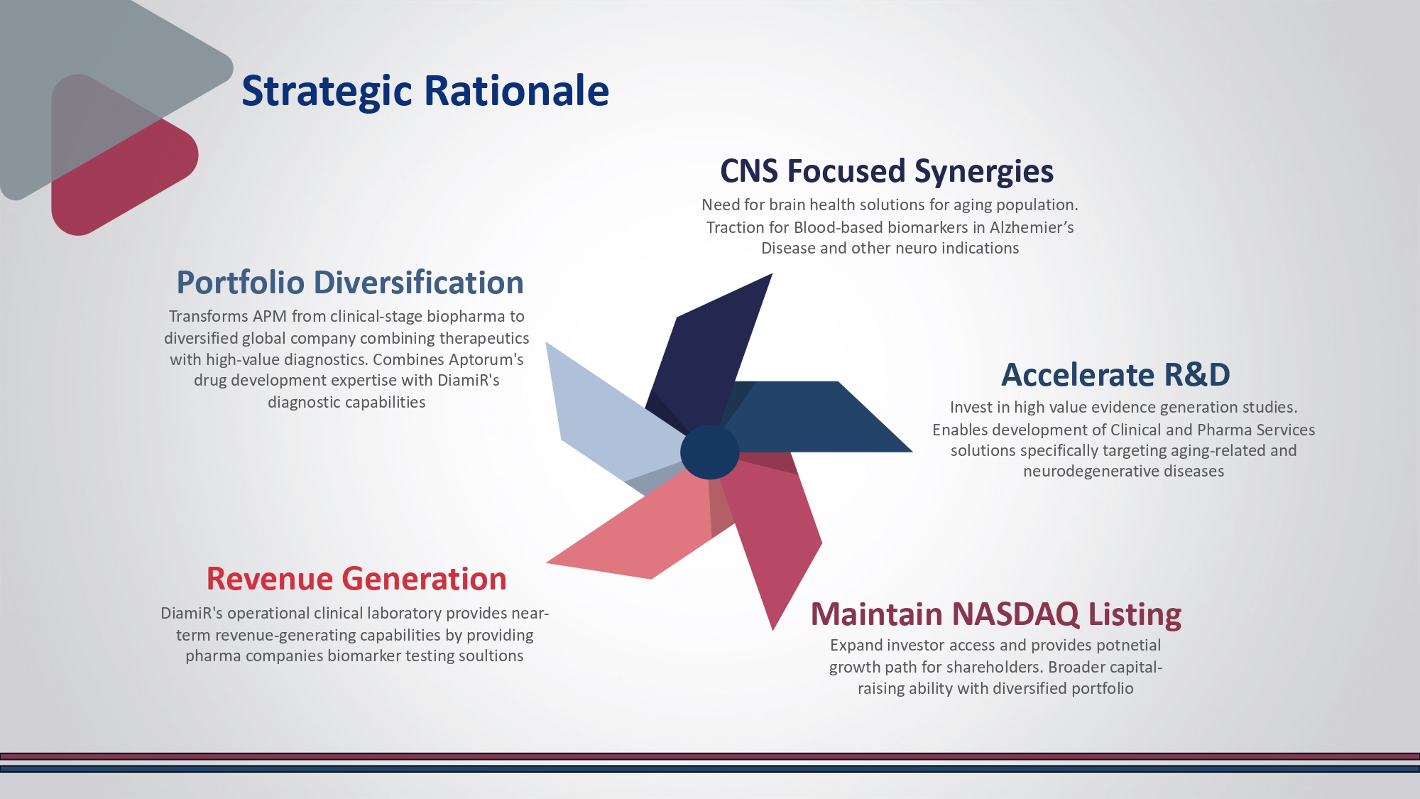 Enables development of Clinical and Pharma Services solutions specifically targeting aging - related and neurodegenerative diseases Portfolio Diversification Transforms APM from clinical - stage biopharma to diversified global company combining therapeutics with high - value diagnostics. Combines Aptorum's drug development expertise with DiamiR's diagnostic capabilities Maintain NASDAQ Listing Expand investor access and provides potnetial growth path for shareholders. Broader capital - raising ability with diversified portfolio Revenue Generation DiamiR's operational clinical laboratory provides near - term revenue - generating capabilities by providing pharma companies biomarker testing soultions CNS Focused Synergies Need for brain health solutions for aging population.