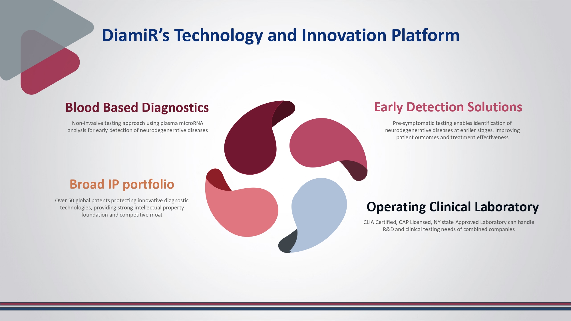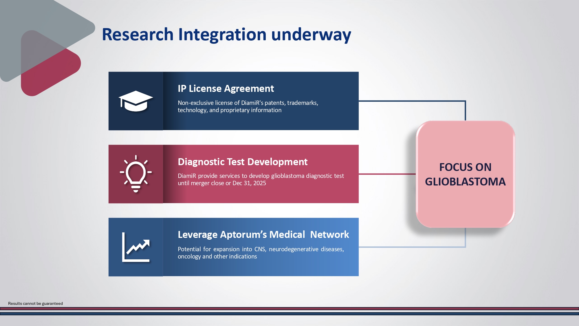 Traction for Blood - based biomarkers in Alzhemier’s Disease and other neuro indications Research Integration underway FOCUS ON GLIOBLASTOMA IP License Agreement Non - exclusive license of DiamiR's patents, trademarks, technology, and proprietary information Diagnostic Test Development DiamiR provide services to develop glioblastoma diagnostic test until merger close or Dec 31 , 2025 Leverage Aptorum’s Medical Network Potential for expansion into CNS, neurodegenerative diseases, oncology and other indications Results cannot be guaranteed DiamiR’s Technology and Innovation Platform Operating Clinical Laboratory CLIA Certified, CAP Licensed, NY state Approved Laboratory can handle R&D and clinical testing needs of combined companies Early Detection Solutions Pre - symptomatic testing enables identification of neurodegenerative diseases at earlier stages, improving patient outcomes and treatment effectiveness Blood Based Diagnostics Non - invasive testing approach using plasma microRNA analysis for early detection of neurodegenerative diseases Broad IP portfolio Over 50 global patents protecting innovative diagnostic technologies, providing strong intellectual property foundation and competitive moat
