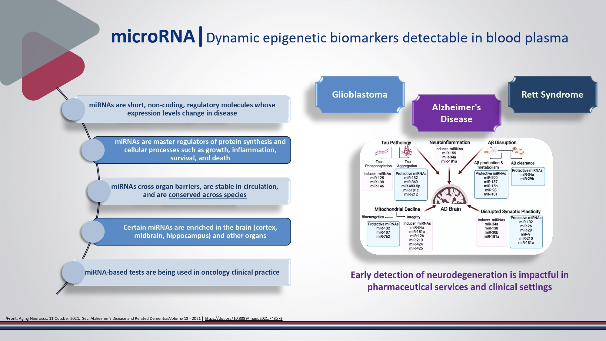microRNA | Dynamic epigenetic biomarkers detectable in blood plasma miRNAs are short , non - coding, regulatory molecules whose expression levels change in disease miRNAs are master regulators of protein synthesis and cellular processes such as growth, inflammation, survival, and death miRNAs cross organ barriers, are stable in circulation, and are conserved across species Certain miRNAs are enriched in the brain (cortex, midbrain, hippocampus) and other organs miRNA - based tests are being used in oncology clinical practice ( Front. Aging Neurosci., 11 October 2021. Sec.