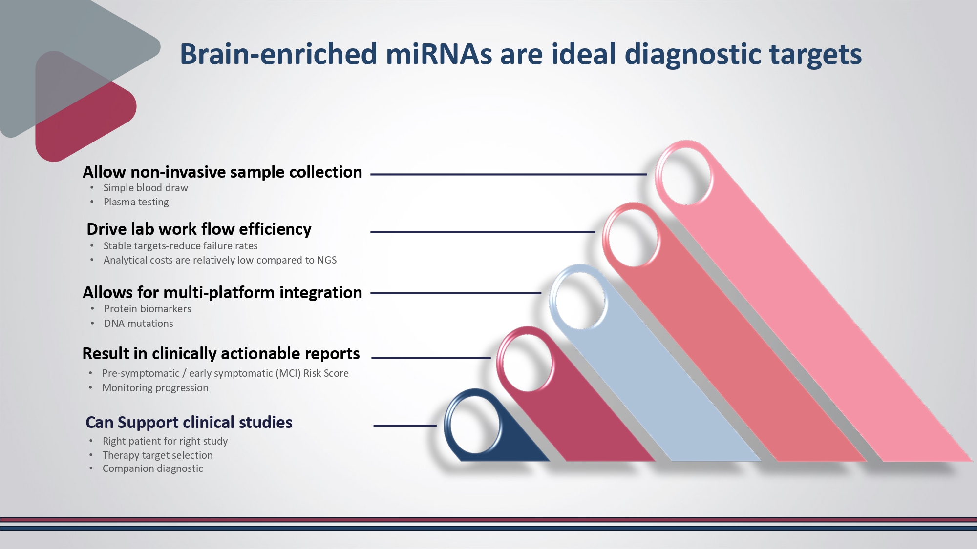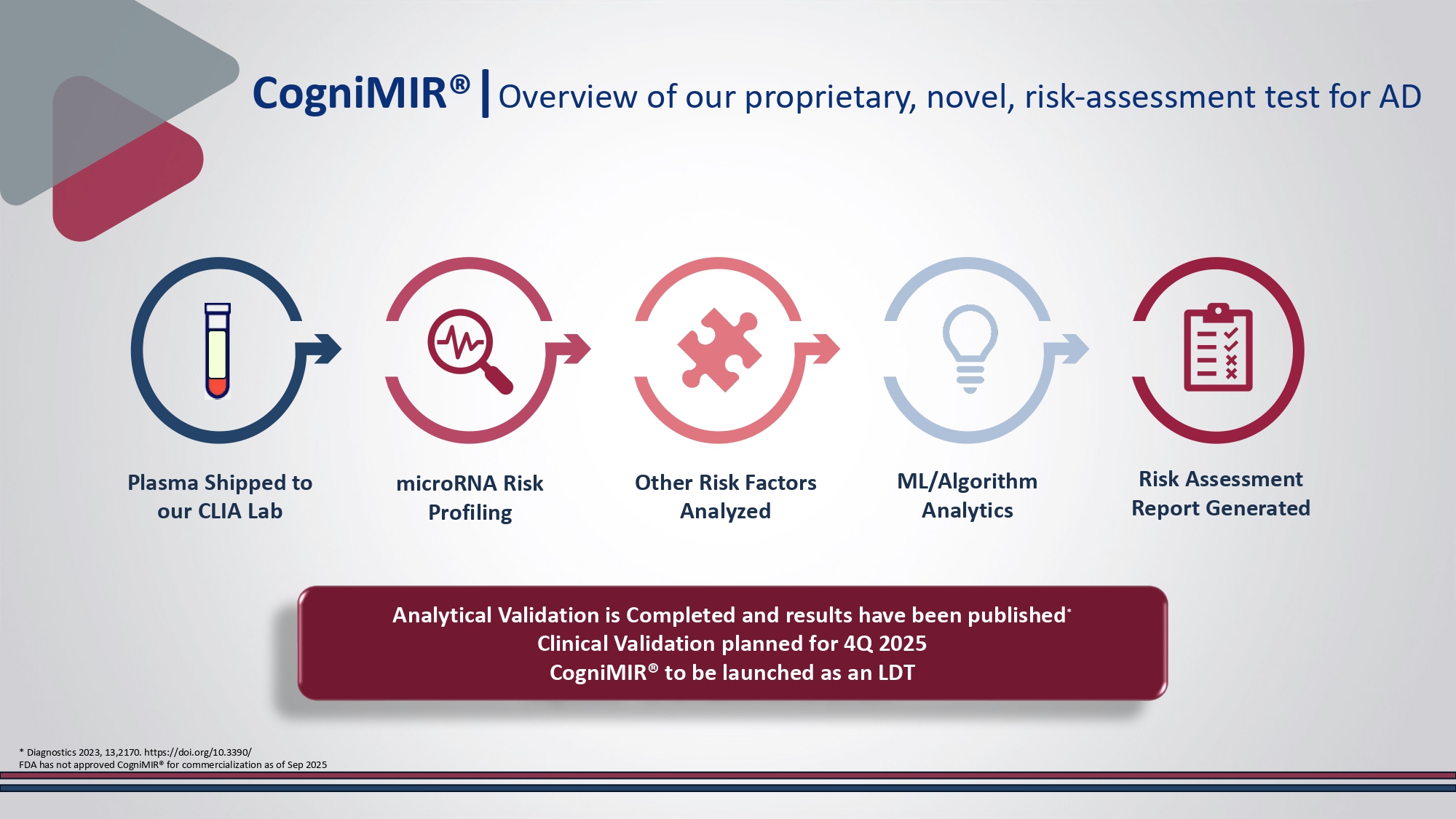 Alzheimer's Disease and Related DementiasVolume 13 - 2021 | https://doi.org/10.3389/fnagi.2021.743573 Alzheimer's Disease Glioblastoma Rett Syndrome • Simple blood draw • Plasma testing Brain - enriched miRNAs are ideal diagnostic targets Can Support clinical studies • Right patient for right study • Therapy target selection • Companion diagnostic Result in clinically actionable reports • Pre - symptomatic / early symptomatic (MCI) Risk Score • Monitoring progression Allows for multi - platform integration • Protein biomarkers • DNA mutations Drive lab work flow efficiency • Stable targets - reduce failure rates • Analytical costs are relatively low compared to NGS Allow non - invasive sample collection CogniMIR® | Overview of our proprietary, novel, risk - assessment test for AD * Diagnostics 2023, 13,2170.