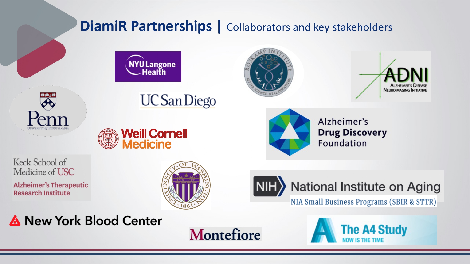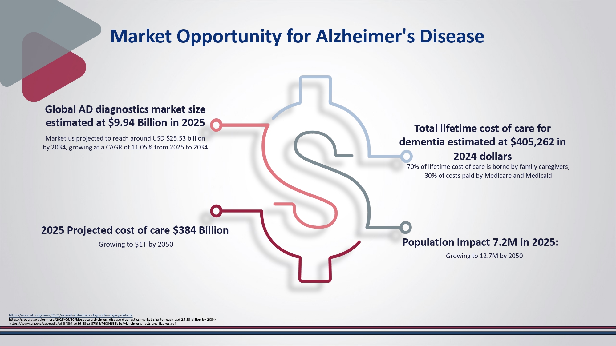 https://doi.org/10.3390/ FDA has not approved CogniMIR® for commercialization as of Sep 2025 Plasma Shipped to our CLIA Lab microRNA Risk Profiling Other Risk Factors Analyzed ML/Algorithm Analytics Risk Assessment Report Generated Analytical Validation is Completed and results have been published * Clinical Validation planned for 4Q 2025 CogniMIR® to be launched as an LDT RS0 Market Opportunity for Alzheimer's Disease Global AD diagnostics market size estimated at $9.94 Billion in 2025 Market us projected to reach around USD $25.53 billion by 2034, growing at a CAGR of 11.05% from 2025 to 2034 Population Impact 7.2M in 2025: Growing to 12.7M by 2050 Total lifetime cost of care for dementia estimated at $405,262 in 2024 dollars 70% of lifetime cost of care is borne by family caregivers; 30% of costs paid by Medicare and Medicaid 2025 Projected cost of care $384 Billion Growing to $1T by 2050 https://www.alz.org/getmedia/ef8f48f9 - ad36 - 48ea - 87f9 - b74034635c1e/Alzheimer's - facts - and - figures.pdf https://www.alz.org/news/2024/revised - alzheimers - diagnostic - staging - criteria https://globalalzplatform.org/2025/06/30/biospace - alzheimers - disease - diagnostics - market - size - to - reach - usd - 25 - 53 - billion - by - 2034/ RS0 DiamiR Partnerships | Collaborators and key stakeholders