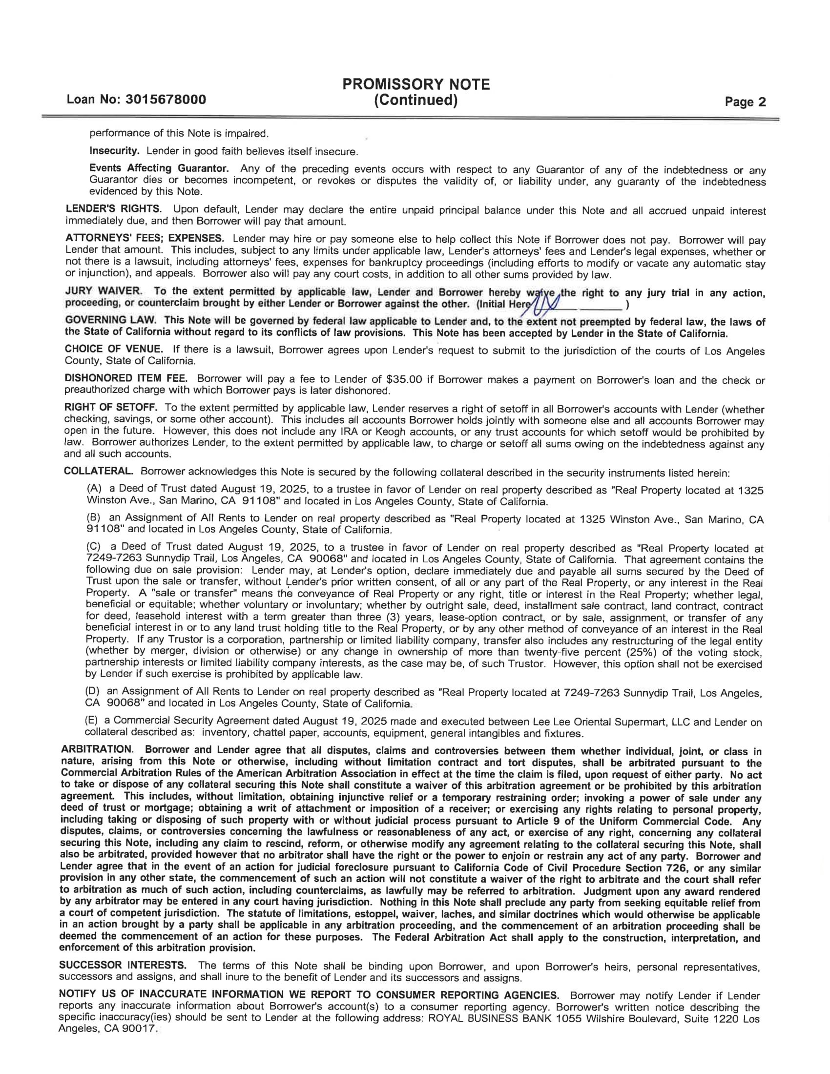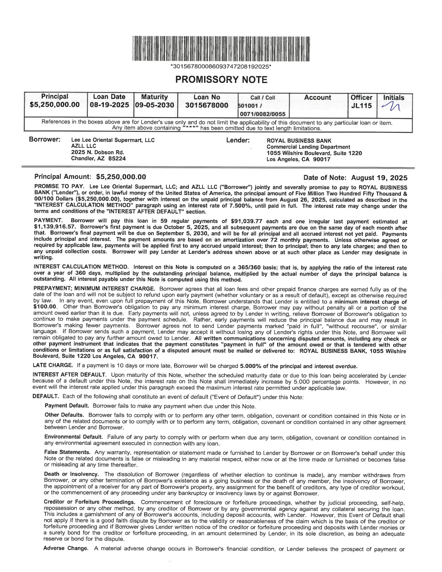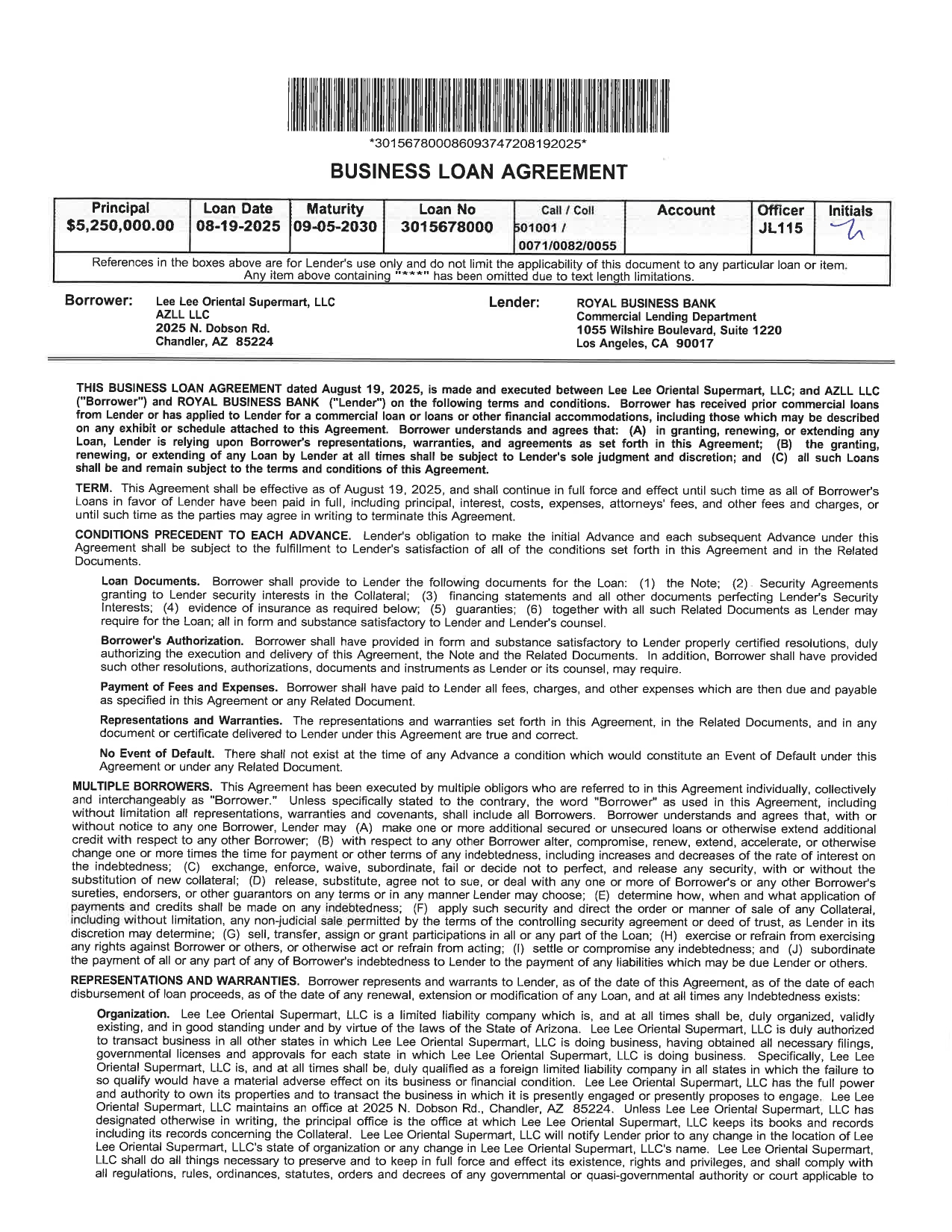 ROYAL BUSINESS BANK Lender: Borrower: Lee Lee Oriental Supermart, LLc Commercial Lending Department AZLL LLC 1055 Wilshire Boulevard, Suite 1220 2025 N. Dobson Rd. Los Angeles, CA 90017 Chandler, AZ 85224 Initials Officer JL115 Account caM / caii 501001 / 0071/0082/0055 Loan No 3015678000 Maturtty 09 - 05 - 2030 Loan Date 08 - 19 - 2025 Principal $S,250,OOO.00 References in the boxes above are for Lender's use only and do not limit the applicability of this document to any particular loan or item. Any item above containing "”””" has been omitted due to text length limitations. *301567800086093747208192025* BUSINESS LOAN AGREEMENT THIS BUSINESS LOAN AGREEMENT dated August 19 , 2025 , is made and executed between Lee Lee Oriental Supermart, LLC ; and AZLL LLC ("Borrower") and ROYAL BUSINESS BANK ("Lender") on the following terms and conditions . Borrower has received prior commercial loans from Lender or has applied to Lender for a commercial loan or loans or other financial accommodations, including those which may be described on any exhibit or schedule attached to this Agreement . Borrower understands and agrees that : (A) in granting, renewing, or extending any Loan, Lender is relying upon Borrower's representations, warranties, and agreements as set forth in this Agreement ; (B) the granting, renewing, or extending of any Loan by Lender at all times shall be subject to Lender's sole judgment and discretion ; and (C) all such Loans shall be and remain subject to the terms and conditions of this Agreement . TERM . This Agreement shall be effective as of August 19 , 2025 , and shall continue in full force and effect until such time as all of Borrower's Loans in favor of Lender have been paid in full, including principal, interest, costs, expenses, attorneys' fees, and other fees and charges, or until such time as the parties may agree in writing to terminate this Agreement . CONDITIONS PRECEDENT TO EACH ADVANCE . Lender's obligation to make the initial Advance and each subsequent Advance under this Agreement shall be subject to the fulfillment to Lender's satisfaction of all of the conditions set forth in this Agreement and in the Related Documents . Loan Documents . Borrower shall provide to Lender the following documents for the Loan : ( 1 ) the Note ; ( 2 ) Security Agreements granting to Lender security interests in the Collateral ; ( 3 ) financing statements and all other documents perfecting Lender's Security Interests ; ( 4 ) evidence of insurance as required below ; ( 5 ) guaranties ; ( 6 ) together with all such Related Documents as Lender may require for the Loan ; all in form and substance satisfactory to Lender and Lender's counsel . Borrower's Authorization . Borrower shall have provided in form and substance satisfactory to Lender properly certified resolutions, duly authorizing the execution and delivery of this Agreement, the Note and the Related Documents . In addition, Borrower shall have provided such other resolutions, authorizations, documents and instruments as Lender or its counsel, may require . Payment of Fees and Expenses . Borrower shall have paid to Lender all fees, charges, and other expenses which are then due and payable as specified in this Agreement or any Related Document . Representations and Warranties . The representations and warranties set forth in this Agreement, in the Related Documents, and in any document or certificate delivered to Lender under this Agreement are true and correct . No Event of Default . There shall not exist at the time of any Advance a condition which would constitute an Event of Default under this Agreement or under any Related Document . MULTIPLE BORROWERS . This Agreement has been executed by multiple obligors who are referred to in this Agreement individually, collectively and interchangeably as "Borrower . " Unless specifically stated to the contrary, the word "Borrower" as used in this Agreement, including without limitation all representations, warranties and covenants, shall include all Borrowers . Borrower understands and agrees that, with or without notice to any one Borrower, Lender may (A) make one or more additional secured or unsecured loans or otherwise extend additional credit with respect to any other Borrower ; (B) with respect to any other Borrower alter, compromise, renew, extend, accelerate, or otherwise change one or more times the time for payment or other terms of any indebtedness, including increases and decreases of the rate of interest on the indebtedness ; (C) exchange, enforce, waive, subordinate, fail or decide not to perfect, and release any security, with or without the substitution of new collateral ; (D) release, substitute, agree not to sue, or deal with any one or more of Borrower's or any other Borrower's sureties, endorsers, or other guarantors on any terms or in any manner Lender may choose ; (E) determine how, when and what application of payments and credits shall be made on any indebtedness ; (F) apply such security and direct the order or manner of sale of any Collateral, including without limitation, any non - judicial sale permitted by the terms of the controlling security agreement or deed of trust, as Lender in its discretion may determine ; (G) sell, transfer, assign or grant participations in all or any part of the Loan ; (H) exercise or refrain from exercising any rights against Borrower or others, or otherwise act or refrain from ac : ting ; (I) settle or compromise any indebtedness ; and (J) subordinate the payment of all or any part of any of Borrower's indebtedness to Lender to the payment of any liabilities which may be due Lender or others . REPRESENTATIONS AND WARRANTIES . Borrower represents and warrants to Lender, as of the date of this Agreement, as of the date of each disbursement of loan proceeds, as of the date of any renewal, extension or modification of any Loan, and at all times any Indebtedness exists : Organization . Lee Lee Oriental Supermart, LLC is a 