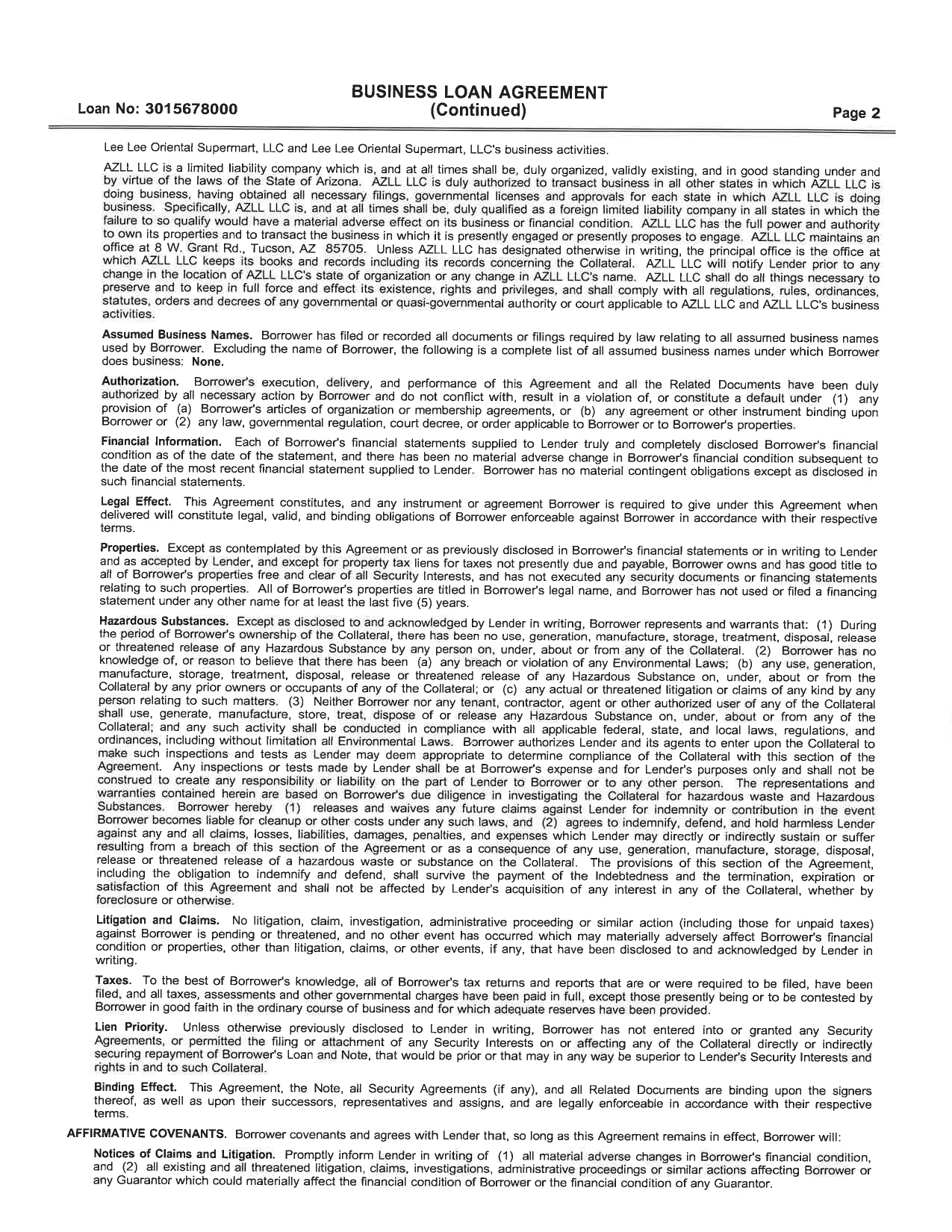Lee Lee Oriental Supermart, LLC shall do all things necessary to preserve and to keep in full force and effect its existence, rights and privileges, and shall comply with all regulations, rules, ordinances, statutes, orders and decrees of any governmental or quasi - governmental authority or court applicable to Loan No: 3015678000 BUSINESS LOAN AGREEMENT (Continued) Lee Lee Oriental Supermart, LLC and Lee Lee Oriental Supermart, LLC's business activities . AZLL LLC ìS a limited liability company which is, and at all times shall be, duly organized, validly existing, and in good standing under and by virtue of the laws of the State of Arizona . AZLL LLC is duly authorized IO transact business in all other slates in which AZLL LLC is doing business, having oblafned all necessary filings, governmental flcan 6 e 6 and approvaTs far each state in which AZLL LLC Ts doing busìneaa Specifîœlly, AZLL LLC is, and at all times shall be, duly quallfied as ą foraign Ilm)ted liability œmpany in all ststes Tn which the failure to so qualify would have a matariaJ adverse effect on its business or financial œnditton . AZLL UC has fhe fu)ł power and authońty to own its properties and to transact the businœs in which it is prc›æntIy engaged ar presenüy proposes to engage . AZLL LLC maintains an offiœ at 8 W . Grant Rd . , Tucson, AZ 85705 . Unless AZLL LLC has designated otherwise in writing, the principal office is the office at which AZLL LLC keeps its ôooks and records including its mœrds œnœming the Collateral . AZLL LLC will notify Lender priœ to any change In the location of AZLL LLC's state of organization or any change in AZLL LLC's name . AZLL LLC shall do all fhings necessary to presarve and to keep In fuìì force and affect its existence, rights and pñvTleges, and shall comply with all ægulatlons . rutes, ordinances . statutes, orders and decrees of any governmental or quasl - governmental authority or court applicable to AZLL LLC and AZLL LLC's business activities . Assumed Business Names . Borrower has filed or recorded all documents or filings required by law relating to all assumed business names used by BOrrower . Excluding the name of Borrower, the following is a complete list of all assumed business names under which Borrower does busirłøss : None . Authorization . Borrower's execution, delivery, and performance of this Agæement and all the Related Documents have been duly authorized by all necessary action by Borrower and do not conflict with, result in a violation of, or constitute a default under ( 1 ) any provision of (a) Borrower's articles of organization or membership agreements, or (b) any agreement or other instrument binding upon Borrower or ( 2 ) any law, governmental regulation, court decree, or order applicable to Borrower or to Borrower's properties . Financial Information . Each of Borrower's financial statements supplied to Lender truly and completely disclosed Borrower's financial condition as of the date of the statement, and there has been no material adverse change in Borrower's financial condition subsequent to the date of the most recent financial statement supplied to Lender . Borrower has no material contingent obligations except as disclosed in such financial statements . Legal Effect . This Agreement constitutes, and any instrument or agreement Borrower is required to give under this Agreement when delivered will constitute legal, valid, and binding obligations of Borrower enforceable against Borrower in accordance with their respective terms . Properties . Except as contemplated by this Agreement or as previously disclosed in Borrower's financial statements or in writing to Lender and as accepted by Lender, and except for ğropølty tax liens for taxes not presently due and payable, Borrower owns and has good title to all of BorfoWer's properties free and ctear of all Security Interests, and has not executed any sacUrity documents or finanÒng statements relating to such properties . All of Borrower's properties are titled in Borrower's legal name, and Borrower has not used or filed a financing statement under any other name for at least the last five ( 5 ) years . Hazardous Substances . Excapt as disclosed to and acknowledged by Lender in writing, Borrower represents and warrants that : ( 1 ) During the period of BołYower's ownership of (he Collatœel, there has been no use, generation, manufacture, storage, treatment, disposal, release or threatened release of any Hazardous Substance by any person on, under, about or from any of the Collateral . ( 2 ) Borrower has no knowledge of , or reason to believe that theæ has been (a) any breach or violation of any Enviænmentał Laws ; (b) any use, generation, manufacture, storage, treatment, disposal, release or threatened release of any Hazardous Substance on, under, about or from the Collateral by any prior owners or occupants of any of the Collateral ; or (c) any actual or threatened litigation or claims of any kind by any person relating to such matters . ( 3 ) Neither Borrower nor any tenant, contfaØor, agent Œ Other authorİzed usar of any of the Collateral 8 ha \ I use, generate, manufacture, store, treat, dispose of or release any Hazardous Substance on, undar, about or from any of the Collateral ; and any such activity Ghal) be œnduCłed in compliance with all applicable federal, state, and local laws, regulations, and ordinances, including without limitation all Envirorimantal Laws . Borrower authorizes Lender and its agents to enter upon the Collateral to make such inspections and tests as Lender may deem appropriate to determine compliance of the Collateral with this section of the Agæement . Any inspections or tests made by Lender shal) be at Borrower's expense and for Lender's purposes only and shall not be œnatrued to craate any rasponsibilTty or liability on the part of Lender Ø Borrower or to any other person . The rapæsantations and waræntlea contained heæin are Da