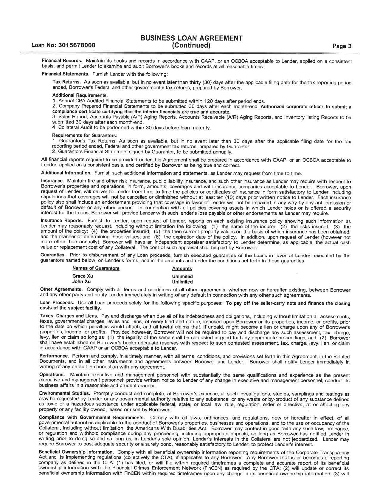 Maintain its books and records in accordance with GAAP, or an OCBOA acceptable to Lender, applied on a consistent basis, and permit Lender to examine and audit Borrower's books and records at all reasonable times. Financial Statements. Furnish Lender with the following: Tax Returns. As soon as available, but in no event later than thirty (30) days after the applicable filing date for the tax reporting period ended, Borrower's Federal and other governmental tax returns, prepared by Borrower. Additional Requirements. 1. Annual CPA Audited Financial Statements to be submitted within 120 days after period ends. 2. Company Prepared Financial Statements to be submitted 30 days after each month - end. Authorized corporate officer to submit a compliance certificate certifying that the interim financials are true and accurate. 3. Sales Report, Accounts Payable (A/P) Aging Reports, Accounts Receivable (A/R) Aging Reports, and Inventory listing Reports to be submitted 30 days after each month - end. 4. Collateral Audit to be performed within 30 days before loan maturity. Requirements for Guarantors: 1. Guarantor's Tax Returns. As soon as available, but in no event later than 30 days after the applicable filing date for the tax reporting period ended, Federal and other government tax returns, prepared by Guarantor. 2. Guarantors Financial Statement signed by Guarantor, to be submitted annually. All financial reports required to be provided under this Agreement shall be prepared in accordance with GAAP, or an OCBOA acceptable to Lender, applied on a consistent basis, and certified by Borrower as being true and correct . Additional Information . Furnish such additional information and statements, as Lender may request from time to time . Insurance . Maintain fire and other risk insurance, public liability insurance, and such other insurance as Lender may require with respect to Borrower's properties and operations, in form, amounts, coverages and with insurance companies acceptable to Lender . Borrower, upon request of Lender, will deliver to Lender from time to time the policies or certificates of insurance in form satisfactory to Lender, including stipulations that coverages will not be cancelled or diminished without at least ten ( 10 ) days prior written notice to Lender . Each insurance policy also shall include an endorsement providing that coverage in favor of Lender will not be impaired in any way by any act, omission or default of Borrower or any other person . In connection with all policies covering assets in which Lender holds or is offered a security interest for the Loans, Borrower will provide Lender with such lender's loss payable or other endorsements as Lender may require . Insurance Reports . Furnish to Lender, upon request of Lender, reports on each existing insurance policy showing such information as Lender may reasonably request, including without limitation the following : ( 1 ) the name of the insurer ; ( 2 ) the risks insured ; ( 3 ) the amount of the policy ; ( 4 ) the properties insured ; ( 5 ) the then current property values on the basis of which insurance has been obtained, and the manner of determining those values ; and ( 6 ) the expiration date of the policy . In addition, upon request of Lender (however not more often than annually), Borrower will have an independent appraiser satisfactory to Lender determine, as applicable, the actual cash value or replacement cost of any Collateral . The cost of such appraisal shall be paid by Borrower . Guaranties . Prior to disbursement of any Loan proceeds, furnish executed guaranties of the Loans in favor of Lender, executed by the guarantors named below, on Lender's forms, and in the amounts and under the conditions set forth in those guaranties . Names of Guarantors Grace Xu John Xu Amounts Unlimited Unlimited Other Agreements . Comply with all terms and conditions of all other agreements, whether now or hereafter existing, between Borrower and any other party and notify Lender immediately in writing of any default in connection with any other such agreements . Loan Proceeds . Use all Loan proceeds solely for the following specific purposes : To pay off the seller - carry note and finance the closing costs of the subject facility . Taxes, Charges and Liens . Pay and discharge when due all of its indebtedness and obligations, including without limitation all assessments, taxes, governmental charges, levies and liens, of every kind and nature, imposed upon Borrower or its properties, income, or profits, prior to the date on which penalties would attach, and all lawful claims that, if unpaid, might become a lien or charge upon any of Borrower's properties, income, or profits . Provided however, Borrower will not be required to pay and discharge any such assessment, tax, charge, levy, lien or claim so long as ( 1 ) the legality of the same shall be contested in good faith by appropriate proceedings, and ( 2 ) Borrower shall have established on Borrower's books adequate reserves with respect to such contested assessment, tax, charge, levy, lien, or claim in accordance with GAAP or an OCBOA acceptable to Lender . Performance . Perform and comply, in a timely manner, with all terms, conditions, and provisions set forth in this Agreement, in the Related Documents, and in all other instruments and agreements between Borrower and Lender . Borrower shall notify Lender immediately in writing of any default in connection with any agreement . Operations . Maintain executive and management personnel with substantially the same qualifications and experience as the present executive and management personnel ; provide written notice to Lender of any change in executive and management personnel ; conduct its business affairs in a reasonable and prudent manner . Environmental Studies . Promptly conduct and complete, at Borrower's expense, all such investigations, studies, samplings and testings as may be requested by Lender or any governmental a