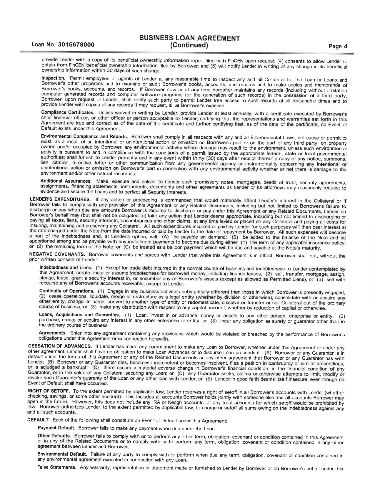 Any Borrower that is or becomes a reporting company as defined in the CTA : ( 1 ) has filed, or will file within required timeframes a complete and accurate report of its beneficial ownership information with the Financial Crimes Enforcement Network (FinCEN) as required by the CTA ; ( 2 ) will update or correct its beneficial ownership information with FinCEN within required timeframes upon any change in its beneficial ownership information ; ( 3 ) will Loan No: 3015678000 BUSINESS LOAN AGREEMENT (Continued) Page 4 provide Lender vvilh a copy of its beneficial ownership information report filed with FinCEN upon request, ( 4 ) consents to allow Lender to obtain from FinGEN beneficial ownership information filed by Borrower ; and ( 5 ) will notify Lender in writing of any change in its beneficial ownership information witnin 30 days of such change . lnapection . Permit employees or agents of Lender at any raasonabte time to inspect any and all Collateral for the Loan or LOans and Borrower's other properties and to examine or audit Borrower's books, accounts, and records and to make copies and memoranda of Borrower's books, accounts, and records . If Borrower now or at any time hereafter maintains any records (including without limitation computer generated records and computer software programs for the generation of such records) in the possession of a third party, Borrower, upon request of Lender, shall notify such party to permit Lender free access to such records at all reasonable times and to provide Lender with copies of any records it may request, all at Borrower's expense . Compliance Certificates . Unless waived in writing by Lendar, provide Lender al least annually, with a certificate executed by Borrower's chief financial officer, or other oPicer or person acceptable to Lender, certifying that the representations and warranties set forth in lhis Agreement are true and correct as of the date of the certificate and further certifying that, as of lhe dale of lhe certificate, no Evenl of Default exists under this Agreement . Environmental Compliance and Reports . Borro ver shall comply in all respects with any and all Environmental Laws ; not cause or permit to exisl, as a result of an intentional or unintentional action or omi •: sio n on Borrower's part or on the part of any third party, on property owned and/or occupied by Borrower, any environmental activity where damage may result to the environment, unless such environmental activity is pursuant to and in compliance with the conditions of a permit issued by the appropriate federal, state or local governmental authorities, shall furnish to Lander promptly and in any event within thirty ( 30 ) days aher re ¢ ›aipt thereof a copy of any notice, summons, lien, citation, directive, letter or other communication from any governmental agency or instrumentality concerning any intentional or unintentional action or omission on Borrower's part in connection with any environmental activity whether or not lhere is damage to the environment and/or other natural resources . Additional Assurances . Make, execute and deliver to Lender such promissory notes, mortgages, deeds of trust, security agreements, assignments, financing statements, instruments, documents and other agreements as Lender or ils attorneys may reasonably request to evidence and secure the Loans and to perfect all Security Interests . LENDER'S EXPENDITUREs . ir any action or proceeding is commenced that would materially affect Lender's interest in the Collateral or if Borrower fails fo compiy with any provision of this Agreement or any Related Documents, including but not limited to Borrowers failure to discharge or pay when due any amounts Borrower is required to discharge or pay under this Agreement or any Related Dcicuments, Lender on Borrower's behalf may (but shall not De obligated to) take any action that Lencler deems appropriate, including but not limited to discharging or paying all taxes, liens, security interests, encumbrances and other claims, at any time levied or placed on any Collateral and paying all costs for insuring, maintaining and preserving any Collateral . All such expenditures incurred or paid by Lender for such purposes will than bear inleresl at the rate charged under Iha No(a from the date incurred or paid by Lender to the date of repayment by Borrower . All such expenses will become a part of )he indebtedness and, a \ Lender's option, will (A) be payable on demand : ( 8 ) be added to the balance of the Note and be apportioned among and be payable with any installment payments to become due during eilher ( 1 ) the term of any applicable insurance policy ; or ( 2 ) the remaining term of the Noie : or (C) be treated as a balloon payment which will be due and payable at the Note's maturi \ y . NEGATIVE COVENANTS . Borrower covenants and agrees with Lender that while this Agreement is in effect, Borrower shall not, without the grior written consent of Lender : Indebtedness and Liens . { 1 ) Ercept for trade debl incurred in lhe normal course of business and indebtedness to Lender contemplated by this Agreement, create, incur or assume indebtedness for borrowed money, including finance leases . ( 2 ) sell, transfer, mortgage, assign, pledge, lease, grant a security interest in, or encumber any of Borrower's assets (except as allowed as Permitted Liens), or ( 3 ) sell with recourse any of Borrower's accciunts receivable, except to Lender . Continuity of Operations . ( 1 ) Engage in any business activities su bslantially different than those in which Borrower is presently engaged . { 2 ) cease operations, liquidate, merge or restructure as a legal entity (whether by division or otherwise), consolidate with or acquire any other e ntiry, change its name, convert to another type of enti \ y or redomeslicate . dissolve or transfer or sell Collateral out of the ordinary course of business . or ( 3 ) make any distribution with respect to any capital account