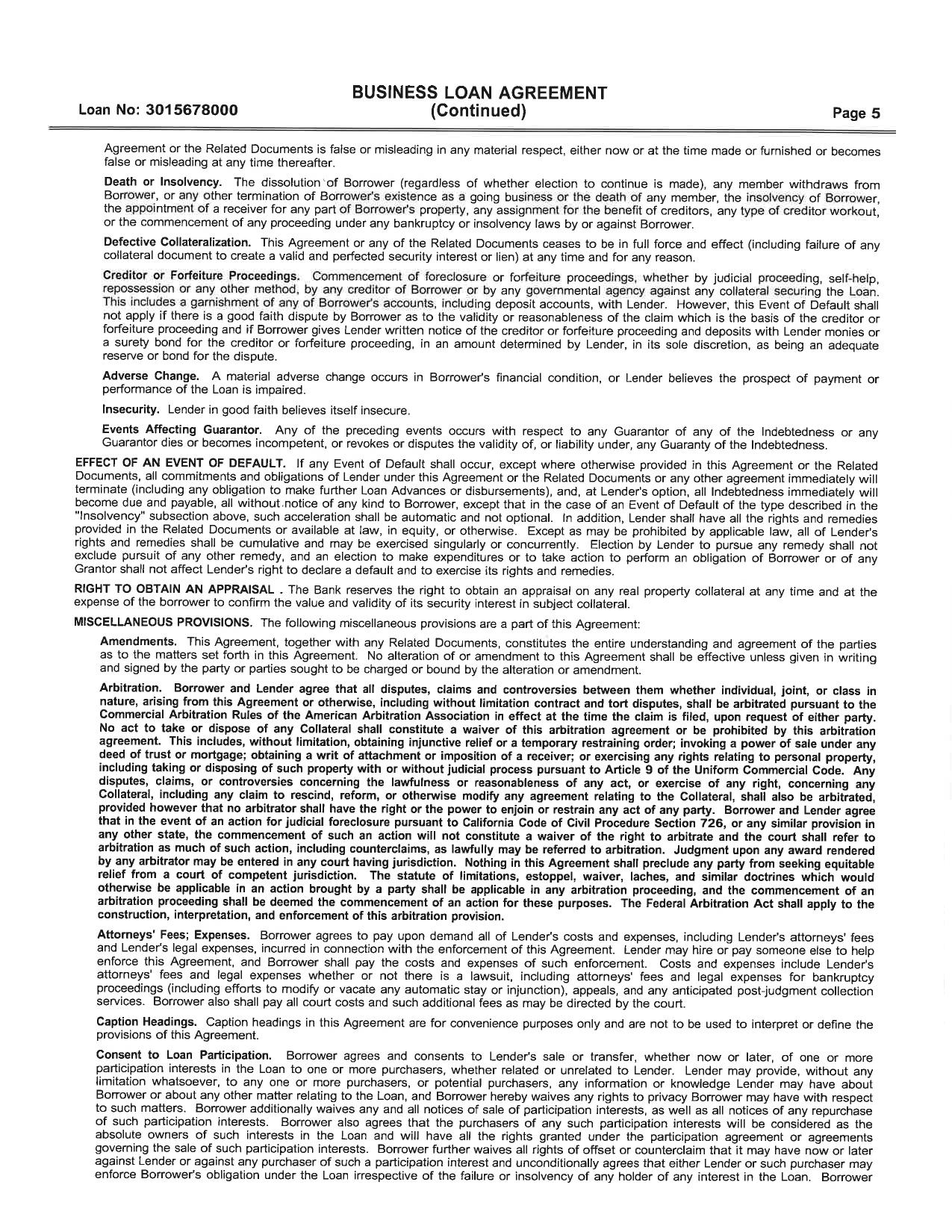 Any warranty, representation or statement made or furnished to Lender by Borrower or on Borrower's behalf under this Loan No: 3015678000 BUSINESS LOAN AGREEMENT (Continued) Page 5 Agreement or the Related Documents is false or misleading in any material respect, either now or at the time made or furnished or becomes false or misleading at any time thereafter . Death or Insolvency . The dissolution of Borrower (regardless of whether election to continue is made), any member withdraws from Borrower, or any other termination of Borrower's existence as a going business or The dealh of any member, the insolvency of Borrower, the appointment of a receiver for any part of Borrower's property, any assignment for the benefit of creditors, any type of creditor workout, or the commencement of any proceeding under any bankruptcy or insolvency laws by or against Borrower . Defective Collateralization . This Agreement or any of the Related Documents ceases to be in full force and effect (including failure of any collateral document to create a valid and perfected security interest or lien) at any time and for any reason . Creditor or Forfeiture Proceedings . Commencement of foreclosure or forfeiture proceedings, whether by judicial proceeding, sel I - help, repossession or any other method, by any creditor of Borrower or by any governmental agency against any collateral securing the Loan . This includes a B amishment of any of Borrowers accounts, including deposit accounts, with Lender . However, this Event of Default shall not apply if there is a good faith dispute by Borrower as to the validity or reasonableness of the claim which is the basis of the creditor or forfeiture proceeding and if Borrower gives Lender written notice of the creditor or forfeiture proceeding and deposits with Lender monies or a surety bond for the creditor or forfeiture proceeding, in an amount determined by Lender, in its sole discretion, as being an adequate reserve or bond for the dispute . Adverse Change. A material adverse change occurs in Borrower's financial condition, or Lender believes the prospect of payment or performance of the Loan is impaired. Insecurity. Lender in good faith believes itself insecure. Events Affecting Guarantor. Any of the preceding events occurs with respect to any Guarantor of any of the Indebtedness or any Guarantor dies or becomes incompetent, or revokes or disputes the validity of, or liability under, any Guaranty of the Indebtedness. EFFECT OF AN EVENT OF DEFAULT . If any Event of Default shall occur, except where otherwise provided in this Agreement or the Related Documents, all commitments and obligations of Lender under this Agreement or the Related Documents or any other agreement immediately will terminate (including any obligation to make further Loan Advances or disbursements), and, at Lender's option, all Indebtedness immediately will become due and payable, all without . notice of any kind to Borrower, except that in the case of an Event of Default of the type described in the "Insolvency" subsection above, such acceleration shall be automatic and not optional . In addition, Lender shall have all the rights and remedies provided in the Related Documents or available at law, in equity, or otherwise . Except as may be prohibited by applicable law, all of Lender's rights and remedies shall be cumulative and may be exercised singularly or concurrently . Election by Lender to pursue any remedy shall not exclude pursuit of any other remedy, and an election to make expenditures or to take action to perform an obligation of Borrower or of any Grantor shall not affect Lender's right to declare a default and to exercise its rights and remedies . RIGHT TO OBTAIN AN APPRAISAL . The Bank reserves the right to obtain an appraisal on any real property collateral at any time and at the expense of the borrower to confirm the value and validity of its security interest in subject collateral . MISCELLANEOUS PROVISIONS . The following miscellaneous provisions are a part of this Agreement : Amendments . This Agreement, together with any Related Documents, constitutes the entire understanding and agreement of the parties as to the matters set forth in this Agreement . No alteration of or amendment to this Agreement shall be effective unless given in writing and signed by the party or parties sought to be charged or bound by the alteration or amendment . Arbitration . Borrower and Lender agree that all disputes, claims and controversies between them whether individual, joint, or class in nature, arising from this Agreement or otherwise, including without limitation contract and tort disputes, shall be arbitrated pursuant to the Commercial Arbitration Rules of the American Arbitration Association in effect at the time the claim is filed, upon request of either party . No act to take or dispose of any Collateral shall constitute a waiver of this arbitration agreement or be prohibited by this arbitration agreement . This includes, without limitation, obtaining injunctive relief or a temporary restraining order ; invoking a power of sale under any deed of trust or mortgage ; obtaining a writ of attachment or imposition of a receiver ; or exercising any rights relating to personal property, including taking or disposing of such property with or without judicial process pursuant to Article 9 of the Uniform Commercial Code . Any disputes, claims, or controversies concerning the lawfulness or reasonableness of any act, or exercise of any right, concerning any Collateral, including any claim to rescind, reform, or otherwise modify any agreement relating to the Collateral, shall also be arbitrated, provided however that no arbitrator shall have the right or the power to enjoin or restrain any act of any party . Borrower and Lender agree that in the event of an action for judicial foreclosure pursuant to California Code of Civil Procedure Section 726 , or any similar provision in any other state, the commencemen