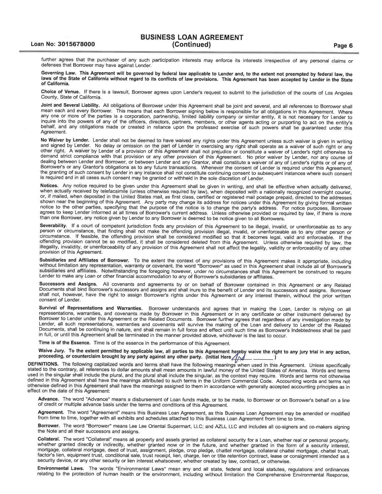 Borrower Loan No: 3015678000 BUSINESS LOAN AGREEMENT (Continued) Page 6 further agrees that the purchaser of any such participation interests may enforce its interests irrespective of any personal claims or defenses that Borrower may have against Lender . Governing Law . This Agreement will be governed by federal law applicable to Lender and, to the extent not preempted by federal law, the laws of the State of California without regard to its conflicts of law provisions . This Agreement has been accepted by Lender in the State of California . Choice of Venue . If there is a lawsuit, Borrower agrees upon Lender's request to submit to the jurisdiction of the courts of Los Angeles County, State of California . Joint and Several Liability . All obligations of Borrower under this Agreement shall be joint and several, and all references to Borrower shall mean each and every Borrower . This means that each Borrower signing below is responsible for all obligations in this Agreement . Where any one or more of the parties is a corporation, partnership, limited liability company or similar entity, it is not necessary for Lender to inquire into the powers of any of the officers, directors, partners, members, or other agents acting or purporting to act on the entity's behalf, and any obligations made or created in reliance upon the professed exercise of such powers shall be guaranteed under this Agreement . No Waiver by Lender . Lender shall not be deemed to have wa’i’vea any rights under this Agreement unless such waiver is given in writing and signed by Lender . No delay or omission on the part of Lender in exercising any right shall operate as a waiver of such right or any other right . A waiver by Lender of a provision of this Agreement shall not prejudice or constitute a waiver of Lender's right otherwise to demand strict compliance with that provision or any other provision of this Agreement . No prior waiver by Lender, nor any course of dealing between Lender and Borrower, or between Lender and any Grantor, shall constitute a waiver of any of Lender's rights or of any of Borrower's or any Grantor's obligations as to any future transactions . Whenever the consent of Lender is required under this Agreement, the granting of such consent by Lender in any instance shall not constitute continuing consent to subsequent instances where such consent is required and in all cases such consent may be granted or withheld in the sole discretion of Lender . Notices . Any notice required to be given under this Agreement shall be given in writing, and shall be effective when actually delivered, when actually received by telefacsimile (unless otherwise required by law), when deposited with a nationally recognized overnight courier, or, if mailed, when deposited in the United States mail, as first class, certified or registered mail postage prepaid, directed to the addresses shown near the beginning of this Agreement . Any party may change its address for notices under this Agreement by giving formal written notice to the other parties, specifying that the purpose of the notice is to change the party's address . For notice purposes, Borrower agrees to keep Lender informed at all times of Borrower's current address . Unless otherwise provided or required by law, if there is more than one Borrower, any notice given by Lender to any Borrower is deemed to be notice given to all Borrowers . Severability . If a court of competent jurisdiction finds any provision of this Agreement to be illegal, invalid, or unenforceable as to any person or circumstance, that finding shall not make the offendin‹j provision illegal, invalid, or unenforceable as to any other person or circumstance . If feasible, the offending provision shall be considered modified so that it becomes legal, valid and enforceable . If the offending provision cannot be so modified, it shall be considered deleted from this Agreement . Unless otherwise required by law, the illegality, invalidity, or unenforceability of any provision of this Agreement shall not affect the legality, validity or enforceability of any other provision of this Agreement . Subsidiaries and Affiliates of Borrower . To the extent the context of any provisions of this Agreement makes it appropriate, including without limitation any representation, warranty or Covenant . the word "Borrower" as used in this Agreement shall include all of Borrower's subsidiaries and affiliates . Notwithstanding the foregoing howevE!r, under no circumstances shall this Agreement be construed to require Lender to make any Loan or other financial accommodation to any of Borrower's subsidiaries or affiliates . Successors and Assigns . All covenants and agreements by or on behalf of Borrower contained in this Agreement or any Related Documents shall bind Borrower's successors and assigns and shall inure to the benefit of Lender and its successors and assigns . Borrower shall not, however, have the right to assign Borrower's rights under this Agreement or any interest therein, without the prior written consent of Lender . Survival of Representations and Warranties . Borrower understands and agrees that in making the Loan, Lender is relying on all representations, warranties, and covenants made by Borrower in this Agreement or in any certificate or other instrument delivered by Borrower to Lender under this Agreement or the Related Documents . Borrower further agrees that regardless of any investigation made by Lender, all such representations, warranties and covenants will survive the making of the Loan and delivery to Lender of the Related Documents, shall be continuing in nature, and shall remain in full force and effect until such time as Borrower's Indebtedness shall be paid in full, or until this Agreement shall be terminated in the manner provided above, whichever is the last to occur . Time is of the Essence . Time is of the essence in the performance of this Agreement . Waive Jury, To the extent p