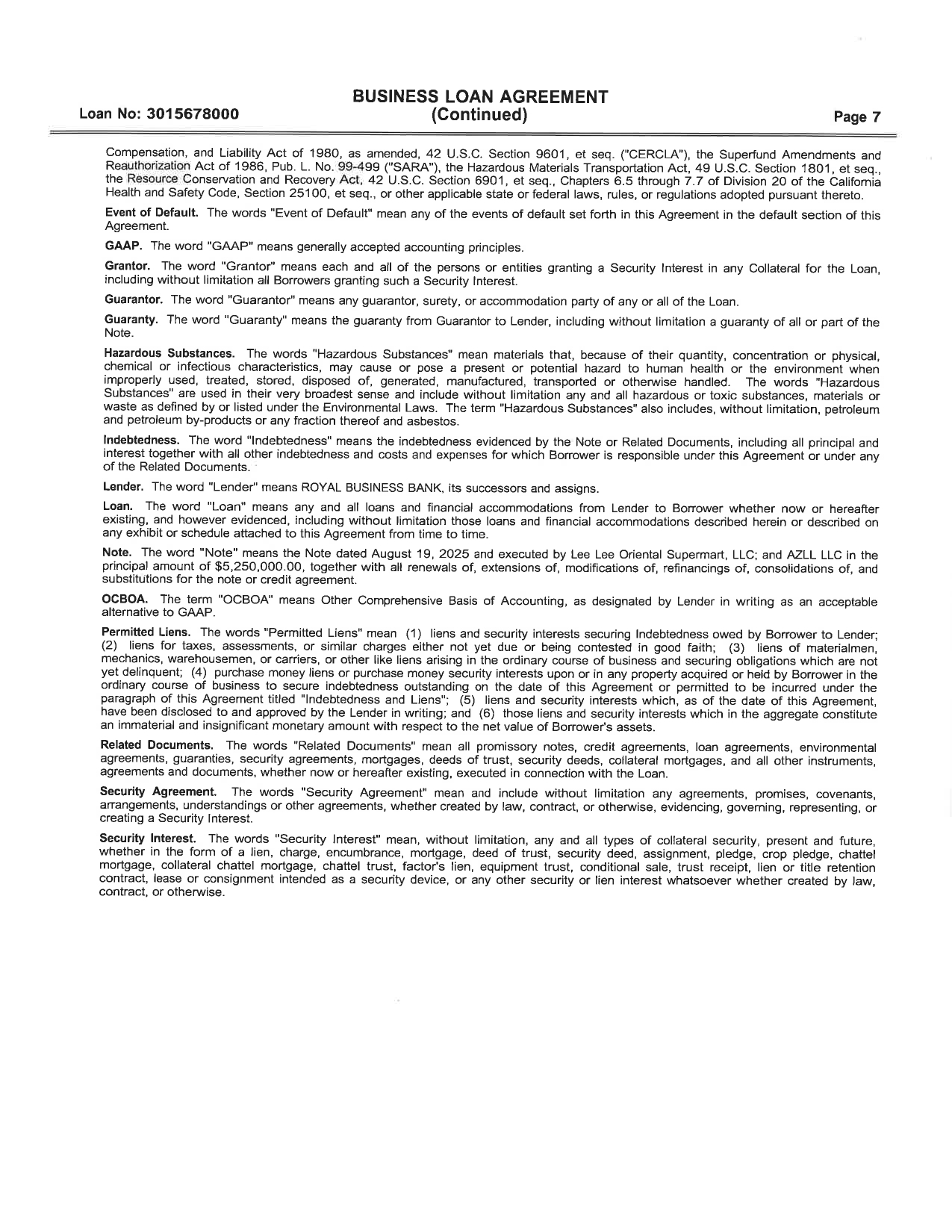 The words "Environmental Laws" mean any and all state, federal and local statutes, regulations and ordinances relating to the protection of human health or the environment, including without limitation the Comprehensive Environmental Response, Loan No: 3015678000 BUSINESS LOAN AGREEMENT (Continued) Page 7 Compensation, and Liability Act of 1980 , as amended, 42 U . S . C . Section 9601 , et seq . ("CERCLA"), the Superfund Amendments and Reauthorlzaton Act of 1986 , Pub . L . No . 99 - 499 ("SARA"), the Hazardous Materials Transportation Act, 49 U . S . C . Section 1801 , et seq . , the ResourCa ConserVation and Recovery Act, 42 U . S . C . Section 6901 , et seq . , Chapters 6 . 5 through 7 . 7 of Division 20 of the California Health and Safety Code, Section 25100 , et seq . , or other applicable state or federal laws, rules, or regulations adopted pursuant thereto . Event of Default . The words "Event of Default" mean any of the events of default set forth in this Agreement in the default section of this Agreement . GAAP . The word "GAAP" means generally accepted accounting principles . Grantor . The word "Grantor" means each and all of the persons or entities granting a Security Interest in any Collateral for the Loan, including without limitation all Borrowers granting such a Security Interest . Guarantor . The word "Guarantor" means any guarantor, surety, or accommodation party of any or all of the Loan . Guaranty . The word "Guaranty" means the guaranty from Guarantor to Lender, including without limitation a guaranty of all or part of the Note . Hazardous Substances . The words "Hazardous Substances" mean materials that, because of their quantity, concentration or physical, chemical or infectious characteristics, may cause or pose a present or potential hazard to human health or the environment when improperly used, treated, stored, disposed of, generated, manufactured, transported or otherwise handled . The words "Hazardous Substances" are used in their very broadest sense and include without limitation any and all hazardous or toxic substances, materials or waste as defined by or listed under the Environmental Laws . The term "Hazardous Substances" also includes, without limitation, petroleum and petroleum by - products or any fraction thereof and asbestos . Indebtedness . The word "Indebtedness" means the indebtedness evidenced by the Note or Related Documents, including all principal and interest together with all other indebtedness and costs and expenses for which Borrower is responsible under this Agreement or under any of the Related Documents . Lender . The word "Lender" means ROYAL BUSINESS BANK, its successors and assigns . Loan . The word "Loan" means any and all loans and financial accommodations from Lender to Borrower whether now or hereafter existing, and however evidenced, including without limitation those loans and financial accommodations described herein or described on any exhibit or schedule attached to this Agreement from time to time . Note . The word "Note" means the Note dated August 19 , 2025 and executed by Lee Lee Oriental Supermart, LLC ; and AZLL LLC in the principal amount of $ 5 , 250 , 000 . 00 , together with all renewals of, extensions of, modifications of, refinancings of, consolidations of, and substitutions for the note or credit agreement . OCBOA . The term "OCBOA" means Other Comprehensive Basis of Accounting, as designated by Lender in writing as an acceptable alternative to GAAP . Permitted Liens . The words "Permitted Liens" mean ( 1 ) liens and security interests securing Indebtedness owed by Borrower to Lender ; ( 2 ) liens for taxes, assessments, or similar charges either not yet due or being contested in good faith ; ( 3 ) liens of materialmen, mechanics, warehousemen, or carriers, or other like liens arising in the ordinary course of business and securing obligations which are not yet delinquent ; ( 4 ) purchase money liens or purchase money security interests upon or in any property acquired or held by Borrower in the ordinary course of business to secure indebtedness outstanding on the date of this Agreement or permitted to be incurred under the paragraph of this Agreement titled "Indebtedness and Liens" ; ( 5 ) liens and security interests which, as of the date of this Agreement, have been disclosed to and approved by the Lender in writing ; and ( 6 ) those liens and security interests which in the aggregate constitute an immaterial and insignificant monetary amount with respect to the net value of Borrower's assets . Related Documents . The words "Related Documents" mean all promissory notes, credit agreements, loan agreements, environmental agreements, guaranties, security agreements, mortgages, deeds of trust, security deeds, collateral mortgages, and all other instruments, agreements and documents, whether now or hereafter existing, executed in connection with the Loan . Security Agreement . The words "Security Agreement" mean and include without limitation any agreements, promises, covenants, arrangements, understandings or other agreements, whether created by law, contract, or otherwise, evidencing, governing, representing, or creating a Security Interest . Security Interest . The words "Security Interest" mean, without limitation, any and all types of collateral security, present and future, whether in the form of a lien, charge, encumbrance, mortgage, deed of trust, security deed, assignment, pledge, crop pledge, chattel mortgage, collateral chattel mortgage, chattel trust, factor's lien, equipment trust, conditional sale, trust receipt, lien or title retention contract, lease or consignment intended as a security device, or any other security or lien interest whatsoever whether created by law, contract, or otherwise .