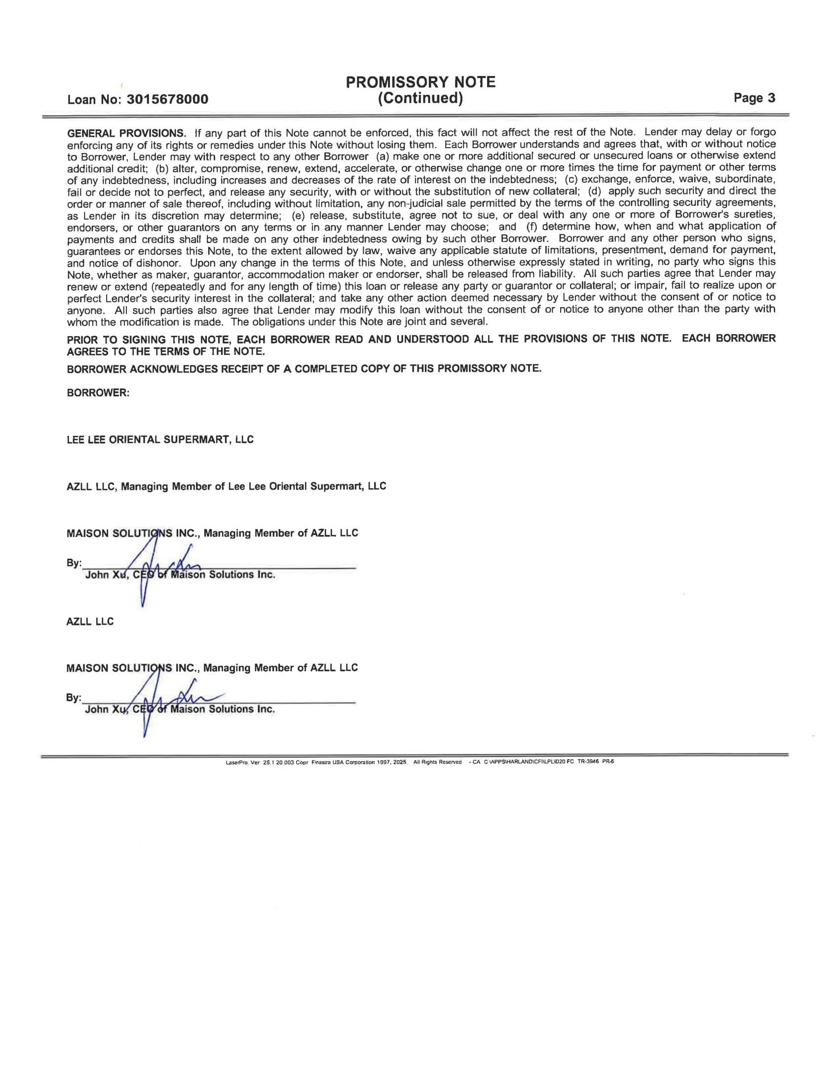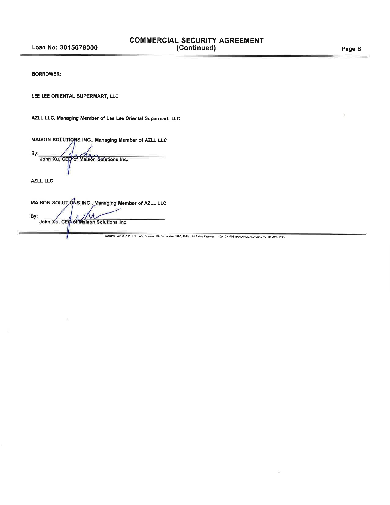 Loan No: 3015678000 BORROWER: LEE LEE ORIENTAL SUPERMART, LLC AZLL LLC, Managing Member of Lee Lee Oriental Superman, LLC COMMERCIAL SECURITY AGREEMENT (Continued) MAISON SOLUTI S INC., Managing Member of AZLL LLC By: John Xu, C o Maison utions inc. AZLL LLC MAISON SOLUT. S INC., Managing Member of AZLL LLC John X aison Solutions Inc. Page 8