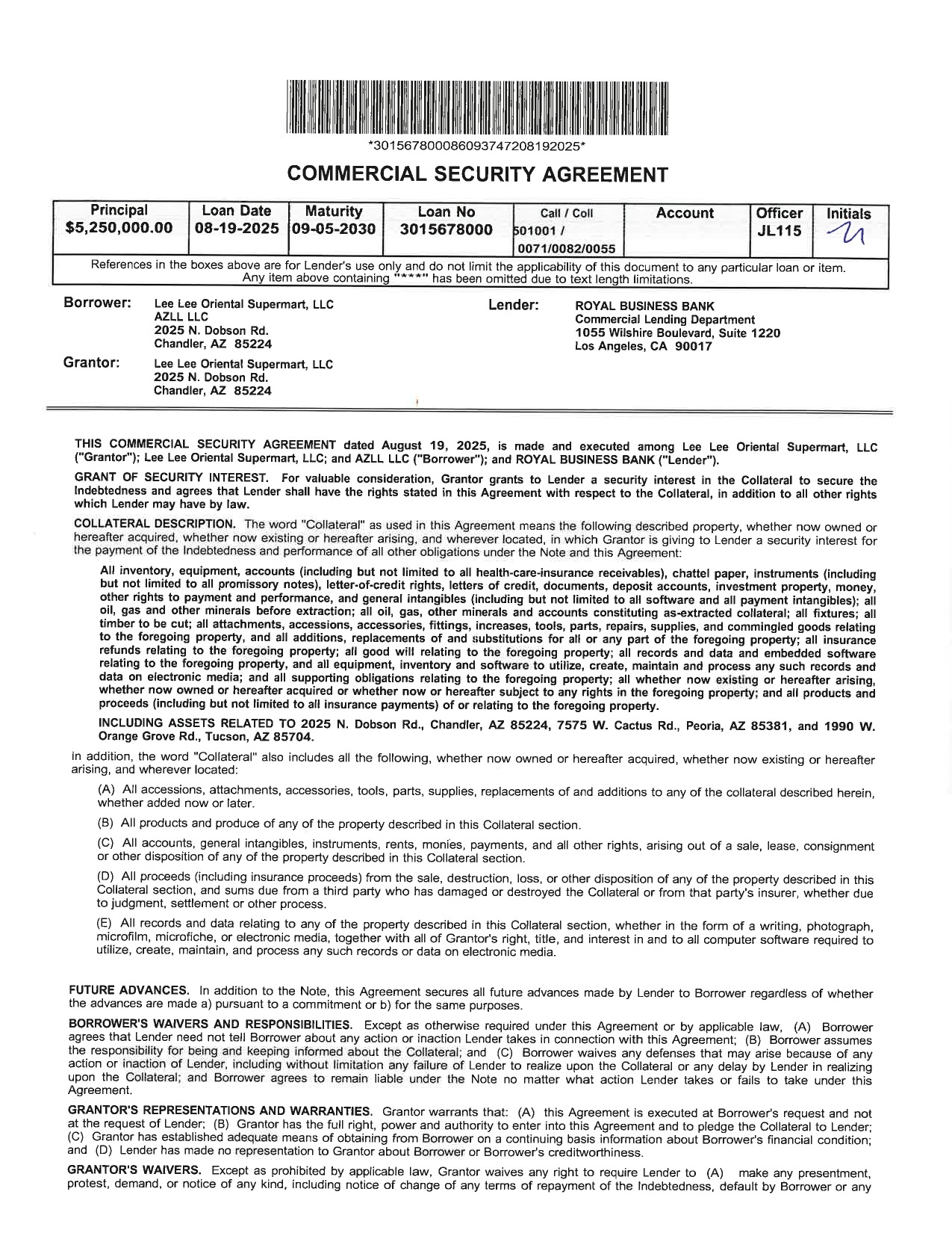 Any item above containing "”””" has been omitted due to text length limitations. *30156780008609374T208192025* COMMERCIAL SECURITY AGREEMENT Borrower: Grantor: Lee Lee Oriental Supermart, LLC AZLL LLC 2025 N. Dobson Rd. Chandler, AZ 85224 Lee Lee Oriental Supermart, LLC 2025 N. Dobson Rd. Chandler, AZ 85224 Lender: ROYAL BUSINESS BANK Commercial Lending Department 1055 Wilshire Boulevard, Suite 1220 Los Angeles, CA 90017 THIS COMMERCIAL SECURITY AGREEMENT dated August 19, 2025, is made and executed among Lee Lee Oriental Supermart, LLC ("Grantor") ; Lee Lee Oriental Supermart, LLC ; and AZLL LLC ("Borrower") ; and ROYAL BUSINESS BANK ("Lender") . GRANT OF SECURITY INTEREST . For valuable consideration, Grantor grants to Lender a security interest in the Collateral to secure the Indebtedness and agrees that Lender shall have the rights stated in this Agreement with respect to the Collateral, in addition to all other rights which Lender may have by law . COLLATERAL DESCRlPTiON . The word "Collateral" as used in this Agreement means ihe following described property, whether now owned or hereafter acquired, yvhelher now existing or hereaRer arising, and wherever located, in which Grantor is giving to Lender a security interest for the payment of the Indebtedness and performance of all other obligations under the Note and this Agreement : All inventory, equipment, accounts (including but not limited to all health - care - insurance receivables), chattel paper, instruments (including but not limited to all promissory notes), letter - of - credit rights, letters of credit, documents, deposit accounts, investment property, money, other rights to payment and performance, and general intangibles (including but not limited to all software and all payment intangibles) ; all oil, gas and other minerals before extraction ; all oil, gas, other minerals and accounts constituting as - extracted collateral ; all fixtures ; all timber to be cut ; all attachments, accessions, accessories, fittings, increases, tools, parts, repairs, supplies, and commingled goods relating to the foregoing property, and all additions, replacements of and • iubstitutions for all or any part of the foregoing property ; all insurance refunds relating to the foregoing property ; all good will relating to tha foregoing property ; all records and data and embedded software relating to the foregoing property, and all equipment, inventory and software to utilize, create, maintain and process any such records and data on electronic media ; and all supporting obligations relating to the foregoing property ; all whether now exlstfng or hereafter arising, whether now owned or hereafter acquired or whether now or hereafter subject to any rights in the foregoing property : and all products and proceeds (including but not limited to all insurance payments) of or relating to the foregoing property . INCLUDING ASSETS RELATED TO 2025 N. Dobson Rd., Chandler, AZ 85224, 7575 W. Cactus Rd., Peoria, AZ 85381, and 1990 W. Orange Grove Rd . , Tucson, AZ 85704 . In addition, the word "Collateral" also includes all the following, whether now owned or hereafter acquired, whether now existing or hereafter arising, and wherever located : (A) All accessions, attachments, accessories, tools, parts, supplies, replacements of and additions to any of the collateral described herein, whether added now or later. (B) All products and produce of any of the property described in this Collateral section. (C) All accounts, general intangibles, instruments, rents, monies, payments, and all other rights, arising out of a sale, lease, consignment or other disposition of any of the property described in this Collateral section. (D) All proceeds (including insurance proceeds) from the sale, destruction, loss, or other disposition of any of the property described in this Collateral section, and sums due from a third party who has damaged or destroyed the Collateral or from that party's insurer, whether due to judgment, settlement or other process . (E) All records and data relating to any of the property described in this Collateral section, whether in the form of a writing, photograph, microfilm, microfiche, or electronic media, together with all of Grantor's right, title, and interest in and to all computer software required to utilize, create, maintain, and process any such records or data on electronic media . FUTURE ADVANCES . In addition to the Note, this Agreement secures all future advances made by Lender to Borrower regardless of whether the advances are made a) pursuant to a commitment or b) for the same purposes . BORROWER'S WAIVERS AND RESPONSIBILITIES . Except as otherwise required under this Agreement or by applicable law, (A) Borrower agrees that Lender need not tell Borrower about any action or inaction Lender takes in connection with this Agreement ; (B) Borrower assumes the responsibility for being and keeping informed about the Collateral ; and (C) Borrower waives any defenses that may arise because of any action or inaction of Lender, including withou! limitation any failure of Lender to realize upon the Collateral or any delay by Lender in realizing upon the Collateral ; and Borrower agrees to remain liable under the Note no matter what action Lender takes or fails to take under this Agreement . GRANTOR'S REPRESENTATIONS AND WARRANTIES . Grantor warrants that : (A) this Agreement is executed at Borrower's request and not at the request of Lender ; (B) Grantor has the full right, power and authority to enter into this Agreement and to pledge the Collateral to Lender ; (C) Grantor has established adequate means of obtaining from Borrower on a continuing basis information about Borrower's financial condition; and (D) Lender has made no representation to Grantor about Borrower or Borrower's creditworthiness. GRANTOR'S WAIVERS .
