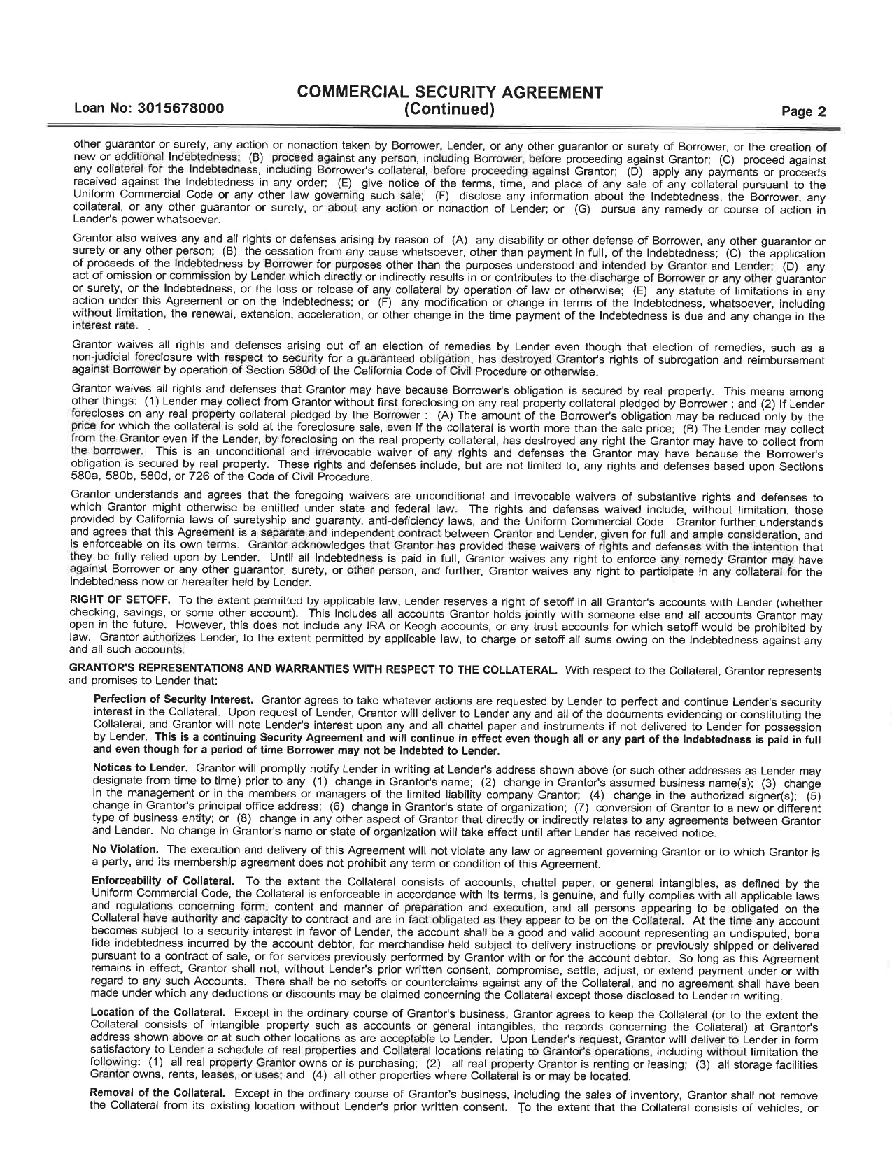 Except as prohibited by applicable law, Grantor waives any right to require Lender to (A) make any presentment, protest, demand, or notice of any kind, including notice of change of any terms of repayment of the Indebtedness, default by Borrower or any Loan No: 3015678000 COMMERCIAL SECURITY AGREEMENT (Continued) Page 2 other guarantor or surety, any action or nonaction taken by Borrower, Lender, or any other guarantor or surety of Borrower, or the creation of new or additional Indebtedness ; (B) proceed against any person, including Borrower . bafore proceeding against Grantor ; (C) proceed against any collateral for the Indebtedness, including Borrower's collateral, before proceeding against Grantor ; (D) apply any payments or proceeds received against the indebtedness in any order ; (E) give notice of the terms, time, and place of any sale of any collateral pursuant to the Uniform Commercial Code or any other law governing such sale ; (F) disclose any information about the Indebtedness, the Borrower, any collateral, or any other guarantor or surety, or about any action or nc›naction of Lender ; or (G) pursue any remedy or course of action in Lender's power whatsoever . Grantor also waives any and all rights or defenses arising by reason of (A) any disability or other defense of Borrower, any other guarantor or surety or any other person ; (B) the cessation from any cause whatsoever, other than payment in full, of the Indebtedness ; (C) the application of proceeds of the Indebtedness by Borrower for purposes other than the purposes understood and intended by Grantor and Lender ; (D) any act of omission or commission by Lender which directly or indirectly results in or contributes to the discharge of Borrower or any Other guarantor or surety, or the Indebtedness, or the loss or release of any collateral by operation of law or otherwise ; (E) any statute of limitations in any action under this Agreement or on the Indebtedness ; or (F) any modification or change in terms of the Indebtedness, whatsoever, including without limitation, the renewal, extension, acceleration, or other change in the time payment of the Indebtedness is due and any change in the interest ra \ e . Grantor waives all rights and defenses arising out of an election of remedies by Lender even though that election of remedies, such as a non - judicial foreclosure with respect to security for a guaranteed obligation, has destroyed Grantor's rights of subrogation and reimbursement against Borrower by operation of Section 5 B 0 d of the California Code of Civil Procedure or otherwise . Grantor waives all rights and defenses that Grantor may have because Borrower's obligation is secured by real property . This means among other things : ( 1 ) Lender may collect from Grantor without first foreclosing on any real property collateral pledged by Borrower ; and ( 2 ) If Lender forecloses on any real property collateral pledged by the Bonower : (A) The amount of the Borrower's obligation may be reduced only by the price for which the collateral is sold at the foreclosure sale, even if the ‹bilateral is worth more than the sale price ; (B) The Lender may collect from the Grantor even if the Lender, by foreclosing on the real property collateral, has destroyed any right the Grantor may have to collect from lhe borrower . This is an unconditional and irrevocable waiver of an'y rights and defenses the Grantor may have because the Borrower's obligation is secured by real property . These rights and defenses include, but are not limited to, any rights and defenses based upon Sections 580 a, 580 b, 580 d, or T 26 of the Code of Civil Procedure . Grantor understands and agrees that the foregoing waivers are unconditional and irrevocable waivers of substantive rights and defenses to which Grantor might otherwise be entitled under state and federal law . The rights and defenses waived include, without limitation, those provided by California laws of suretyship and guaranty, anti - deficiency laws, and the Uniform Commercial Code . Grantor further understands and agrees that this Agreement is a separate and independent contract between Grantor and Lender, given for full and amplo considera \ Ion, and is enforceable on its own terms . Grantor acknowledges that Grantor has provided (hese waivers of rights and defenses with lhe intention that they be fully relied upon by Lender . Until all Indebtedness is paid in full, Grantor waives any right to enforce any remedy Grantor may have against Borrower or any other guarantor, surety, or other person, and further, Grantor waives any right to participate in any collateral for the Indebtedness now or hereafter held by Lender . RIGHT OF SETOFF . To the extent permitted by applicable law, Lender reserves a right of setoff in all Grantor's accounts with Lender (whether checking, savings, or some other account) . This includes all accounts Grantor holds jointly with someone else and all accounts Grantor may open in the future . However, this does not include any IRA or Keogh accounts, or any trust accounts for which setoff would be prohibited by law . Grantor authorizes Lender, to the extent permitted by applicable law, to charge or setoff all sums owing on the Indebtedness against any and all such accounts . GRANTOR'S REPRESENTATIONS AND WARRANTIES WITH RESPECT TO THE COLLATERAL . With respect to the Collateral, Grantor represents and promises to Lender that : Perfection of Security Interest . Grantor agrees to take whatever actions are requested by Lender to perfect and continue Lender's security interest in the Collateral . Upon request of Lender, Grantor will deliver to Lender any and all of the documents evidencing or constituting the Collateral, and Grantor will note Lender's interest upon any and all chattel paper and instruments if not delivered to Lender for possession by Lender . This is a continuing Security Agreement and will continue in effect even though all or any part of the Indebtedn