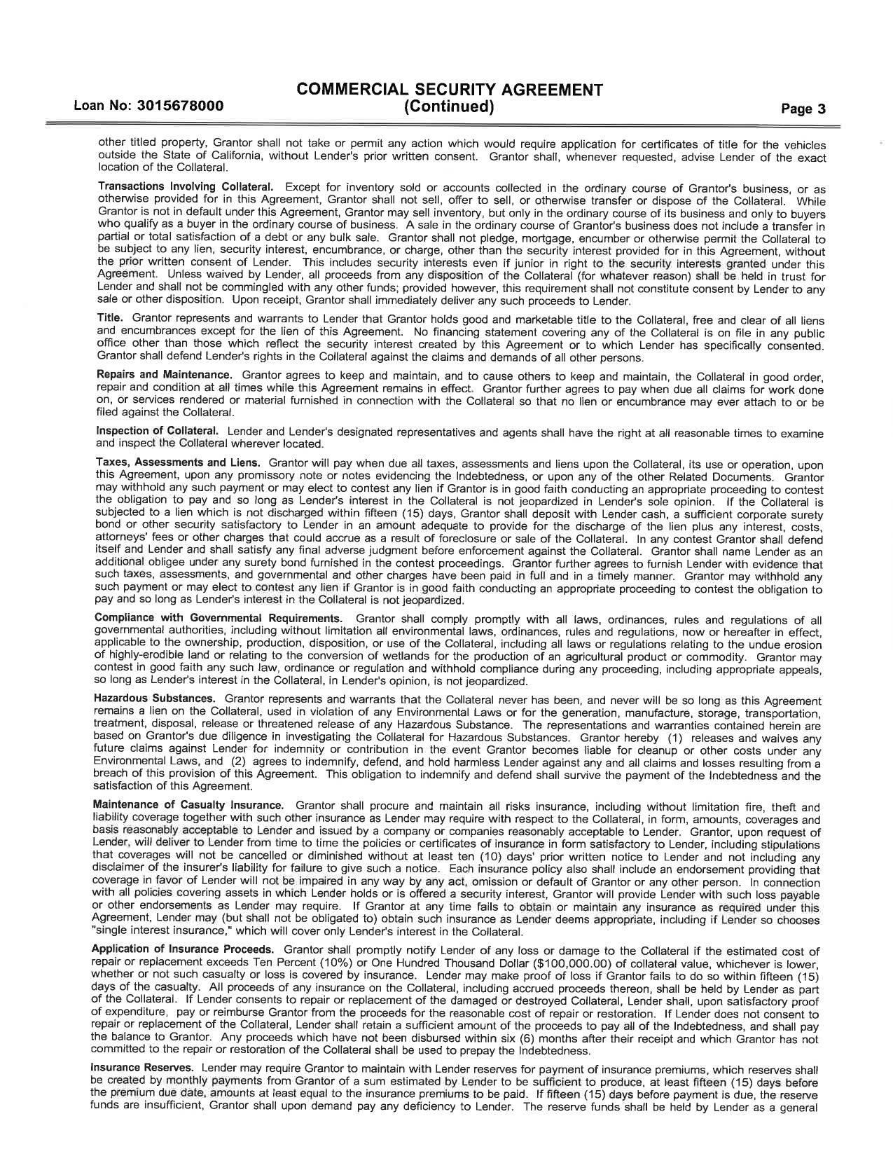 To the extent that the Collateral consists of vehicles, or Loan No: 3015678000 COMMERCIAL SECURITY AGREEMENT (Continued) Page 3 other titled property, Grantor shall not take or permit any action which would require application for certificates of title for the vehicles outside the State of California, without Lender's prior written consent . Grantor shall, whenever requested, advise Lender of the exact location of the Collateral . Transactions Involving Collateral . Except for inventory sold or accounts collected in the ordinary course of Grantor's business, or as otherwise provided for in this Agreement, Grantor shall not sell, offer to sell, or otherwise transfer or dispose of the Collateral . While Grantor is not in default under this Agreement, Grantor may sell inventory, but only in the ordinary course of its business and only to buyers who qualify as a buyer in the ordinary course of business . A sale in the ordinary course of Grantor's business does not include a transfer in partial or total satisfaction of a debt or any bulk sale . Grantor shall not pledge, mortgage, encumber or otherwise permit the Collateral to be subject to any lien, security interest, encumbrance, or charge, other than the security interest provided for in this Agreement, without the prior written consent of Lender . This includes security interests even if junior in right to tf \ e security interests granted under this Agreement . Unless waived by Lender, all proceeds from any disposition of the Collateral (for whatever reason) shall be held in trust for Lender and shall not be commingled with any other funds ; provided however, this requirement shall not constitute consent by Lender to any sale or other disposition . Upon receipt, Grantor shall immediately deliver any such proceeds to Lender . Title . Grantor represents and warrants to Lender that Grantor holds good and marketable title to the Collateral, free and clear of all liens and encumbrances except for the lien of this Agreement . No financing statement covering any of the Collateral is on file in any public office other than those which reflect the security interest created by this Agreement or to which Lender has specifically consented . Grantor shall defend Lender's rights in the Collateral against the claims and demands of all other persons . Repairs and Maintenance . Grantor agrees to keep and maintain, and to cause others to keep and maintain, the Collateral in good order, repair and condition at all times while this Agreement remains in effect . Grantor further agrees to pay when due all claims for work done on, or services rendered or material furnished in connection with the Collateral so that no lien or encumbrance may ever attach to or be filed against the Collateral . Inspection of Collateral . Lender and Lender's designated representatives and agents shall have the right at all reasonable times to examine and inspect Cha Collateral wherever located . Taxes, Assessments and Liens . Grantor will pay when due all taxes, assessments and liens upon the Collateral, its use or operation, upon this Agreement, upon any promissory note or notes evidencing the Indebtedness, or upon any of the other Related Documents . Grantor may withhold any such payment or may elect to contest any lien if Grantor is in good faith conducting an appropriate proceeding to contest the obligation to pay and so long as Lender's interest in the Collateral is not jeopardized in Lender's sole opinion . If the Collateral is subjected to a lien which is not discharged within fifteen ( 15 ) days, Grantor shall deposit with Lender cash, a sufficient corporate surety bond or other security satisfactory to Lender in an amount adequElte to provide for the discharge of the lien plus any interest, costs, attorneys' fees or other charges that could accrue as a result of foreclosure or sale of the Collateral . In any contest Grantor shall defend itself and Lender and shall satisfy any final adverse judgment before enforcement against the Collateral . Grantor shall name Lender as an additional obligee under any surety bond furnished in the contest proceedings . Grantor further agraes to furnish Lender with evidena that suCh IaXes, assessments, and governmental and other charges have been paid Tn full and in a timely manner . Grantor may withhold any such payment or may elect to contest any llan if Grantor is in good faith conducting an appropriate proceeding to contest the obligation to pay and so long as Lender's interact in the Collateral is not jeopaf€lized . Compliance with Governmental Requirements . Grantor shall comply promptly with all laws, ordinances, rules and regulations of all governmental authorities, including without limitation all environmental laws, ordinances, rules and regulations, now or hereafter in effect, applicable to the ownership, production, disposition, or use of the Collateral, including all laws or regulations relating to the undue erosion of highly - erodible land or relating to the conversion of wetlands for the production of an agricultural product or commodity . Grantor may contest in good faith any such law, ordinance or regulation and withhold compliance during any proceeding, including appropriate appeals, so long as Lender's interest in the Collateral, in Lender's opinion, is not jeopardized . Hazardous Substances . Grantor represents and warrants that the Collateral never has been, and never will be so long as this Agreement remains a lien on the Collateral, used in violation of any Environmental Laws or for the generation, manufacture, storage, transportation, treatment, disposal, release or threatened release of any Hazardous Substance . The representations and warranties contained herein are based on Grantor's due diligence in investigating the Collateral for Hazardous Substances . Grantor hereby ( 1 ) releases and waives any future claims against Lender for indemnity or contribution in the event Grantor becomes liable for cleanup or othe