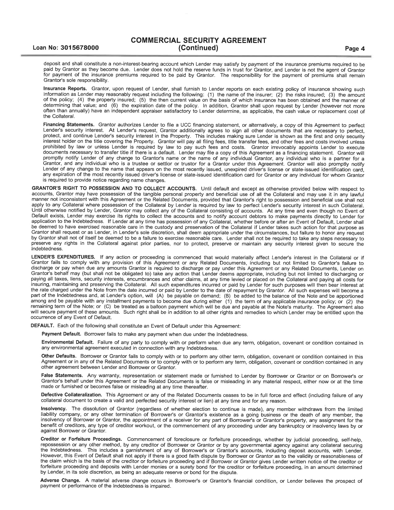The reserve funds shall be held by Lender as a general Loan No: 3015678000 COMMERCIAL SECURITY AGREEMENT (Continued) Page 4 deposit and shall constitute a non - interest - bearing acdount which Lender may satisfy by payment of the insurance premiums required to be paid by Grantor as they become due . Lender does not hold the reserve funds in trust for Grantor, and Lender is not the agent of Grantor for payment of the insurance premiums required to be paid by Grantor . The responsibility for the payment of premiums shall remain Grantor's sole responsibility . Insurance Reports . Grantor, upon request of Lender, shall furnish to Lender reports on each existing policy of insurance showing such information as Lender may reasonably request including the following : ( 1 ) the name of the insurer ; ( 2 ) the risks insured ; ( 3 ) the amount of the policy ; ( 4 ) the property insured ; ( 5 ) the then current value on the basis of which insurance has been obtained and the manner of determining that value ; and ( 6 ) the expiration date of the policy . In addition, Grantor shall upon request by Lender (however not more often than annually) have an independent appraiser satisfactory to Lender determine, as applicable, the cash value or replacement cost of the Collateral . Financing Statements . Grantor authorizes Lender to file a UCC financing statement, or alternatively . a copy of this Agreement to perfect Lender's security interest . At Lender's request, Grantor additionally agrees to sign all other documents that are necessary to perfect, protect, and continue Lender's security interest in the Property . This includes making sure Lender is shown as the first and only security interest holder on the title covering the Property . Grantor will pay all filing fees, title transfer fees, and other fees and costs involved unless prohibited by law or unless Lender is required by law to pay such fees and costs . Grantor irrevocably appoints Lender to execute documents necessary to transfer title if there is a default . Lender may file a copy of this Agreement as a financing statement . Grantor will promptly notify Lender of any change to Grantor's name or the name of any individual Grantor, any individual who is a partner for a Grantor, and any individual who is a trustee or settlor or trustor for a Grantor under this Agreement . Grantor will also promptly notify Lender of any change to the name that appears on the most recently issued, unexpired driver's license or state - issued identification card, any expiration of the most recently issued driver's license or state - issued identification card for Grantor or any individual for whom Grantor is required to provide notice regarding name changes . GRANTOR'S RIGHT TO POSSESSION AND TO COLLECT ACCOUNTS . Until default and except as otherwise provided below with respect to accounts, Grantor may have possession of the tangible personal property and beneficial use of all the Collateral and may use it in any lawful manner not inconsistent with this Agreement or the Related Documents, provided that Grantor's right to possession and beneficial use shall not apply to any Collateral where possession of the Collateral by Lender is required by law to perfect Lender's security interest in such Collateral . Until otherwise notified by Lender, Grantor may collect any of the Collateral consisting of accounts . At any time and even though no Event of Default exists, Lender may exercise its rights to collect the accounts and to notify account debtors to make payments directly to Lender for application to the Indebtedness . If Lender at any time has possession of any Collateral, whether before or after an Event of Default, Lender shall be deemed to have exercised reasonable care in the custody and preservation of the Collateral if Lender takes such action for that purpose as Grantor shall request or as Lender, in Lender's sole discretion, shall deem appropriate under the circumstances, but failure to honor any request by Grantor shall not of itself be deemed to be a failure to exercise reasonable care . Lender shall not be required to take any steps necessary to preserve any rights in the Collateral against prior parties, nor to protect, preserve or maintain any security interest given to secure the Indebtedness . LENDER'S EXPENDITURES . If any action or proceeding is commenced that would materially affect Lender's interest in the Collateral or if Grantor fails to comply with any provision of this Agreement or any Related Documents, including but not limited to Grantor's failure to discharge or pay when due any amounts Grantor is required to discharge or pay under this Agreement or any Related Documents, Lender on Grantor's behalf may (but shall not be obligated to) take any action that Lender deems appropriate, including but not limited to discharging or paying all taxes, liens, security interests, encumbrances and other claims, at any time levied or placed on the Collateral and paying all costs for insuring, maintaining and preserving the Collateral . All such expenditures incurred or paid by Lender for such purposes will then bear interest at the rate charged under the Note from the date incurred or paid by Lender to the date of repayment by Grantor . All such expenses will become a part of the Indebtedness and, at Lender's option, will (A) be payable on demand ; (B) be added to the balance of the Note and be apportioned among and be payable with any installment payments to become due during either ( 1 ) the term of any applicable insurance policy ; or ( 2 ) the remaining term of the Note ; or (C) be treated as a balloon payment which will be due and payable at the Note's maturity . The Agreement also will secure payment of these amounts . Such right shall be in addition to all other rights and remedies to which Lender may be entitled upon the occurrence of any Event of Default . DEFAULT . Each of the following shall constitute an Event of Default under this Agreement 