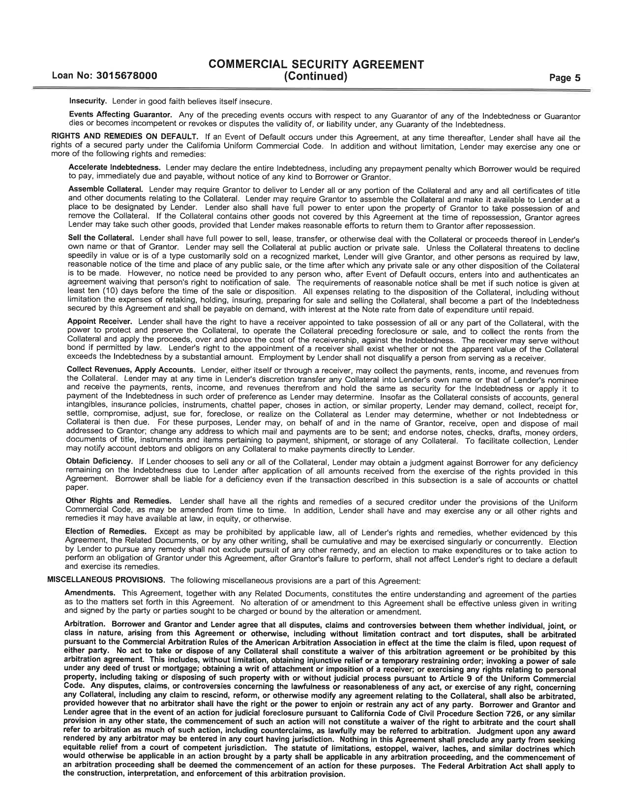 Loan No: 3015678000 COMMERCIAL SECURITY AGREEMENT (Continued) Insecurity . Lender in good faith believes itself insecure . Events Affecting Guarantor . Any of the preceding events occurs with respect to any Guarantor of any of the Indebtedness or Guarantor dies or becomes incompetent or revokes or disputes the validity of, or liability under, any Guaranty of the Indebtedness . RIGHTS AND REMEDIES ON DEFAULT . If an Event of Default occurs under this Agreement, at any time thereafter, Lender shall have all the rights of a secured party under the California Uniform Commercial Code . In addition and without limitation, Lender may exercise any one or more of the following rights and remedies : Accelerate Indebtedness . Lender may declare the entire Indebtedness, including any prepayment penalty which Borrower would be required to pay, immediately due and payable, without notice of any kind to Borrower or Grantor . Assemble Collateral . Lender may require Grantor to deliver to Lender all or any portion of the Collateral and any and all certificates of title and other documents relating to the Collate r al . Lander may require Grantor to assemble the Collateral and make it available to Lender at a place to be designated by Lender . Lender also shall have full power to enter upon the proporty of Grantor to lake possession of and remove the Collateral . If the Collateral contains other goods not covered by this Agreement at the time of repossession, Grantor agrees Lender may take such other goods, provided that Lender makes reasonable efforts to return them to Grantor after repossession . Sell the Collateral . Lender shall have full power to sell, lease, transfer, or otherwise deal with the Collateral or proceeds thereof in Lender's own name or that of Grantor . Lender may sell the Collateral at public auction or private sale . Unless the Collateral threatens to decline speedily in value or is of a type customarily sold on a recognized market, Lender will give Grantor, and other persons as required by law, reasonable notice of the time and place of any public sale, or the time after which any private sale or any other disposition of the Collateral is to be made . However, no notice need be provided to any person who, after Event of Default occurs, enters into and authenticates an agreement waiving that person's right to notification of sale . The requirements of reasonable notice shall be met if such notice is given at least ten ( 10 ) days before the time of the sale or disposition . All expenses relating to the disposition of the Collateral, including without limitation the expenses of retaking, holding, insuring, preparing for sale and selling the Collateral, shall become a part of the Indebtedness secured by this Agreement and shall be payable on demand, with interest at the Note rate from date of expenditure until repaid . Appoint Receiver . Lender shall have the right to have a receiver appointed to take possession of all or any part of the Collateral, with the power to protect and preserve the Collateral, to operate the Collateral preceding foreclosure or sale, and to collect the rents from the Collateral and apply the proceeds, over and above the cost of the receivership, against the Indebtedness . The receiver may serve without bond if permitted by law . Lender's right to the appointment of a receiver shall exist whether or not the apparent value of the Collateral exceeds the Indebtedness by a substantial amount . Employment by Lender shall not disqualify a person from serving as a receiver . Collect Revenues, Apply Accounts . Lender, either itself or through a receiver, may collect the payments, rents, income, and revenues from the Collateral . Lender may at any time in Lender's discretion transfer any Collateral into Lender's own name or that of Lender's nominee and receive the payments, rents, income, and revenues therefrom and hold the same as security for the Indebtedness or apply it to payment of the Indebtedness in such order of preference as Lender may determine . Insofar as the Collateral consists of accounts, general intangibles, insurance policies, instruments, chattel paper, choses in action, or similar property, Lender may demand, collect, receipt for, settle, compromise, adjust, sue for, foreclose, or realize on the Collateral as Lender may determine, whether or not Indebtedness or Collateral is then due . For these purposes, Lender may, on behalf of and in the name of Grantor, receive, open and dispose of mail addressed to Grantor ; change any address to which mail and payments are to be sent ; and endorse noles, checks, drafts, money orders, documents of title, instruments and items pertaining to payment, sh'pmenl, or storage of any Collateral . To facilitate collection, Lender may notify account debtors and obligors on any Collateral to make payments directly to Lender . Obtain Deficiency . If Lender chooses to sell any or all of the Collateral, Lender may obtain a judgment against Borrower for any deficiency remaining on the Indebtedness due to Lender after application of all amounts received from the exercise of the rights provided in this Agreement . Borrower shall be liable for a deficiency even if the transaction described in this subsection is a sale of accounts or chattel paper . Other Rights and Remedies . Lender shall have all the rights and remedies of a secured creditor under the provisions of the Uniform Commercial Code, as may be amended from time to time . In addition, Lender shall have and may exercise any or all other rights and remedies it may have available at law, in equity, or otherwise . Election of Remedies . Excepl as may be prohibited by applicable law, all of Lender's rights and remedies, whether evidenced by this Agreement, the Related documents, or by any other writing, shall be cumulative and may be exercised singularly or concurrently . Election by Lender to pursue any remedy shall not exclude pursuit of any other remedy, and an election to 
